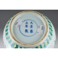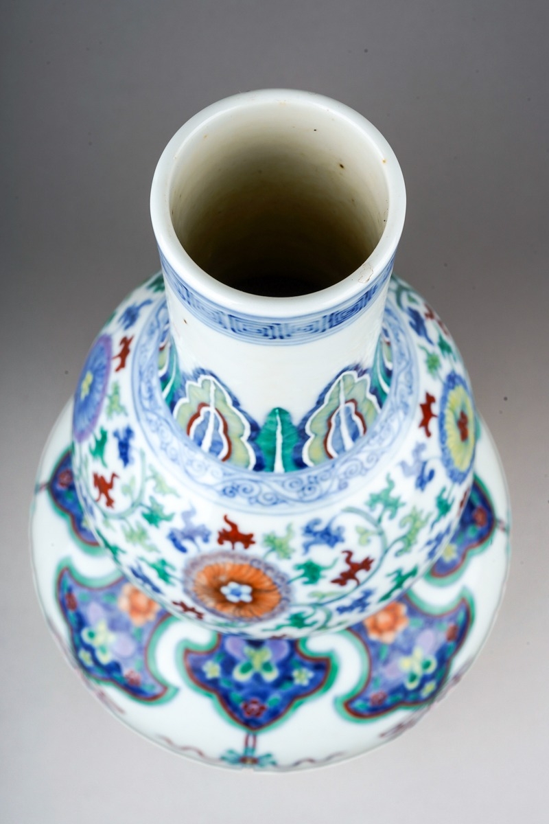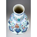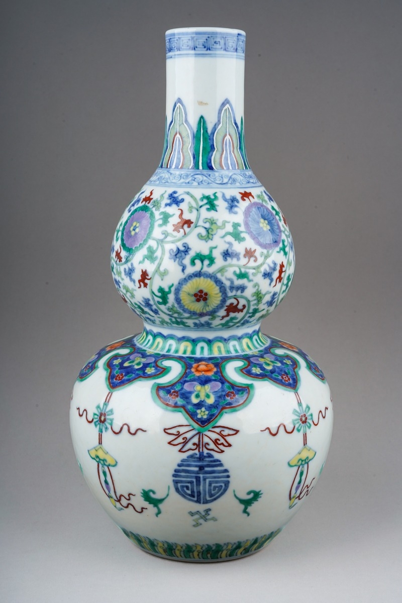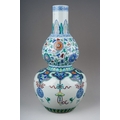 A Chinese Doucai porcelain double gourd vase, decorated with alternating hanging Shou symbols and tassels beneath formal bands and borders, bears underglaze blue six character mark within concentric circles, height 33cm