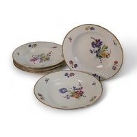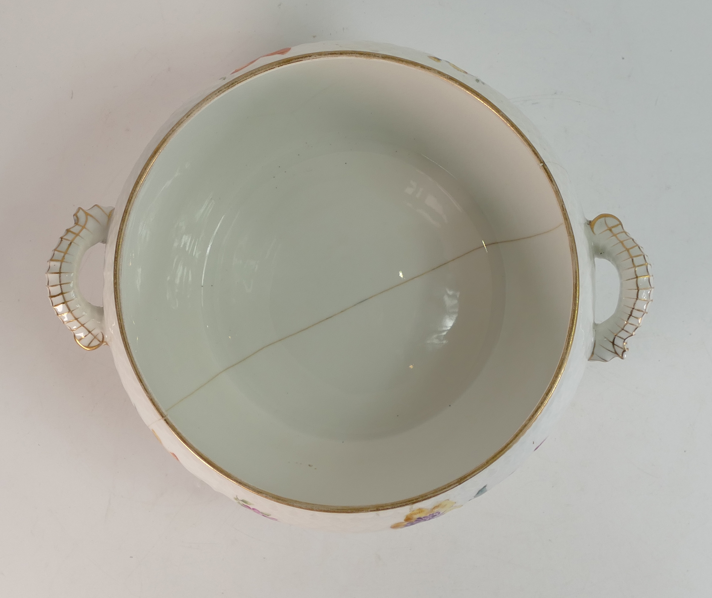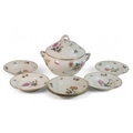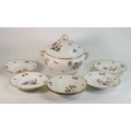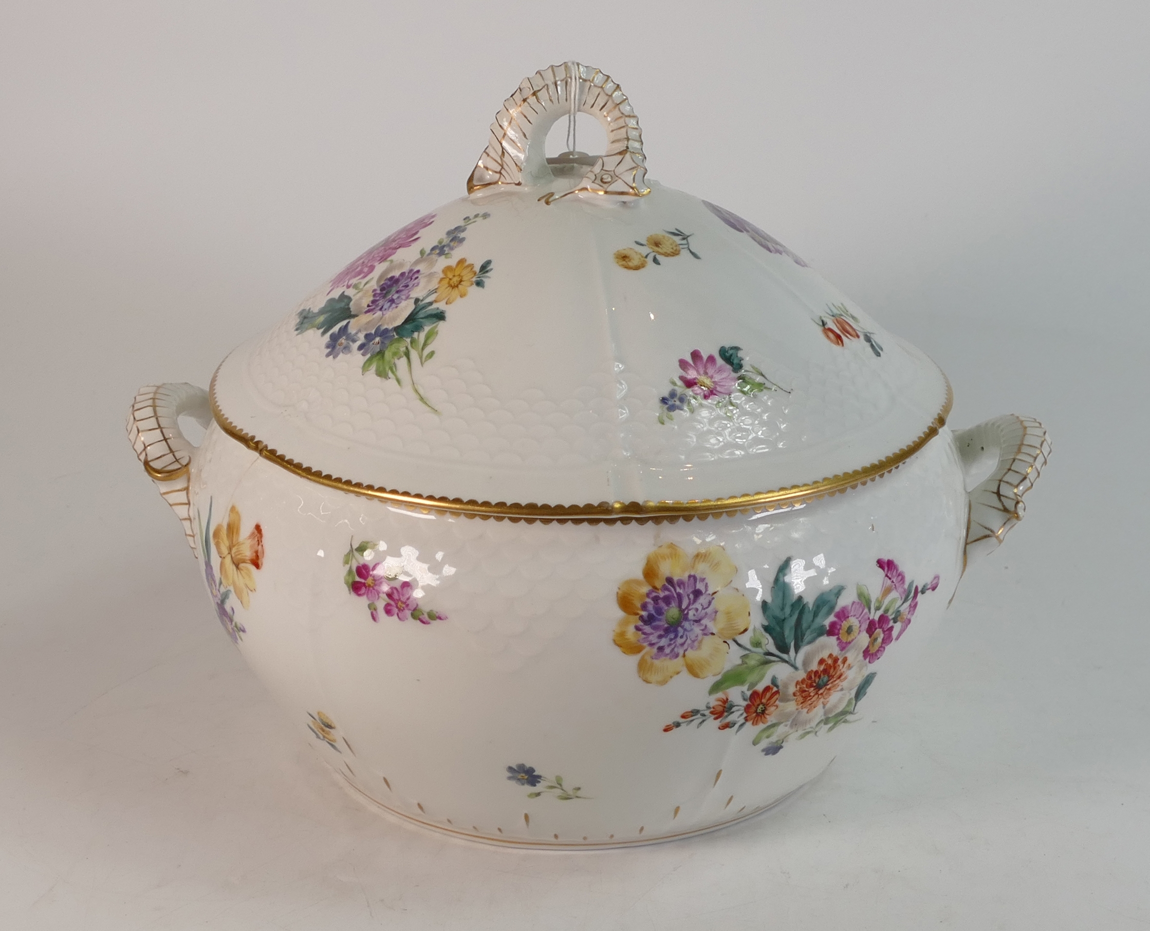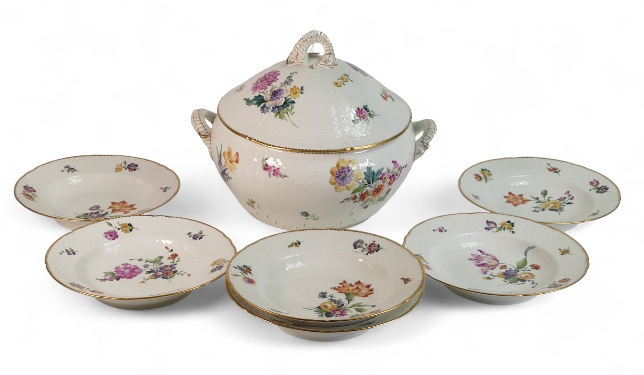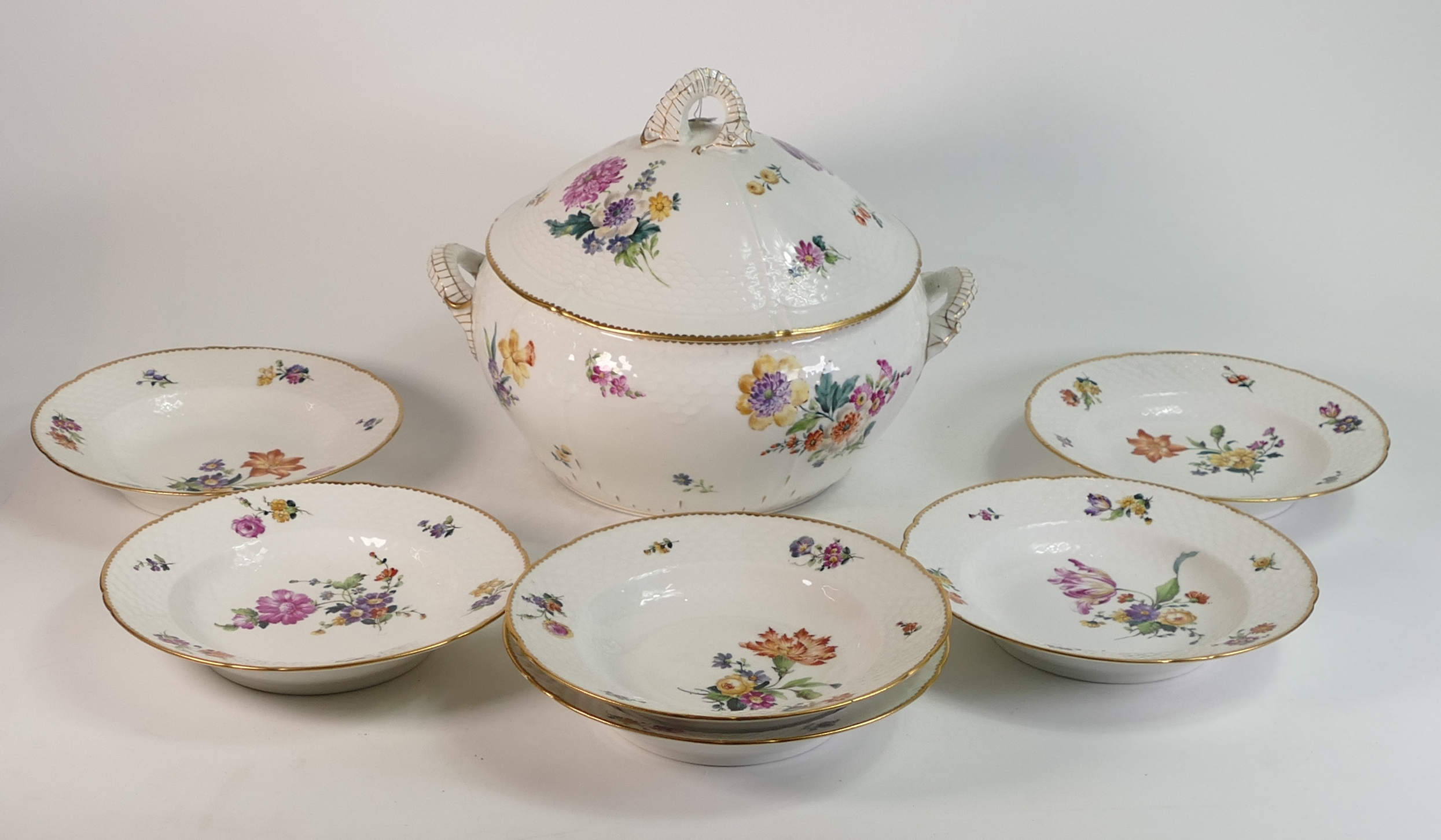 Royal Copenhagen Bing and Grondahl porcelain set of plates & tureen (A/F), hand painted in the Dresden floral style decoration, (1 Tray)