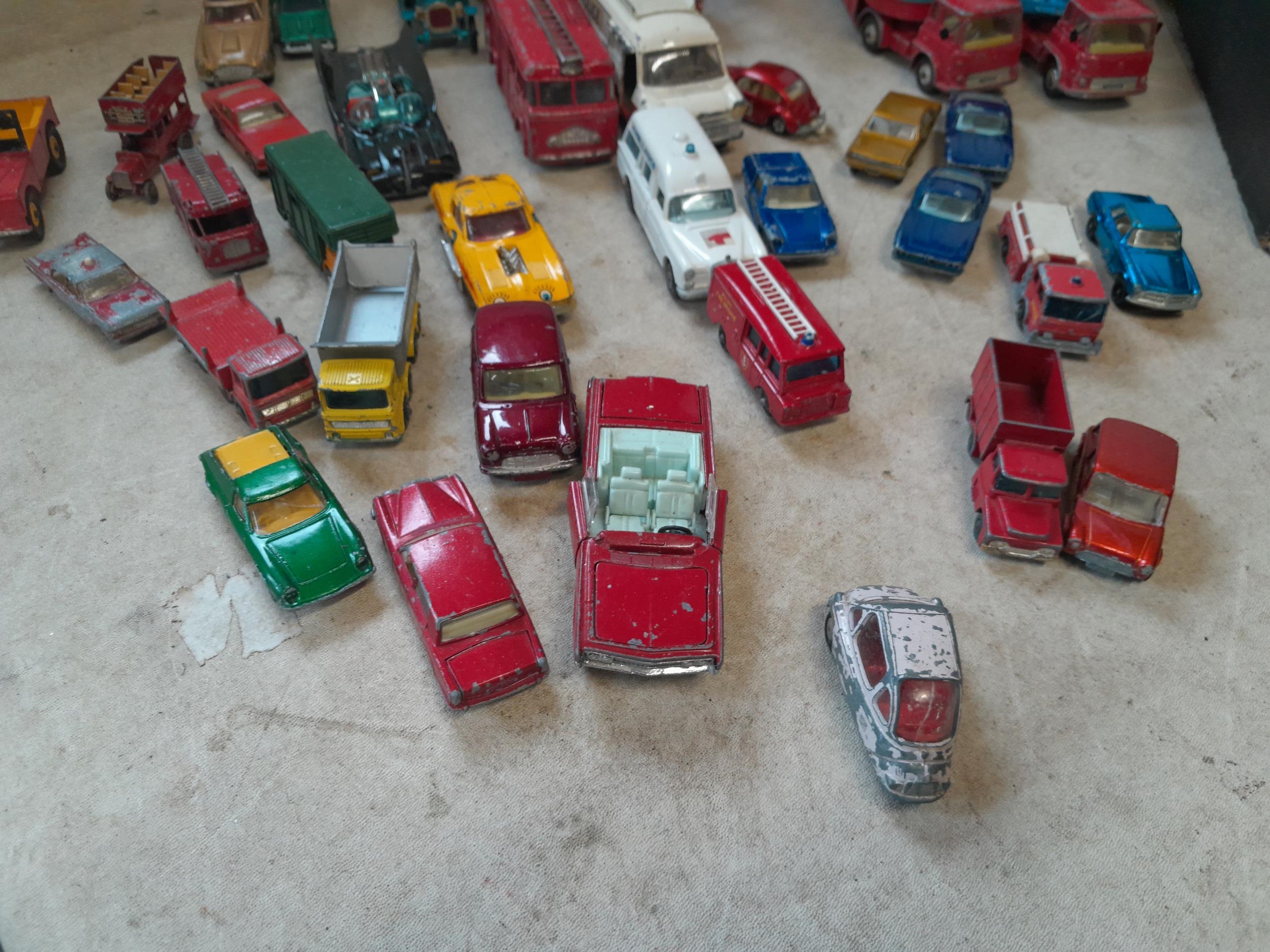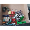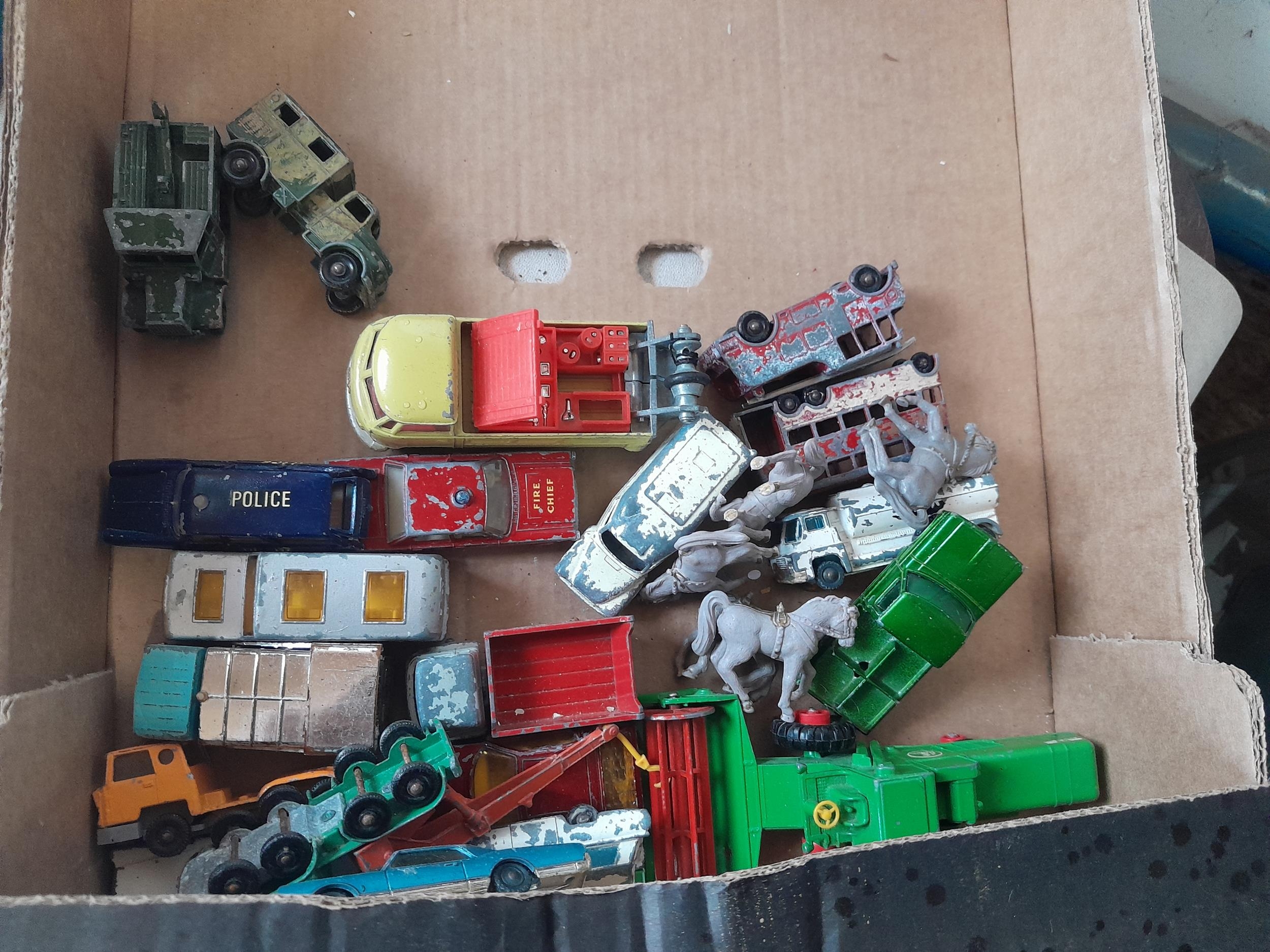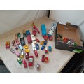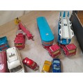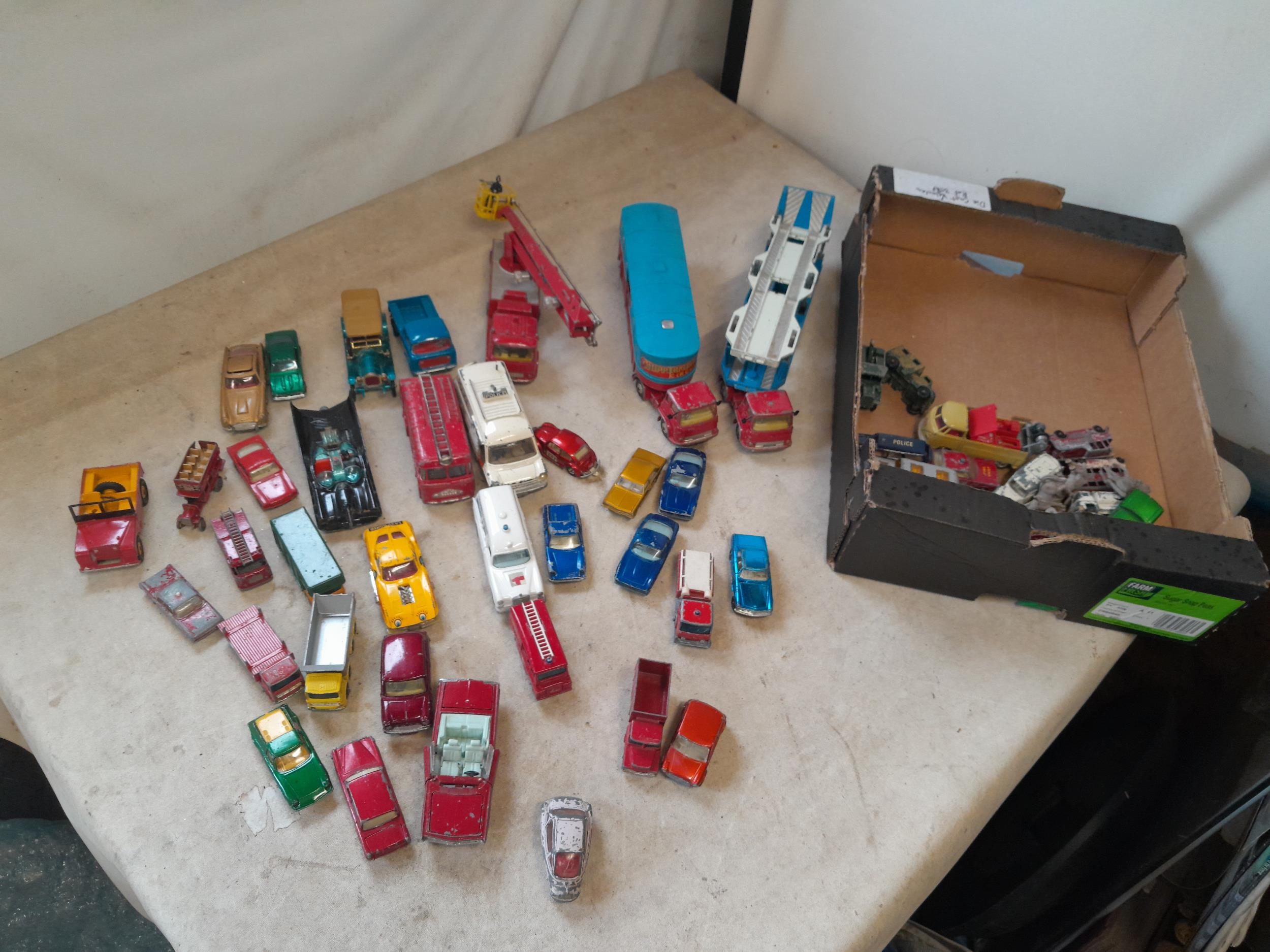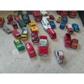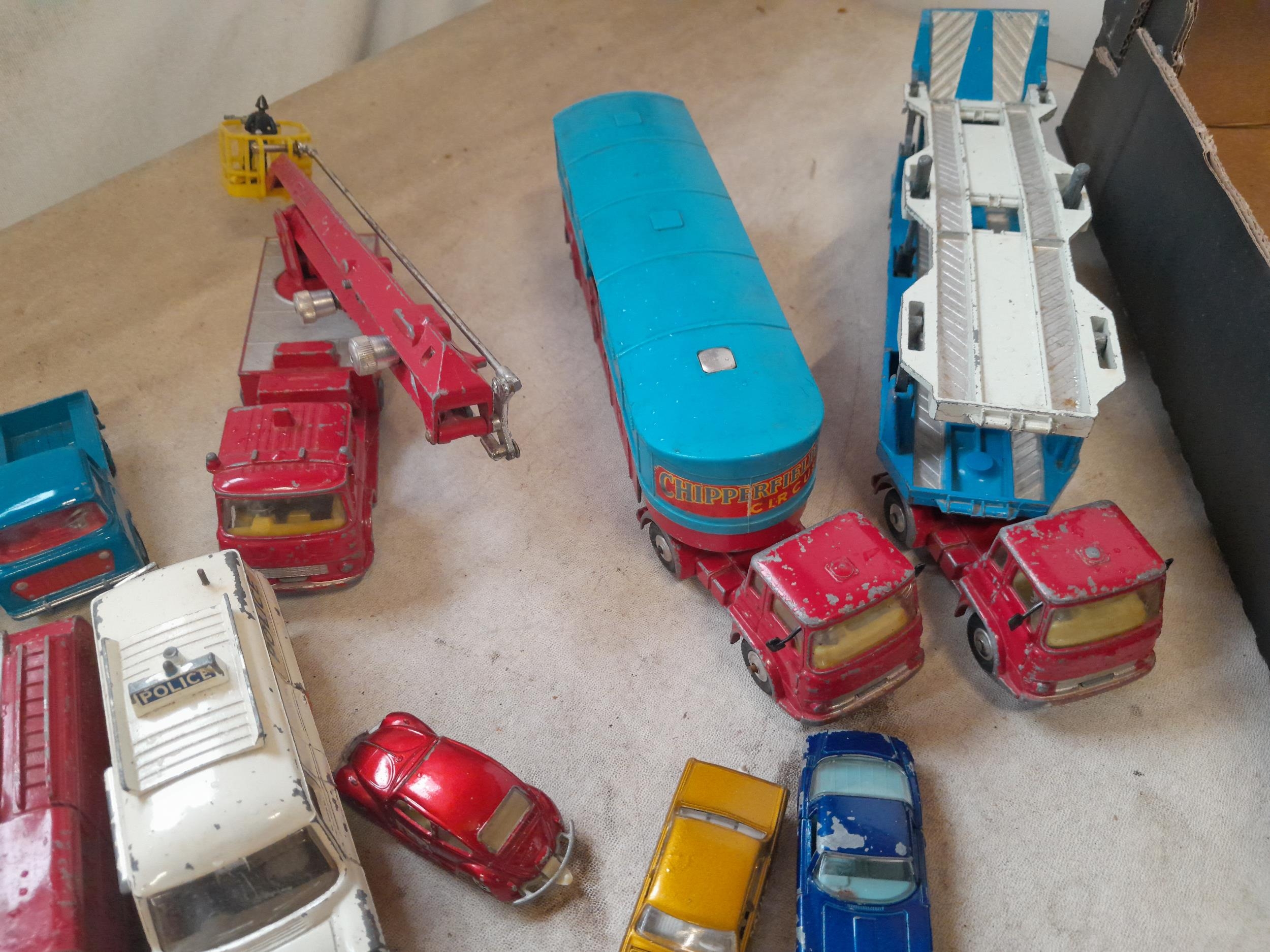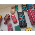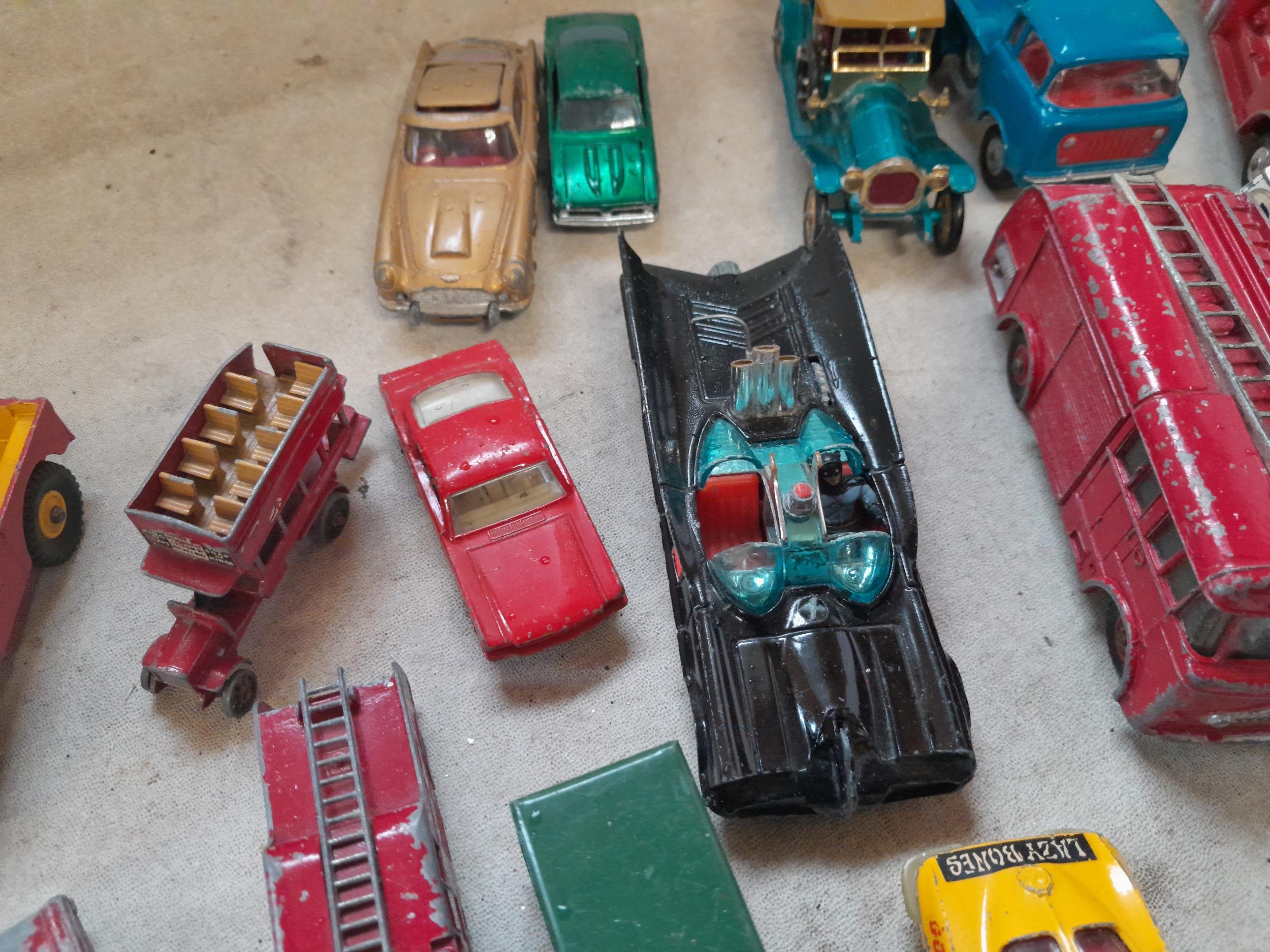 Mixed era and maker die cast toy cars all play worn, Chipperfield Circus lorry, Batmobile and others