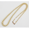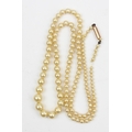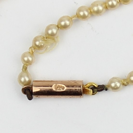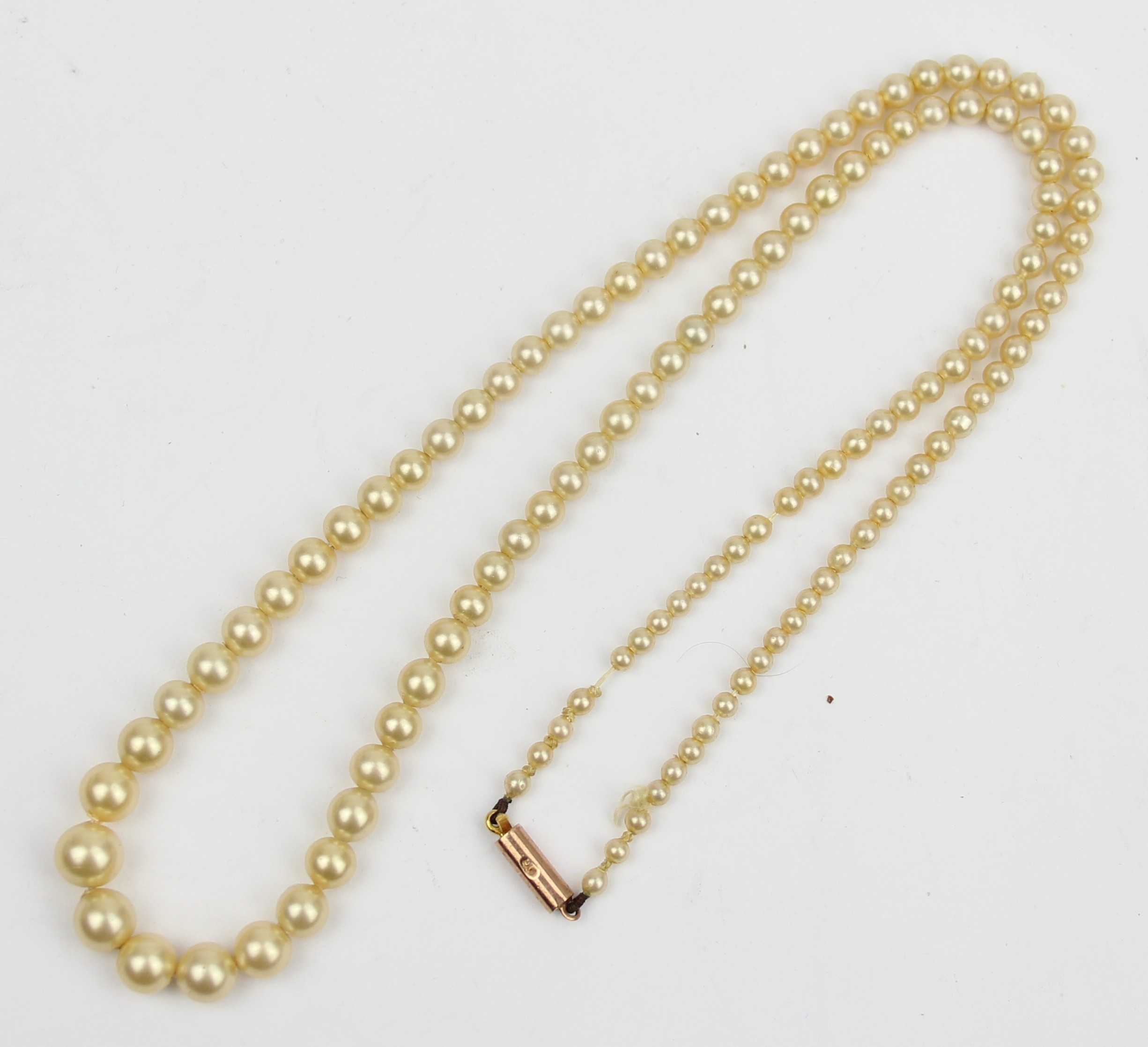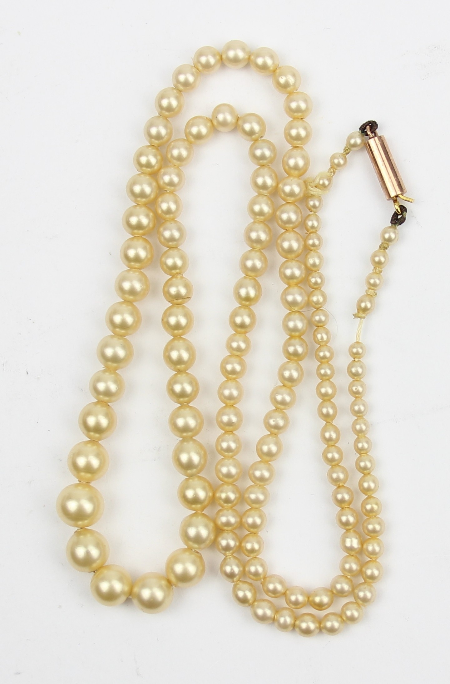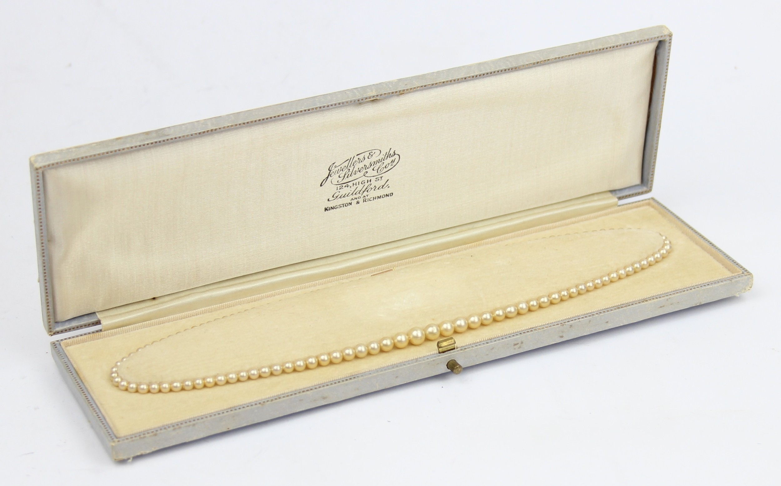 A vintage faux pearl necklace with 9ct gold clasp, marked and XRF confirmed, presented in original Guildford jewellers box, 47cm long