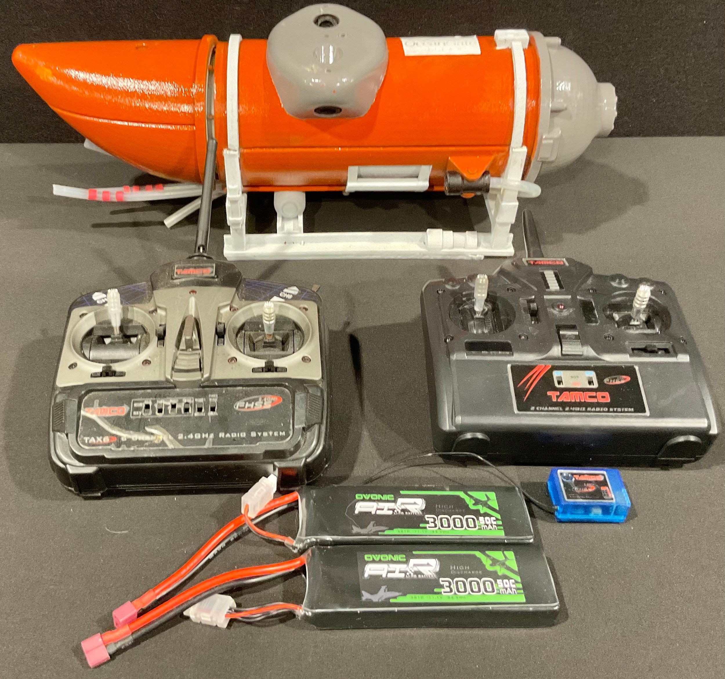 A scratch built radio controlled to scale model of the OceanGate Titan submarine; a Tamco two-channel 2.4ghz radio system controller; another Tamco TAX6 six channel 2.4ghz radio system controller (3)