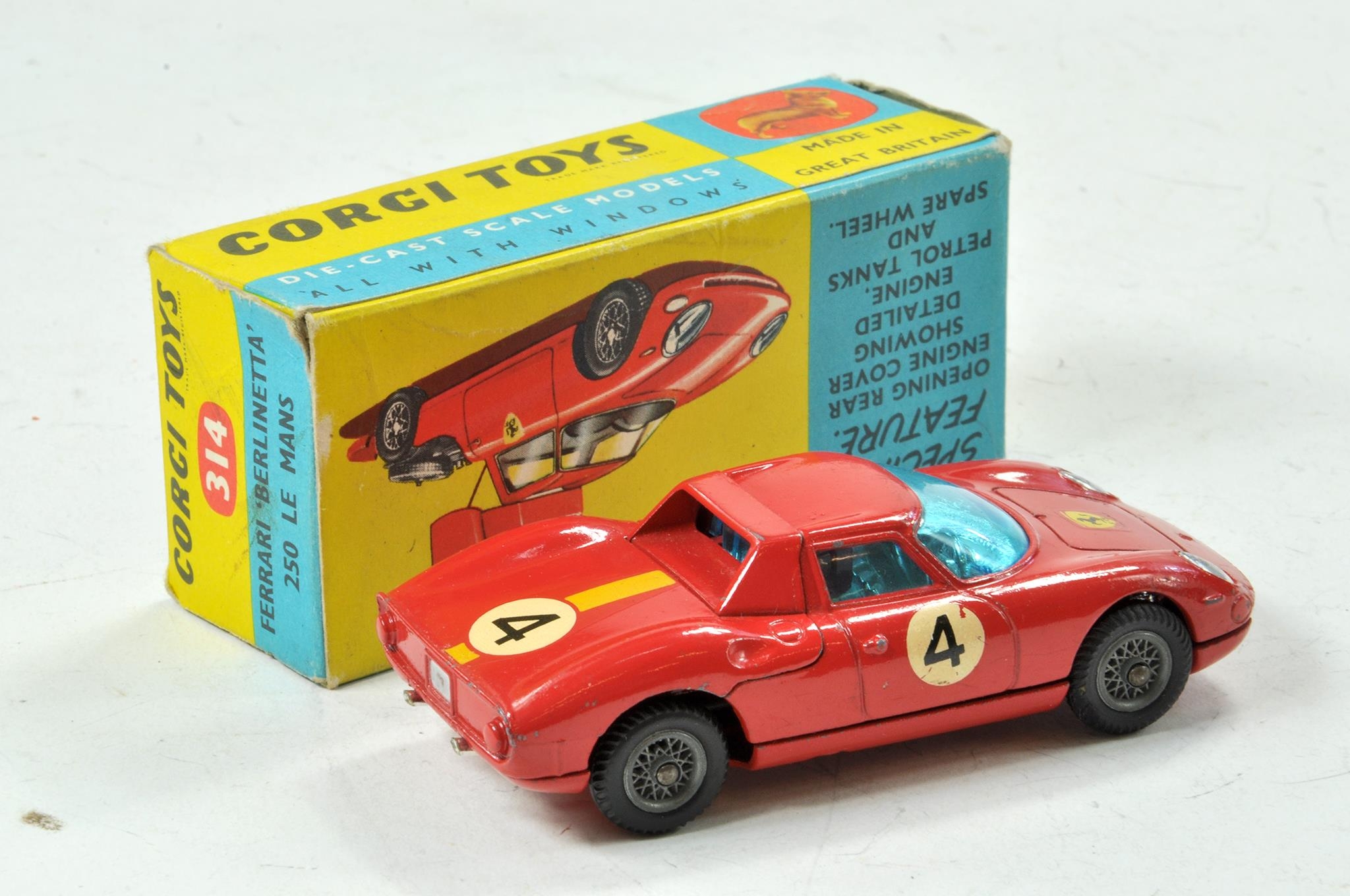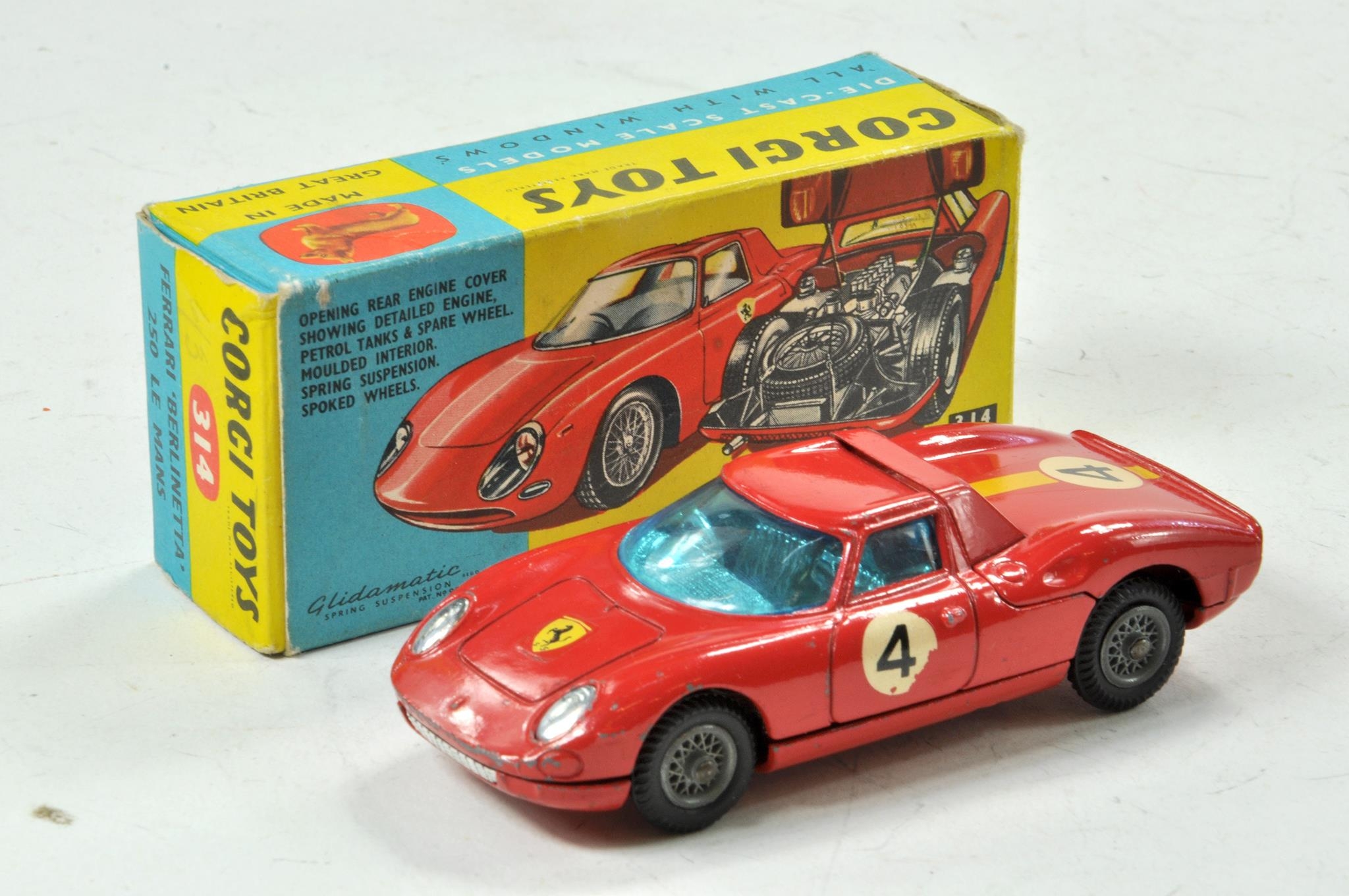 Corgi No. 314 Ferrari 'Berlinetta' 250 Le Mans. Red body, blue tinted glass RN'4' and wire wheels. Appears very good with some minor marks contained in very good original box.