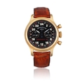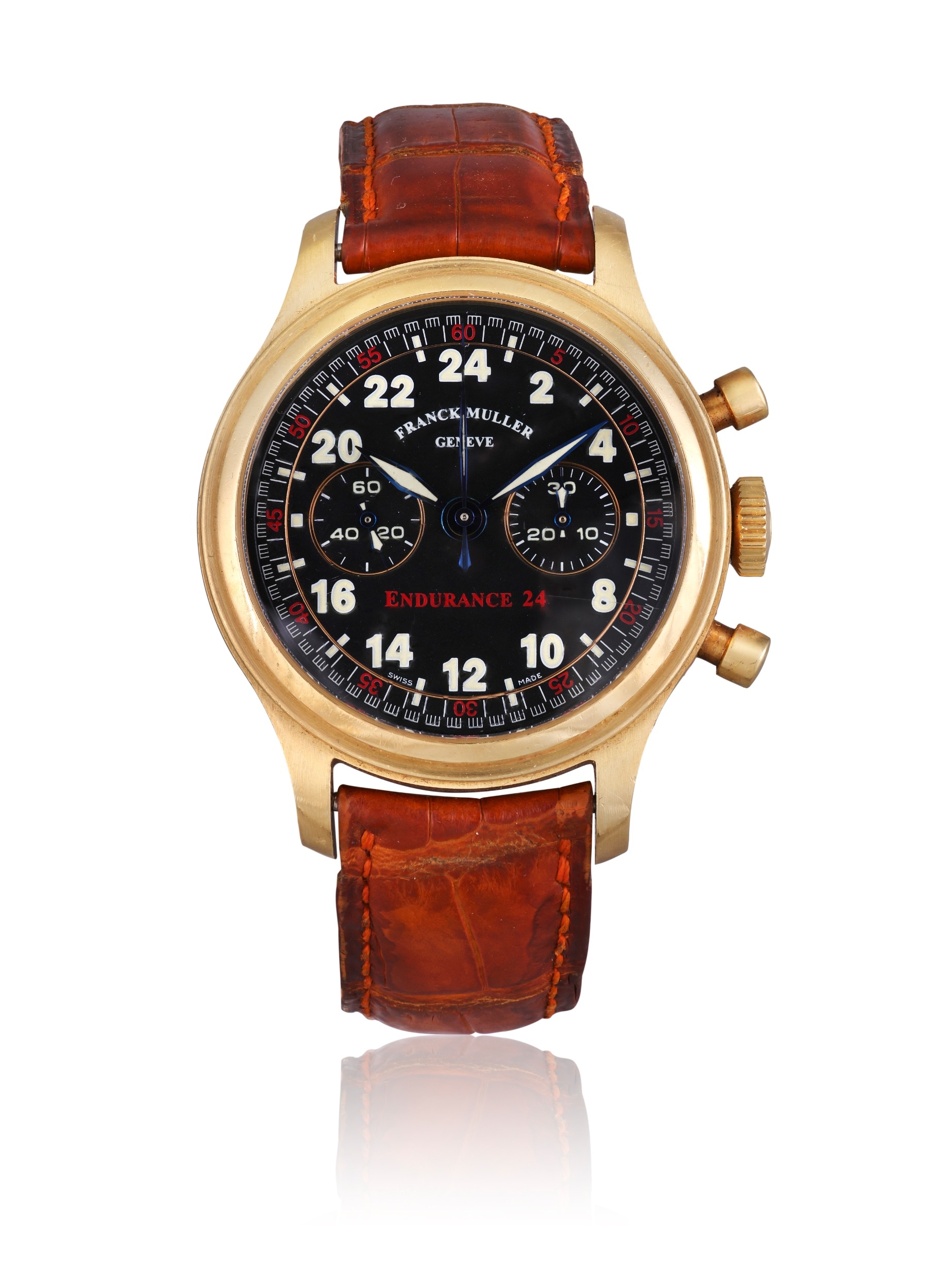 FRANCK MULLER "ENDURANCE 24" CHRONOGRAPH, 18K YELLOW GOLD Year: Circa late 1990s Dial: Black dial with luminous Arabic numerals, 24-hour scale, subsidiary dials for chronograph registers, signed Franck Muller Genève, "Endurance 24" in red. Calibre: Automatic movement, Lemania based cal. 1874, signed Franck Muller. Case: 18K yellow gold case, screw-down back engraved with racing car motif sticker and "Endurance 24", numbered No. 46, signed Franck Muller Genève. Diameter: Approx. 36 mm Gross Weight: Approx. 95,68 g Bracelet/Strap: FM Brown leather strap with 18k rose gold FM pin buckle. Signature: Dial, case, movement, folding clasp and buckle.