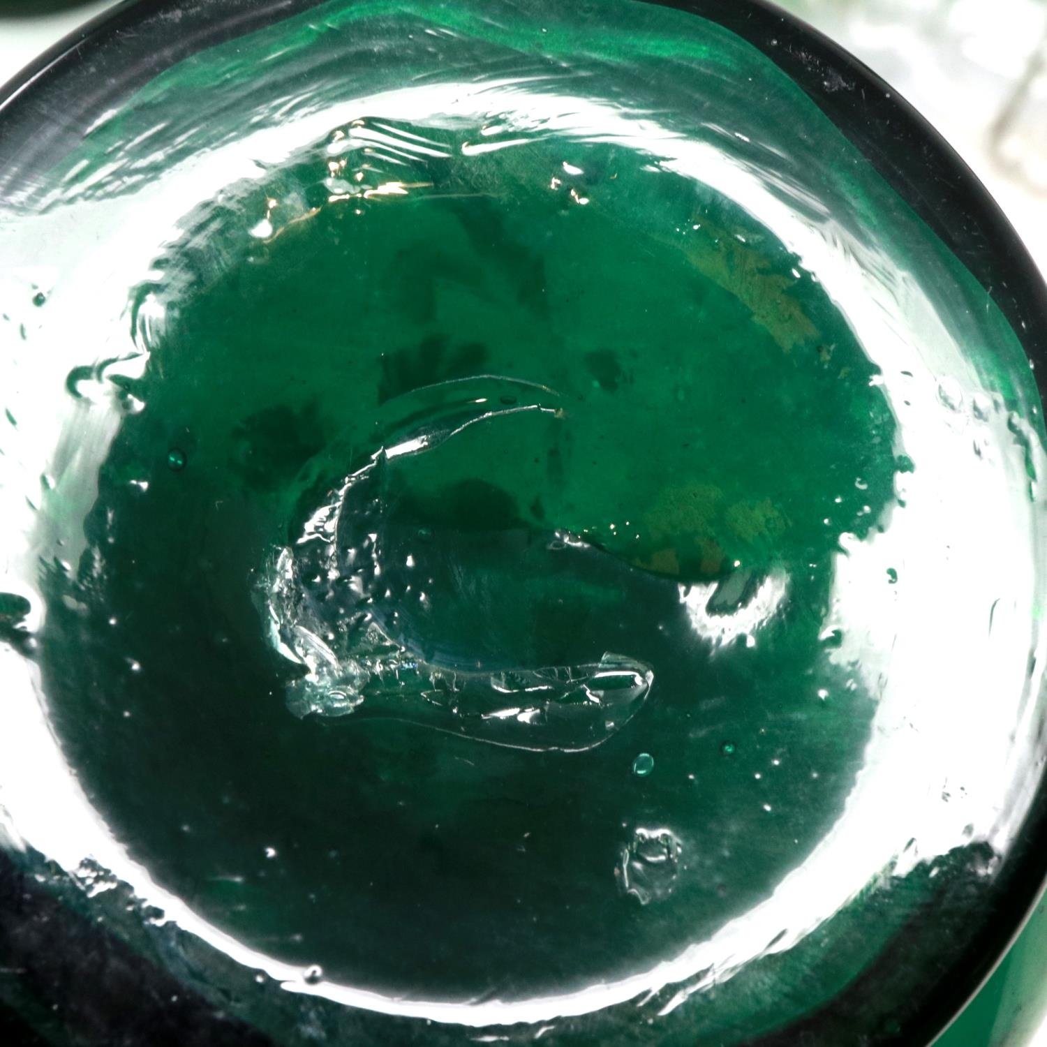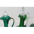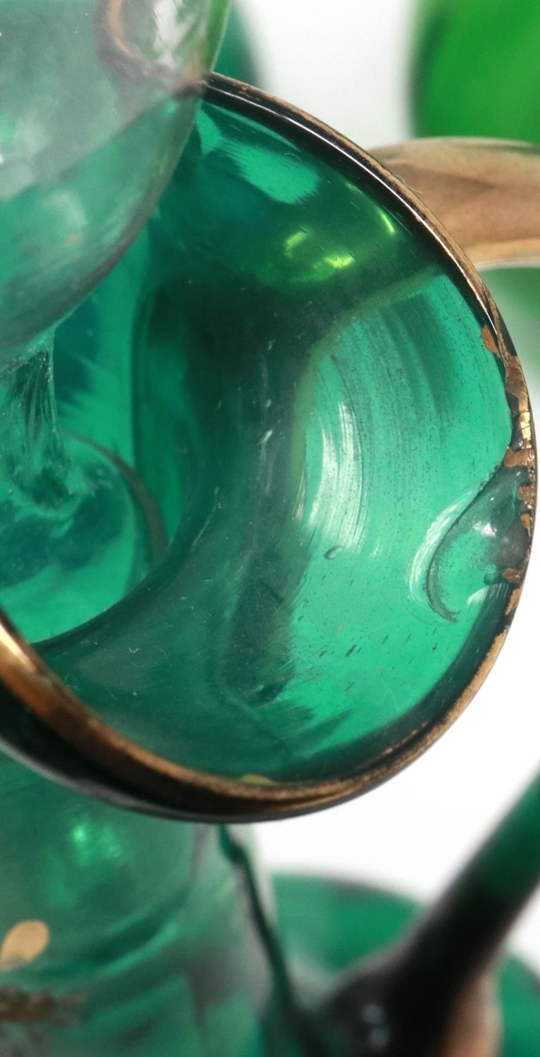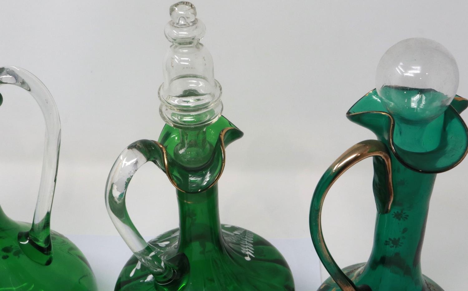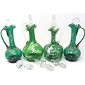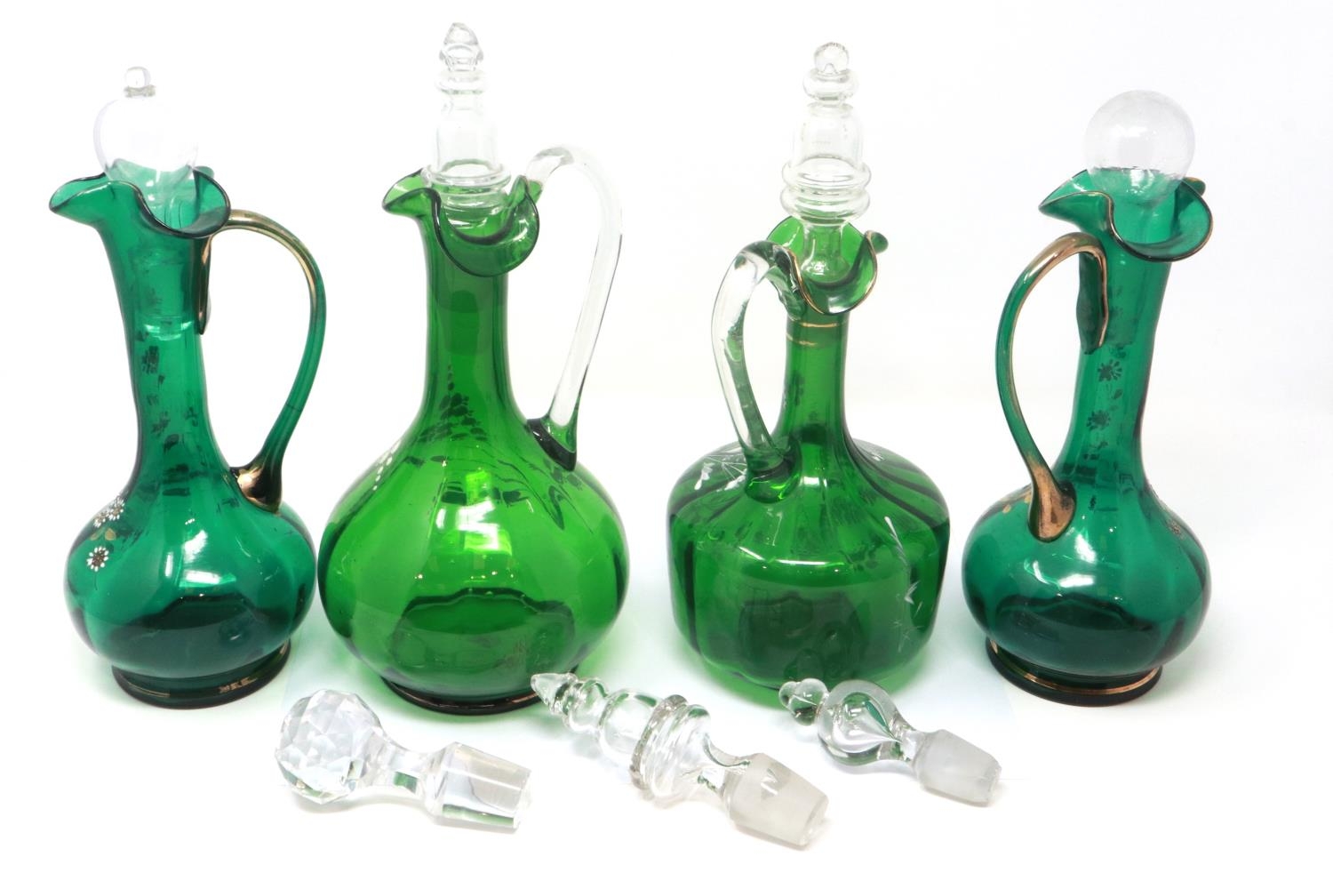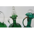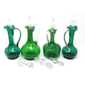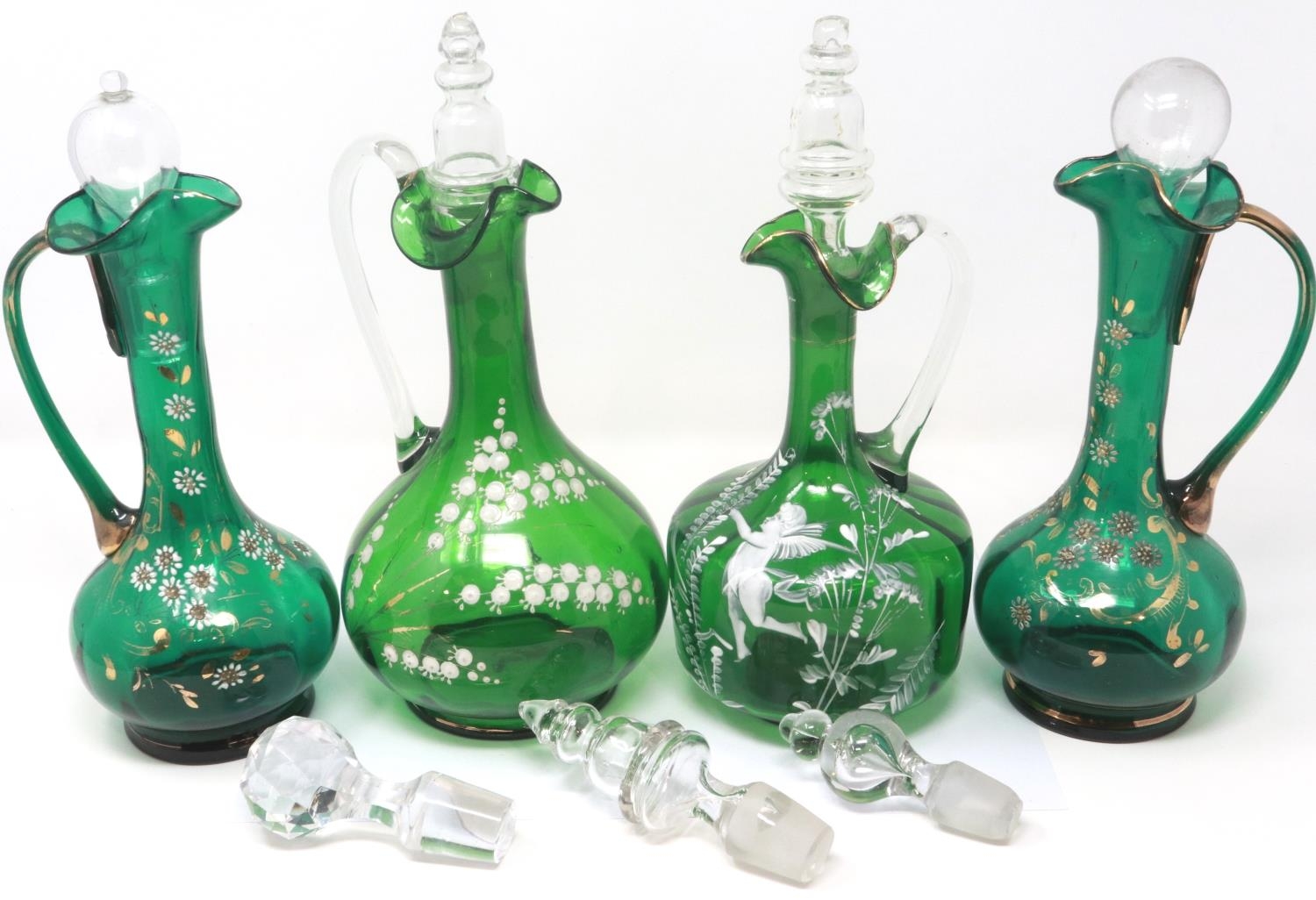 Mary Gregory green glass decanter with enamelled cherub design and three similar examples with matched stoppers, largest H: 28 cm. P&P Group 3 (£25+VAT for the first lot and £5+VAT for subsequent lots)