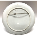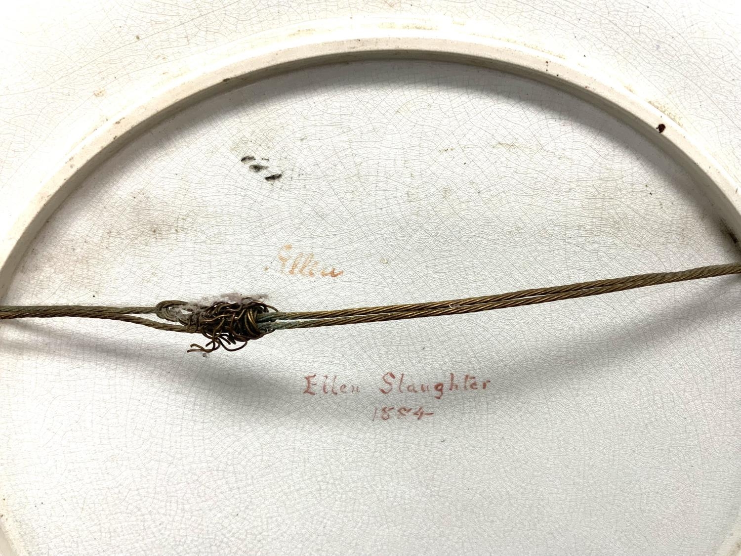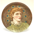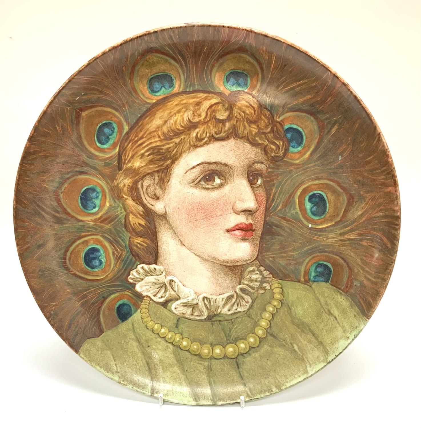 A large earthenware pottery charger with hand painted view of a lady using peacock feathers. Named and dated to reverse 1884 Ellen Slaughter. 36.5cm (D)