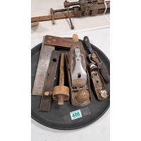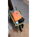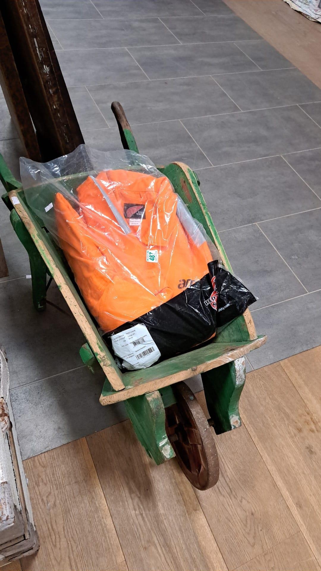 Vintage small wheel barrow and redwing overall