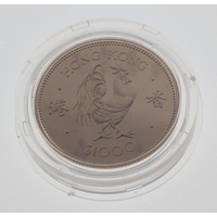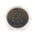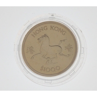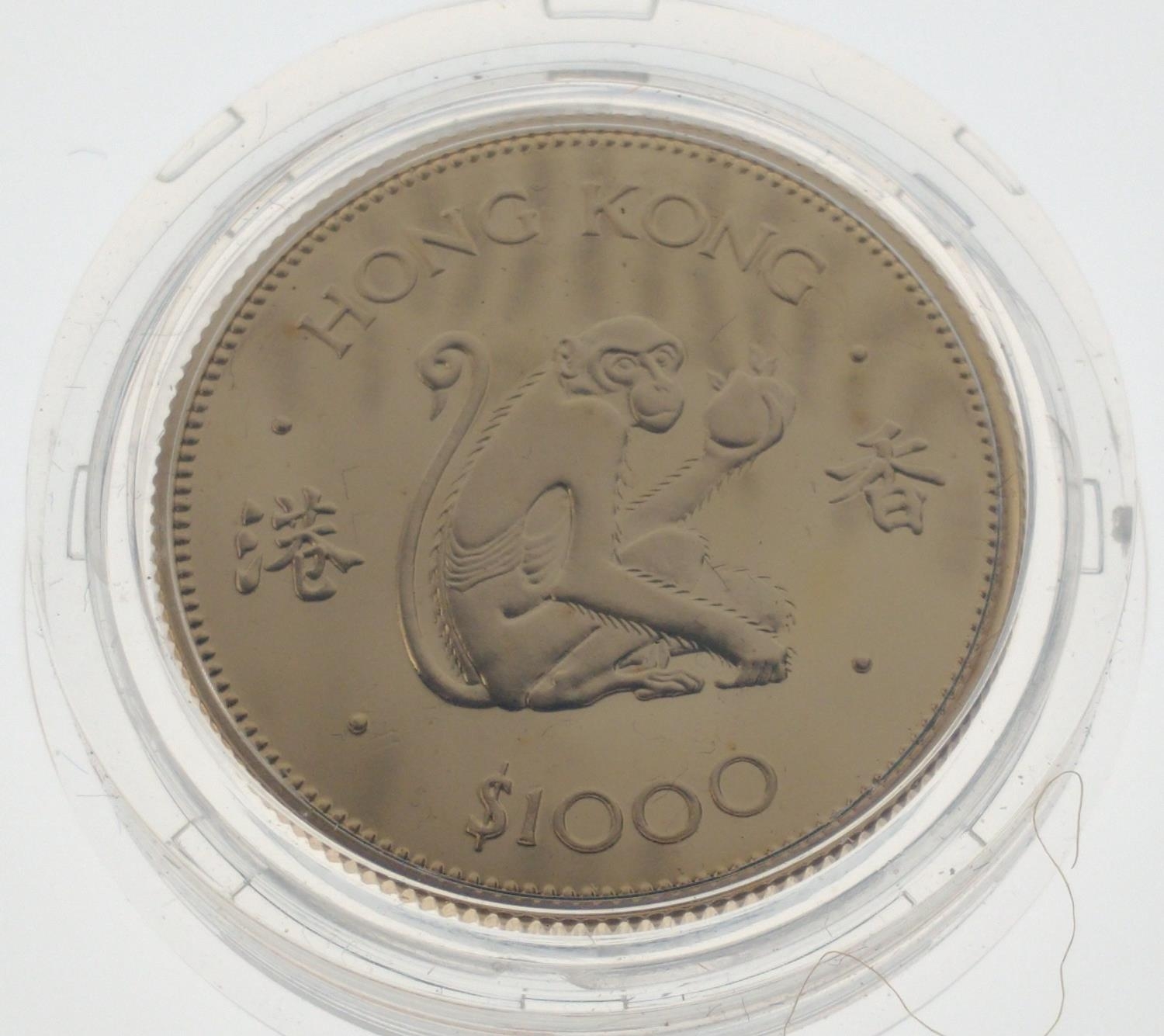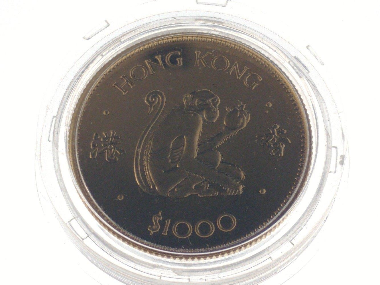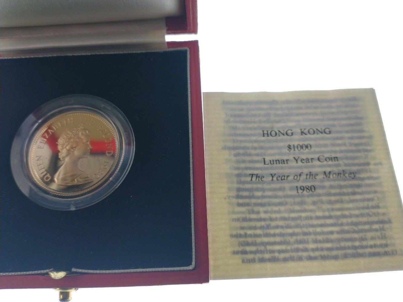 A 1980 HONG KONG $1000 Lunar Year Coin 'The Year Of The Monkey' struck in 22ct yellow gold within its protective case In 1980 to celebrate the Lunar Year of the Monkey, the Royal Mint released a very Limited Issue Lunar Monkey $1000 One Thousand Dollar Gold Proof ...weight 15.96g - comes in original presentation case and protective covering