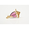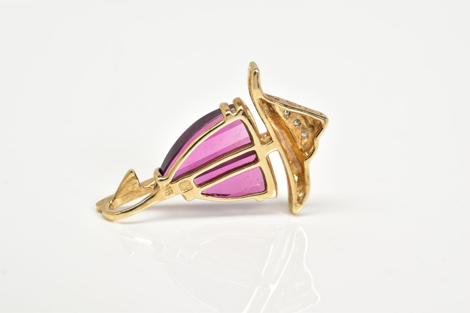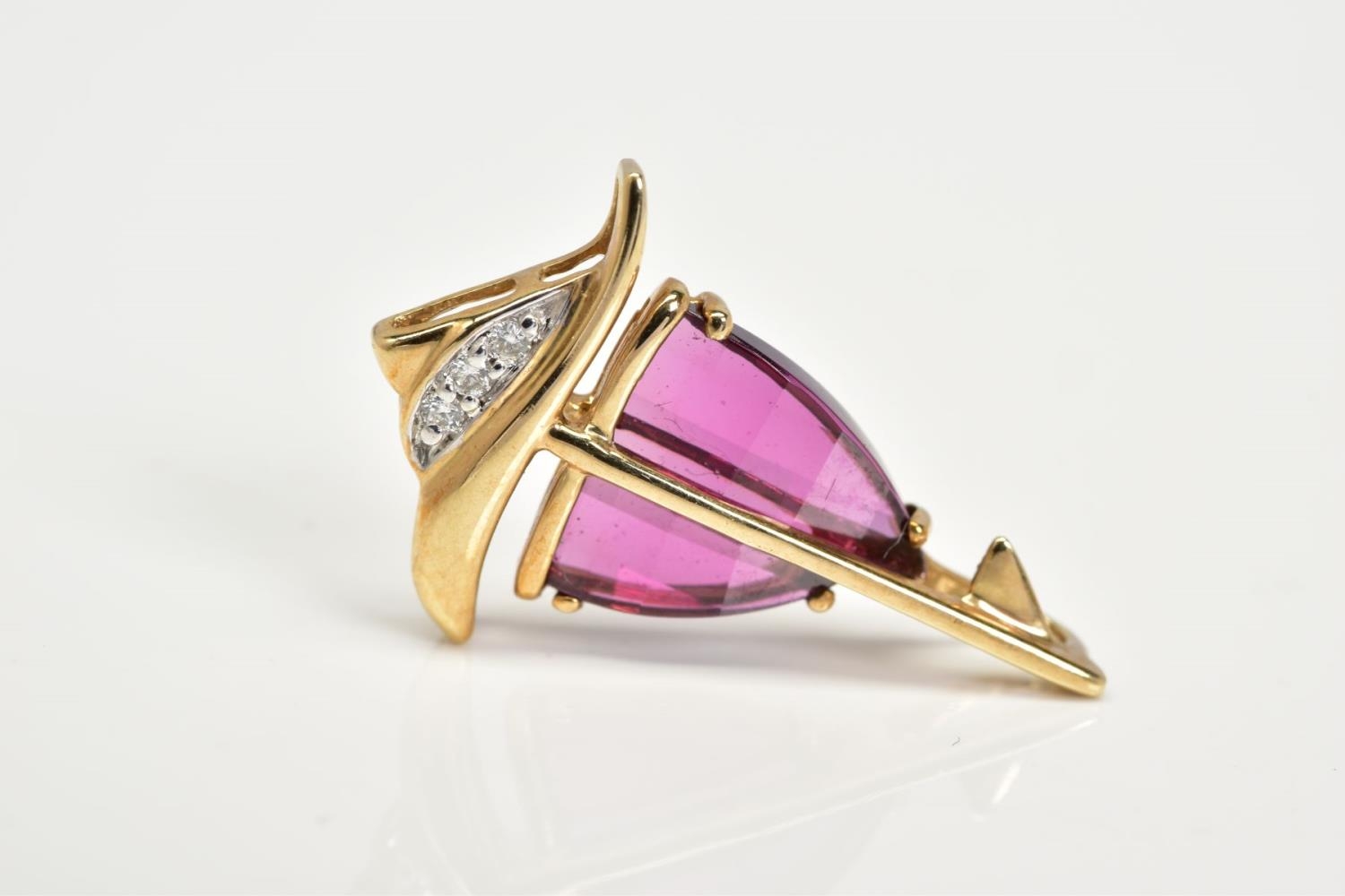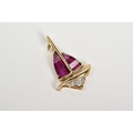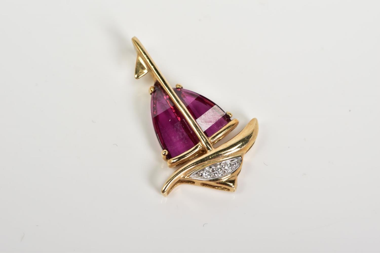 AN AMETHYST AND DIAMOND PENDANT, the yellow metal pendant in the form of a yacht, set with garnet sails and a round brilliant cut diamond detail, to a plain polished bail stamped 9k, length 24mm, approximate gross weight 1.6 grams