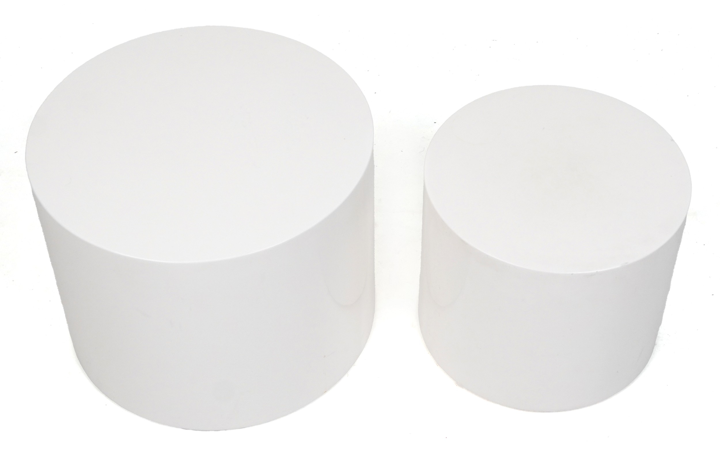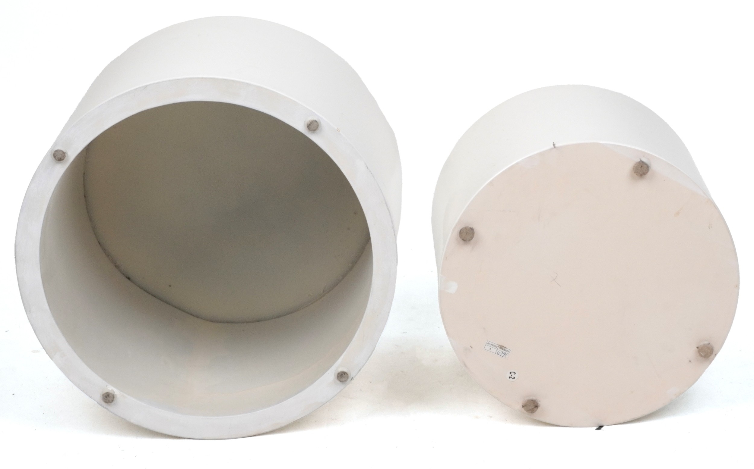 A pair of late 20th century white fibreglass cylindrical nesting tables, 38cm high x 48cm in diameter.