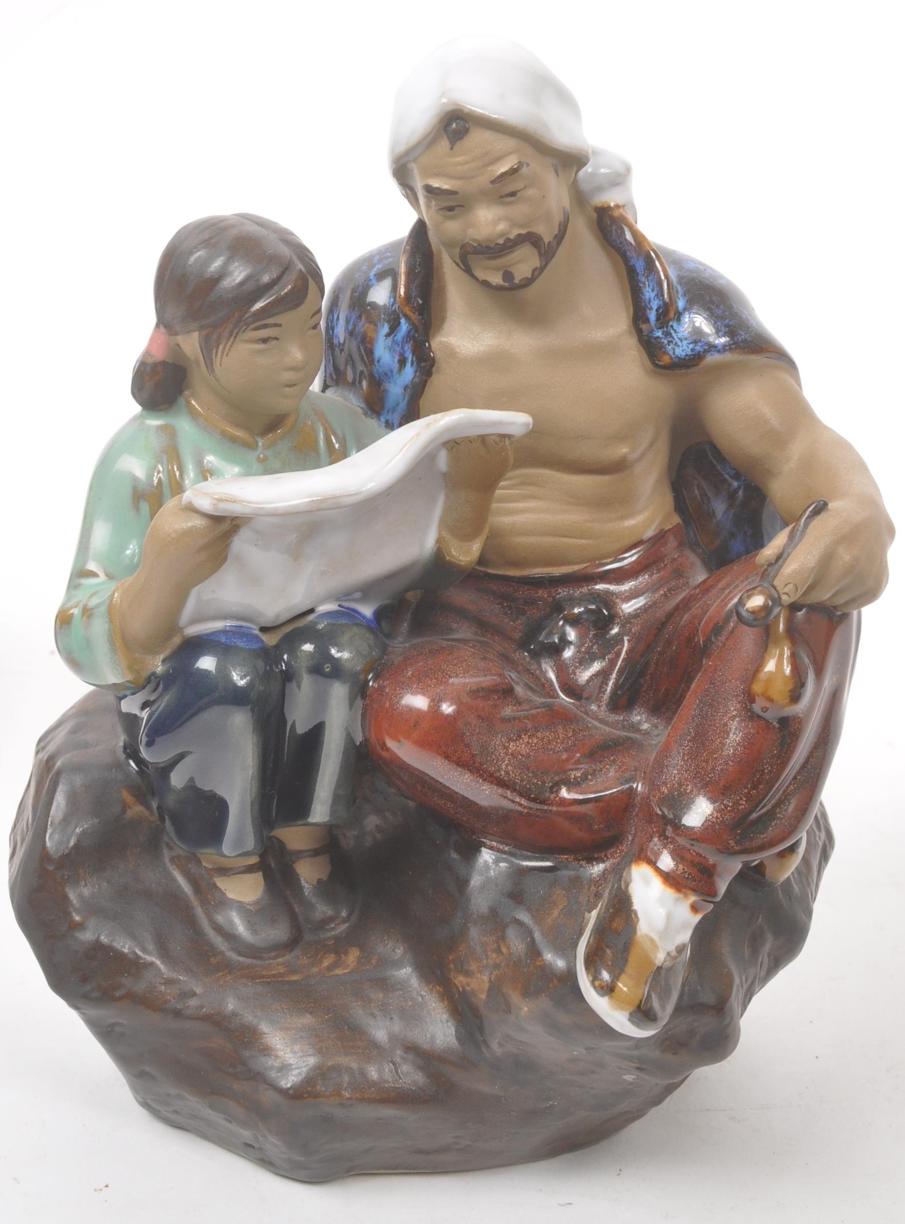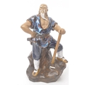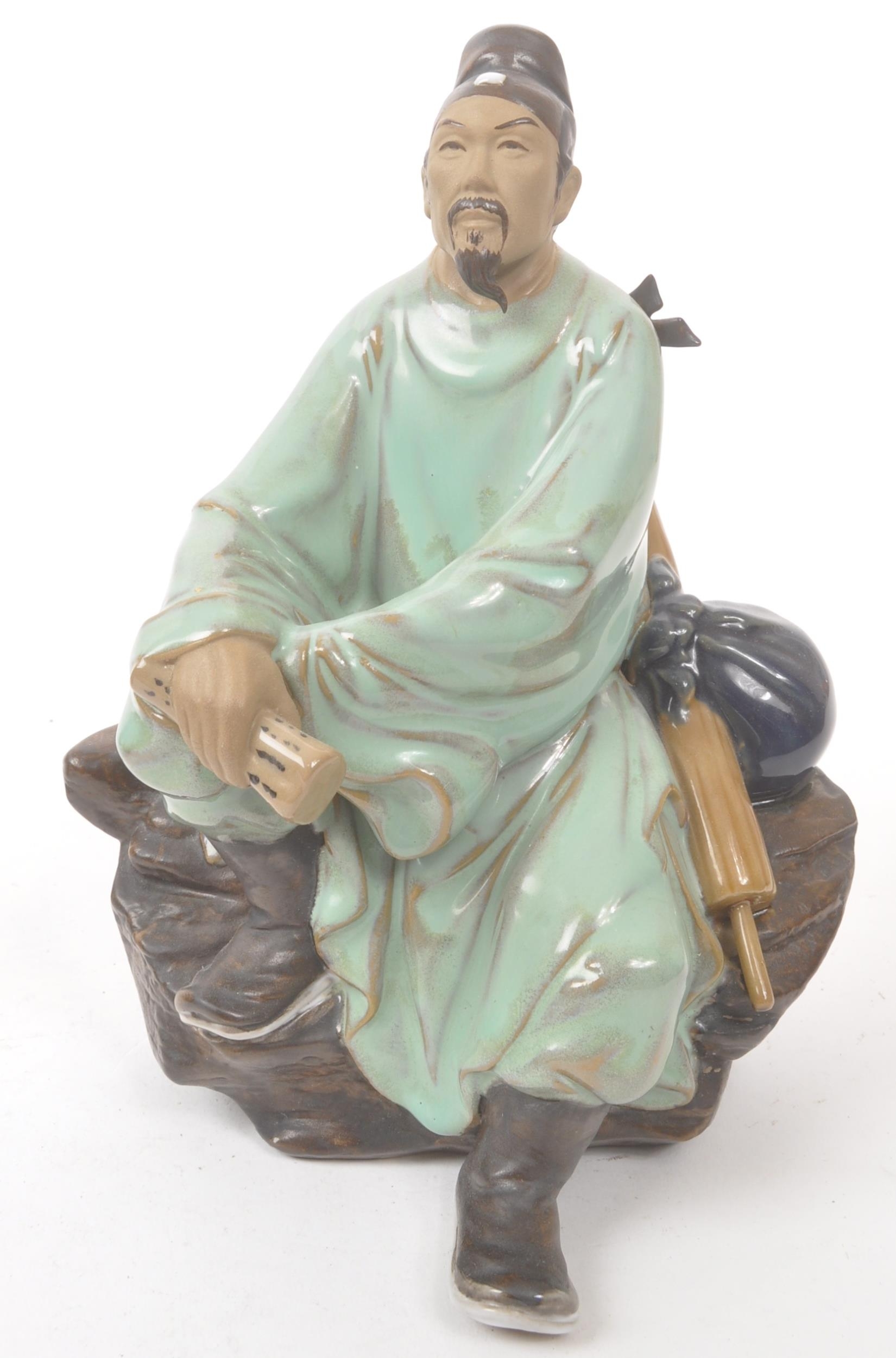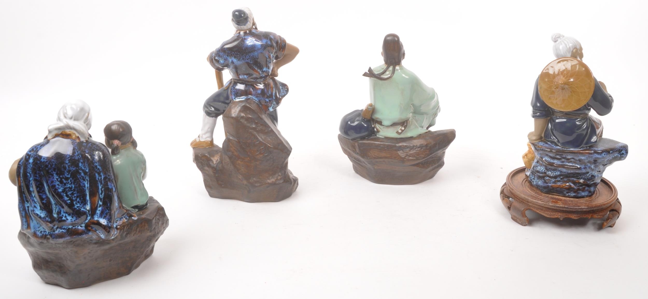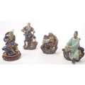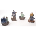 A collection of four Chinese ceramic mud men figurines. Each of the figures on naturalistic bases, with three depicting seated the figures, and one standing. Tallest measures approx. 25cm tall.