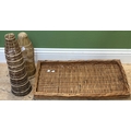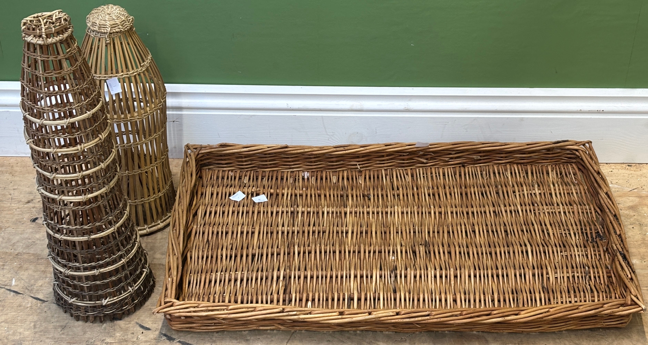 Two wicker fish traps, possibly Malaysian, 48cmL & 38cmL together with a wicker tray 42x72cm