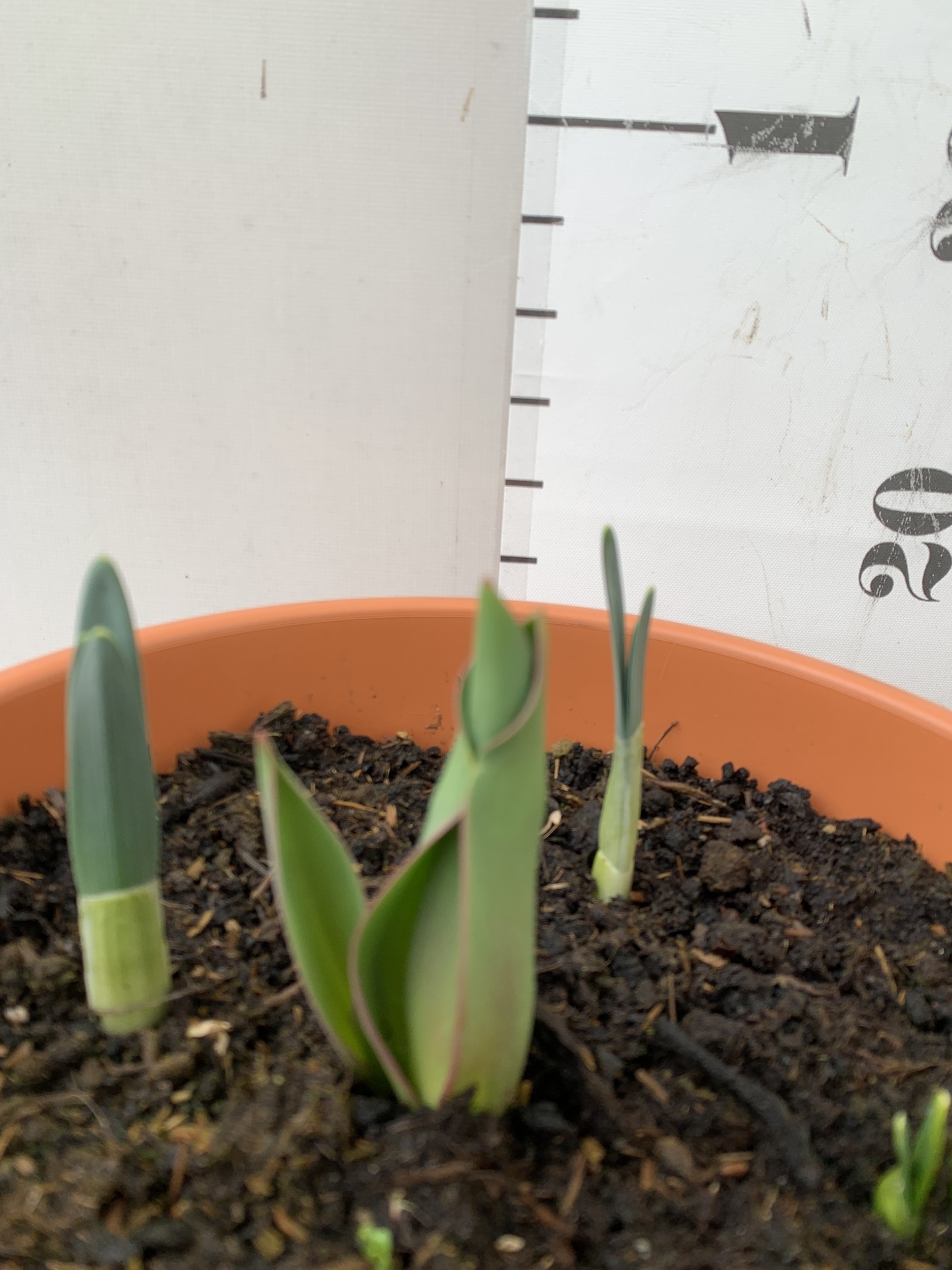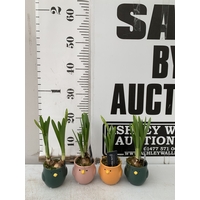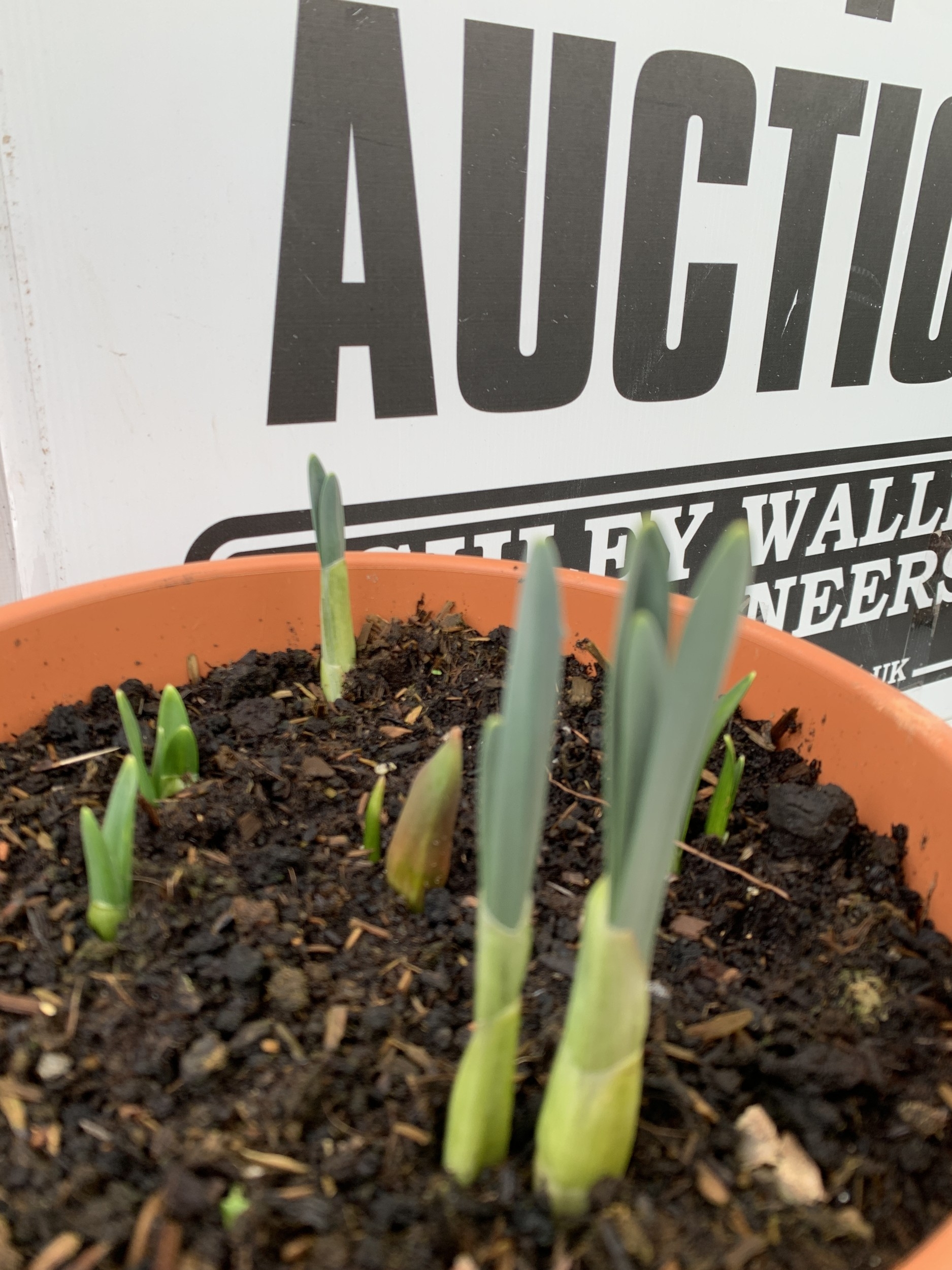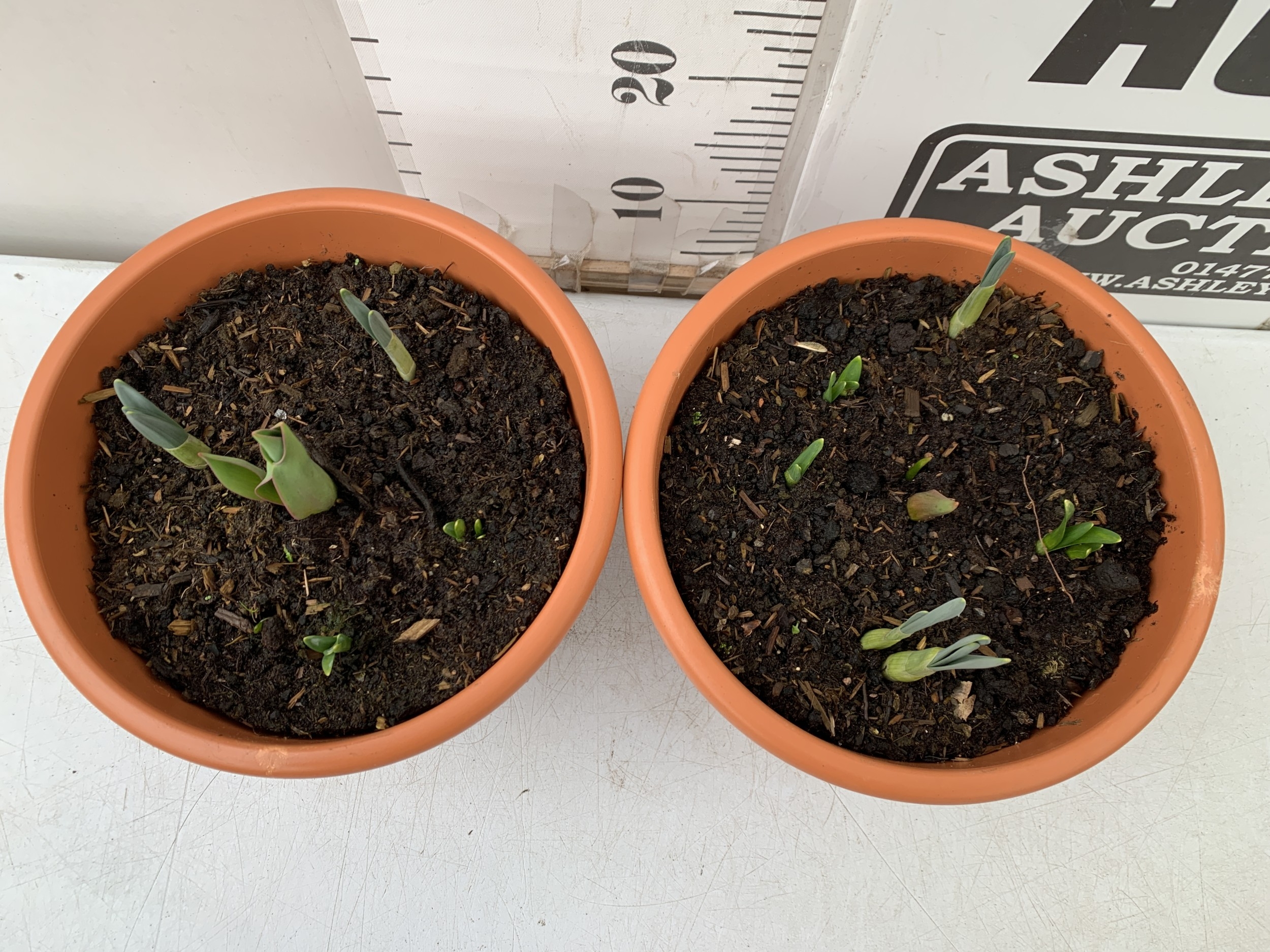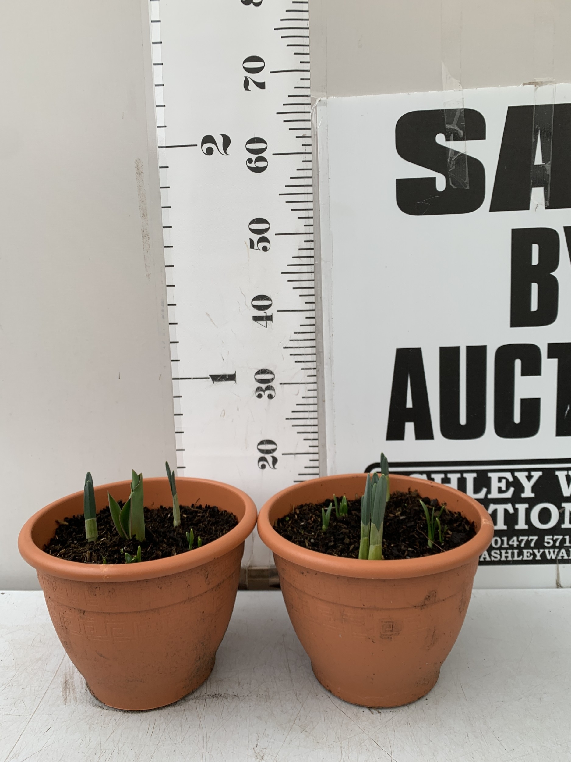 TWO PLANTERS CONTAINING MIXED SPRING BULBS TO INCLUDE DAFFODILS, TULIPS AND CROCUS ETC. PLANTERS MEASURE 25CM IN DIAMETER. TO BE SOLD FOR THE TWO