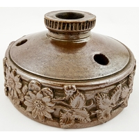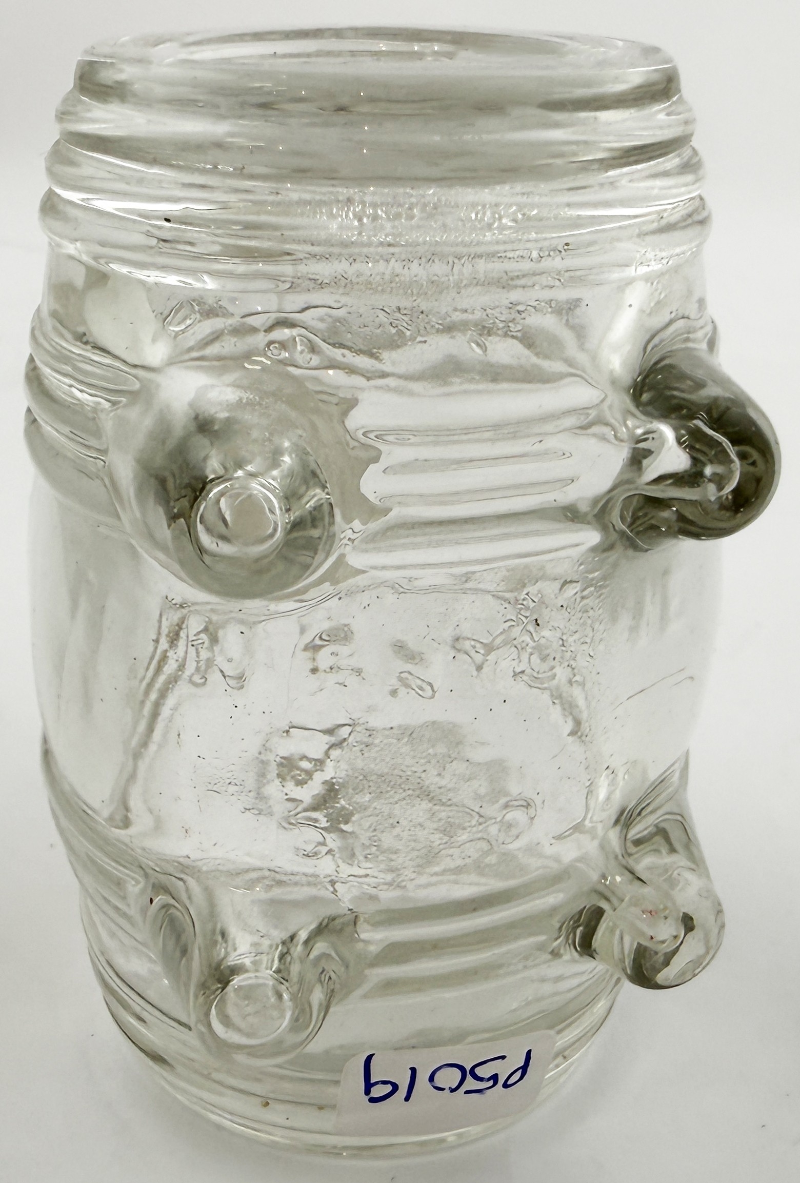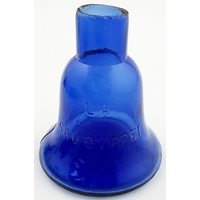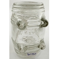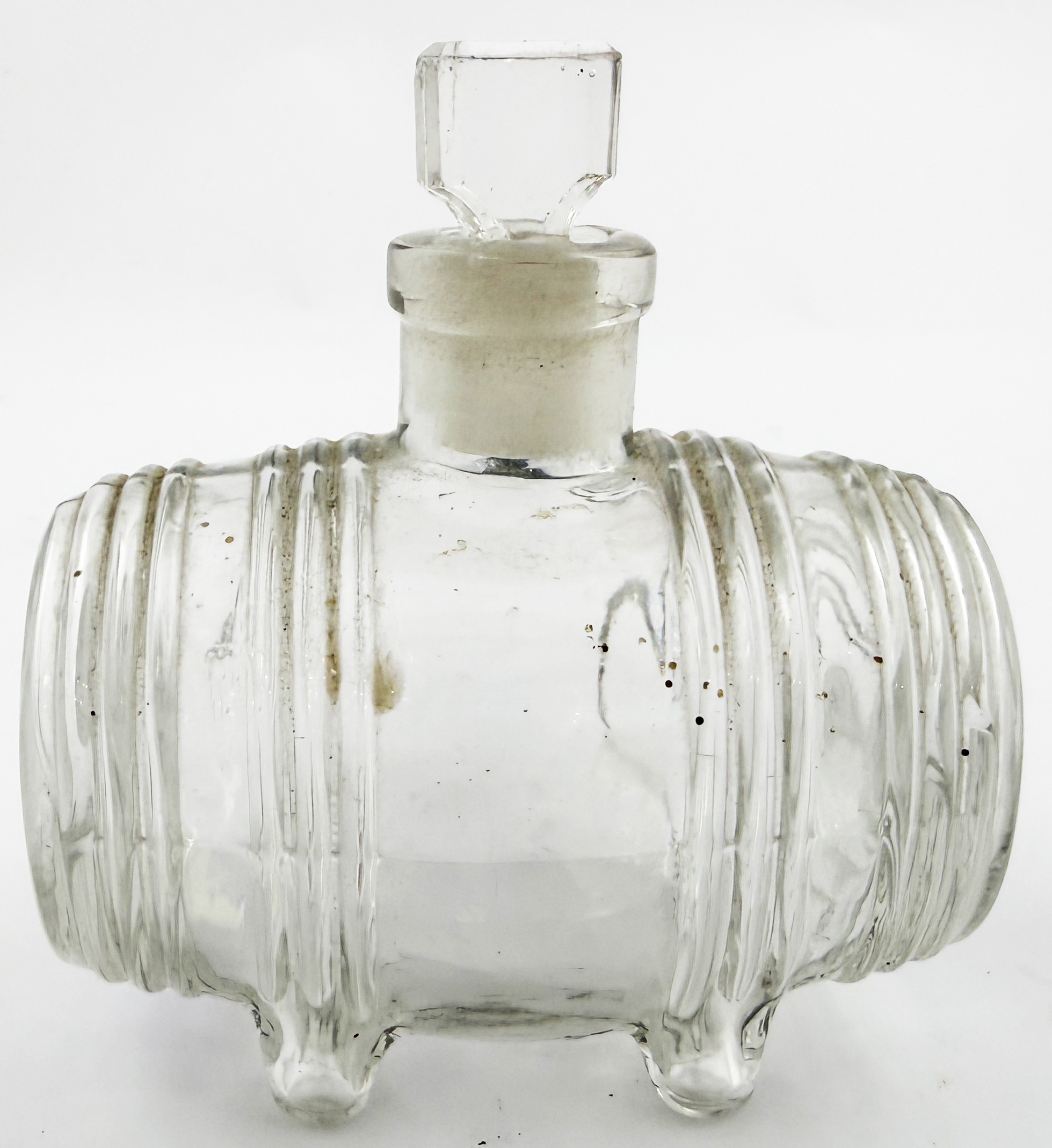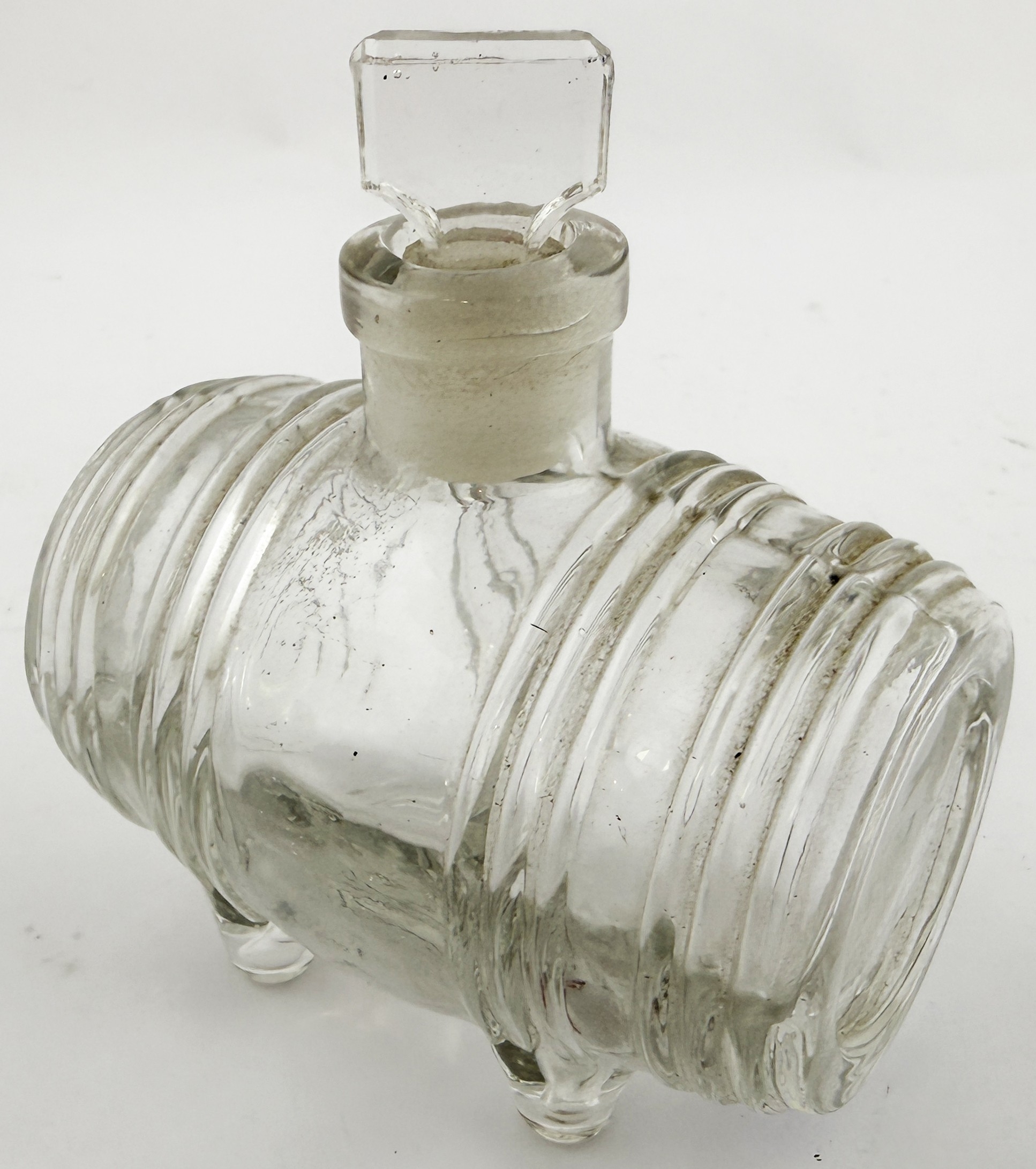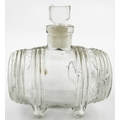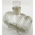 N ANTOINE FOOTED BARREL INK BOTTLE. 3.25 ins long. Burch p32. A12.22. Described as very rare. Side lying clear glass barrel embossed N. ANTOINE/ DEPOSE under base between barrel bands & 4 feet. Original ground glass stopper.