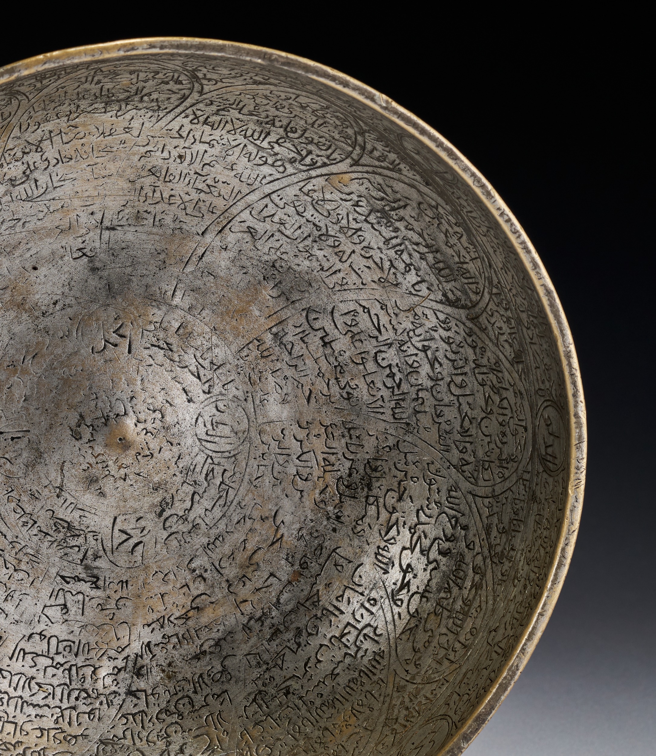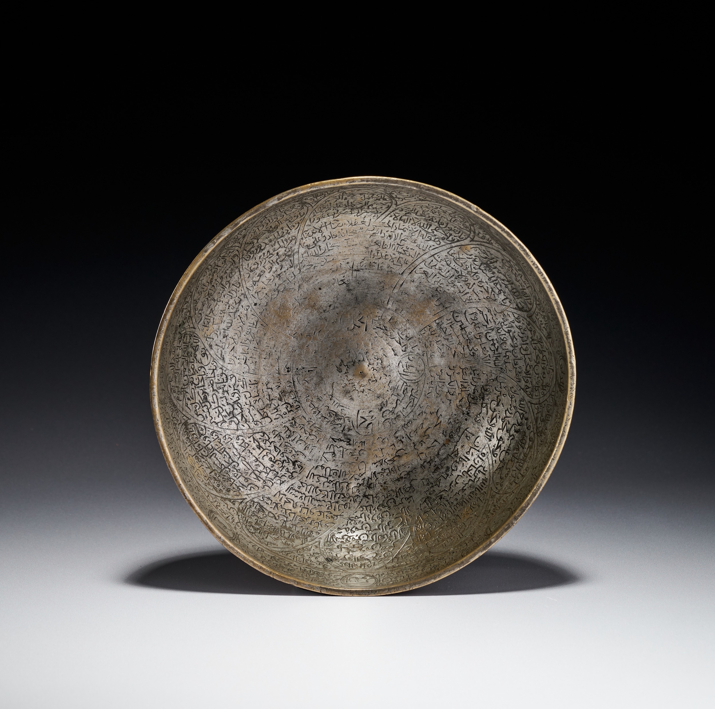 This magic bowl is a hemispherical vessel crafted from a copper alloy, specifically brass, with remnants of original tinning. The object is characteristic of talismanic metalwork from Iran, likely dating to the 17th or 18th century. The interior and exterior surfaces are densely decorated with fine engraved calligraphy and geometric motifs. The interior features a central boss surrounded by concentric bands of script in a cursive naskh style. The walls are divided into arching segments filled with multiple lines of Arabic calligraphy, including religious texts and protective prayers. Small circular medallions along the upper rim contain specific names, including Muhammad and Ali. The exterior base displays a central 4x4 magic square, known as a wafq, containing sixteen Eastern Arabic numerical characters. This central square is surrounded by a wide circular band of calligraphy and a series of large, petal-shaped medallions also containing extensive script. Such bowls were used for medicinal and protective purposes, intended to imbue water with the properties of the inscribed verses.