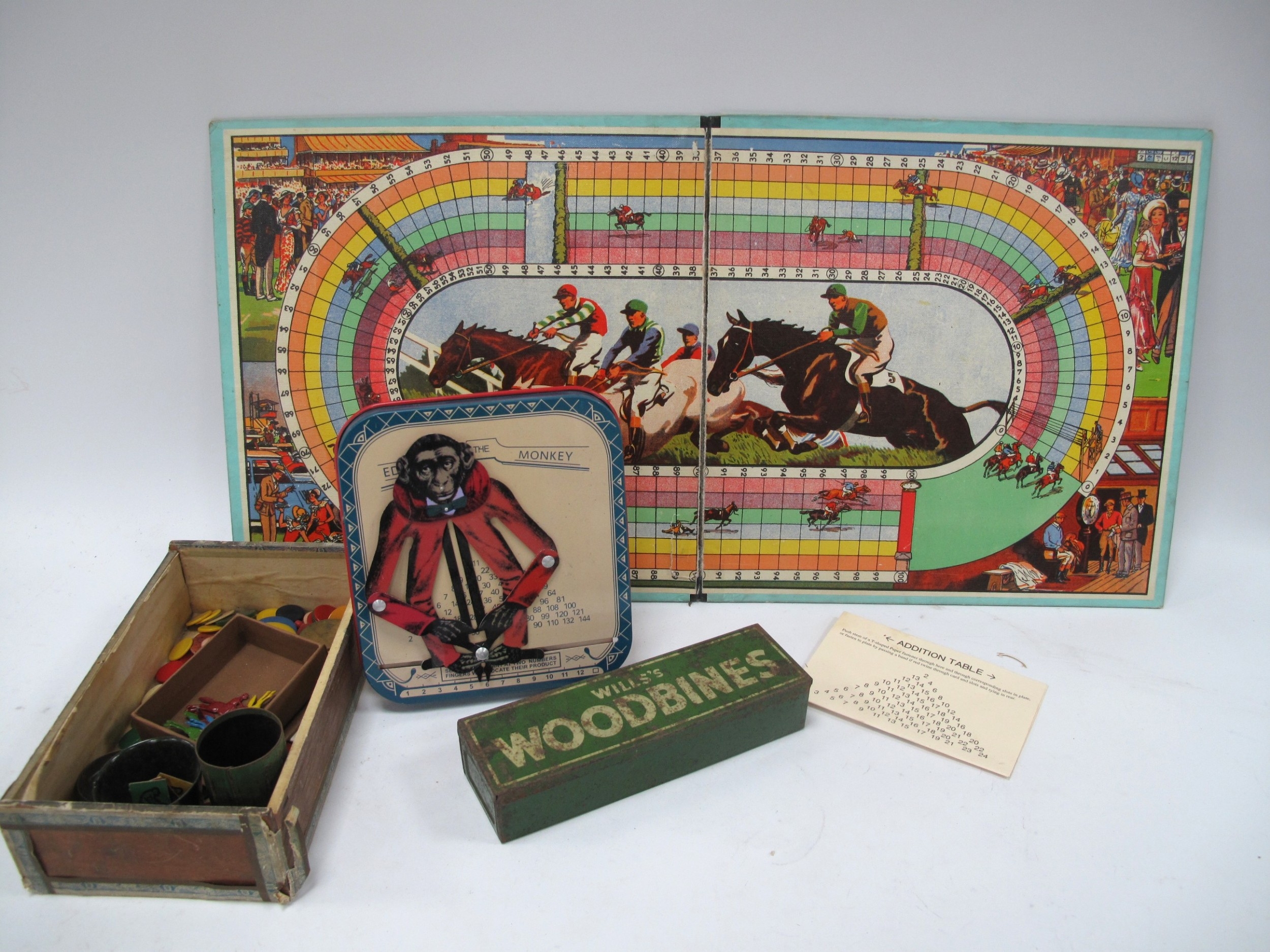 A Mid 1900s Horse Racing Game, metal 'horse and jockey' counters, dice, etc, a metal "Educated Monkey" game, plus a box of Will's Woodbine advertising dominoes:- One Tray