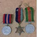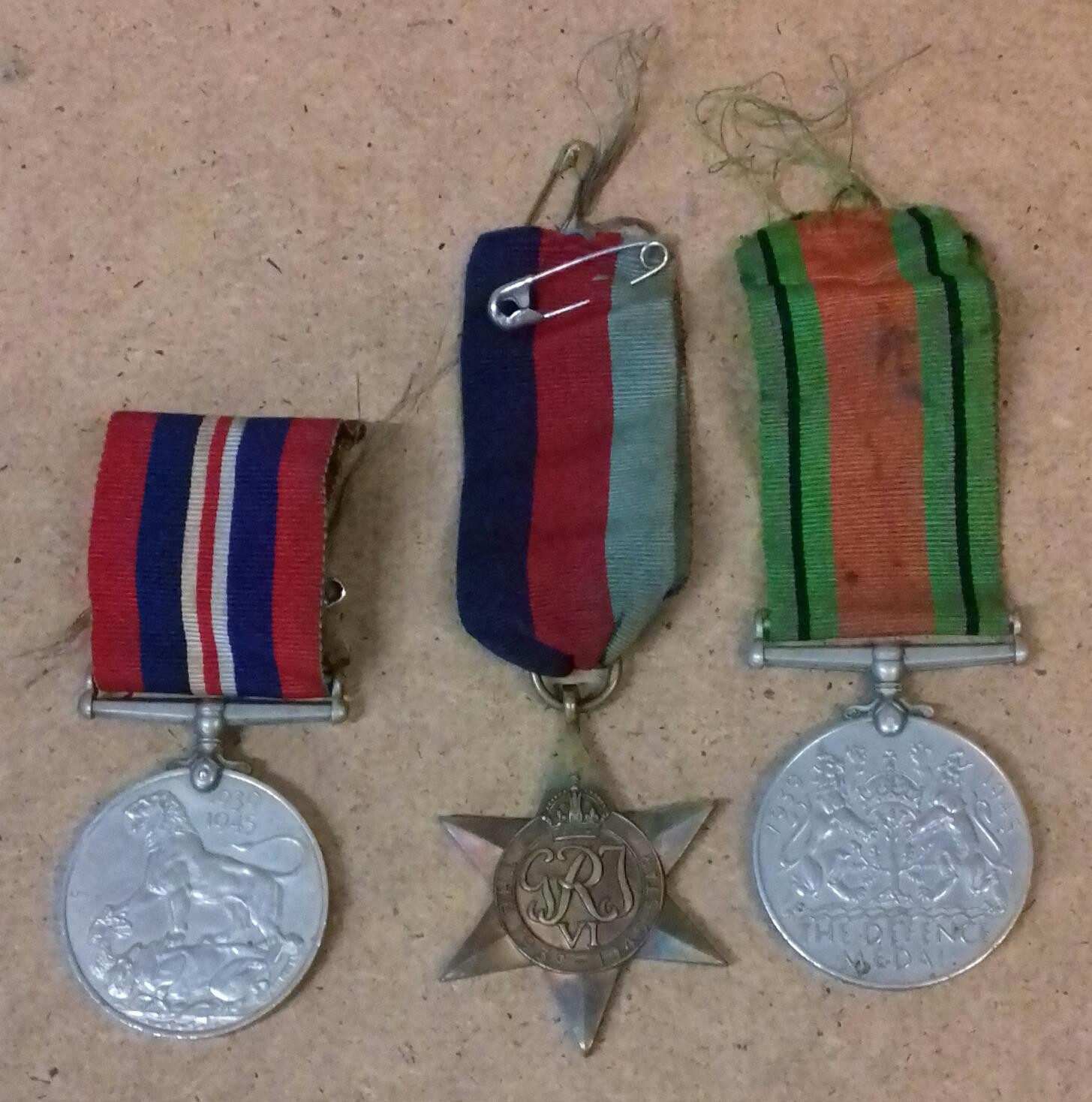 row of 3 x WWII medals being 1939-45 medal, 1939-45 star and defence medal, all with ribbons