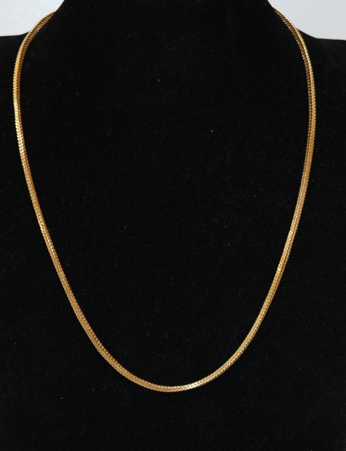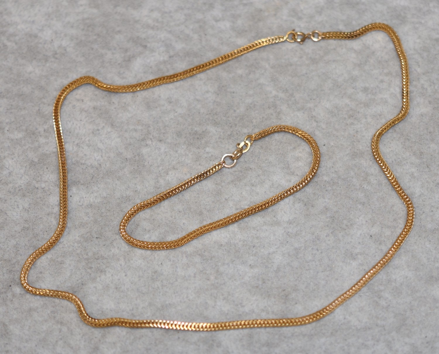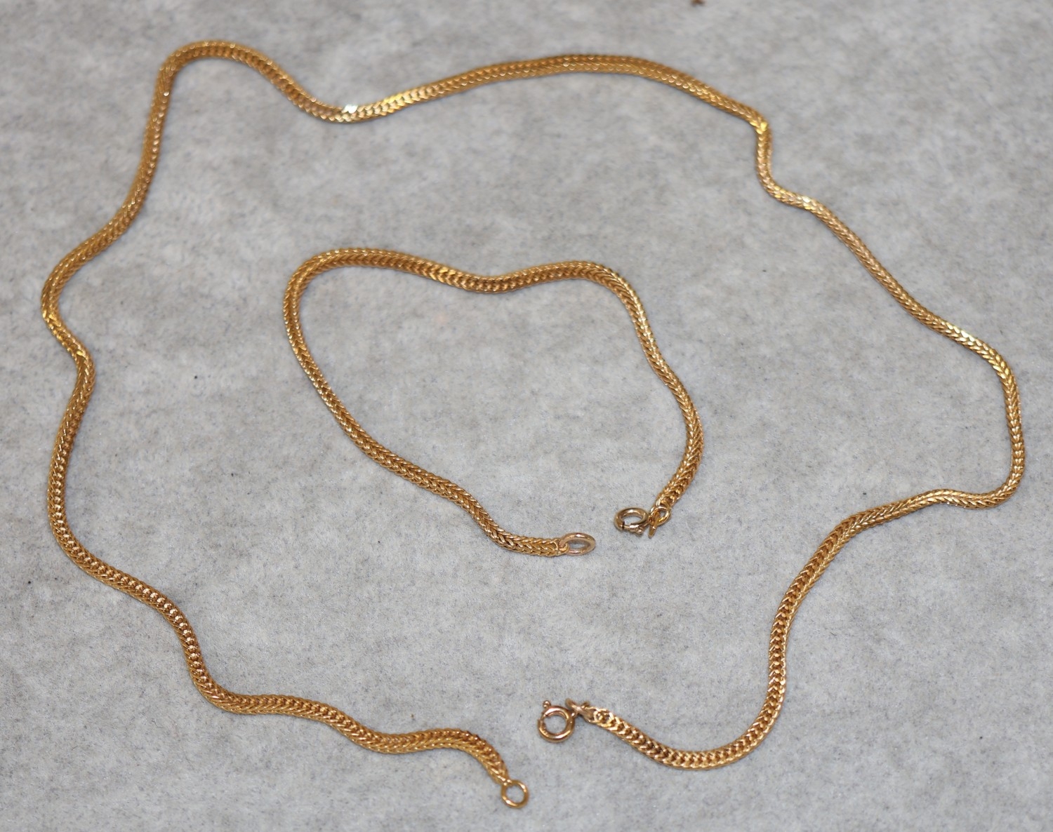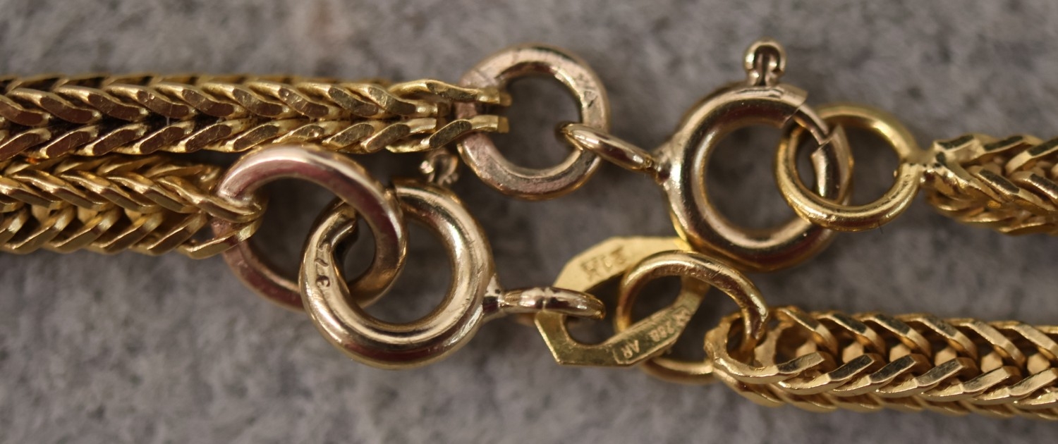 A high carat gold square linked chain, cut to make separate bracelet (bracelet with 9ct gold clasp), 50.5cm long and 19cm long, 28 grams