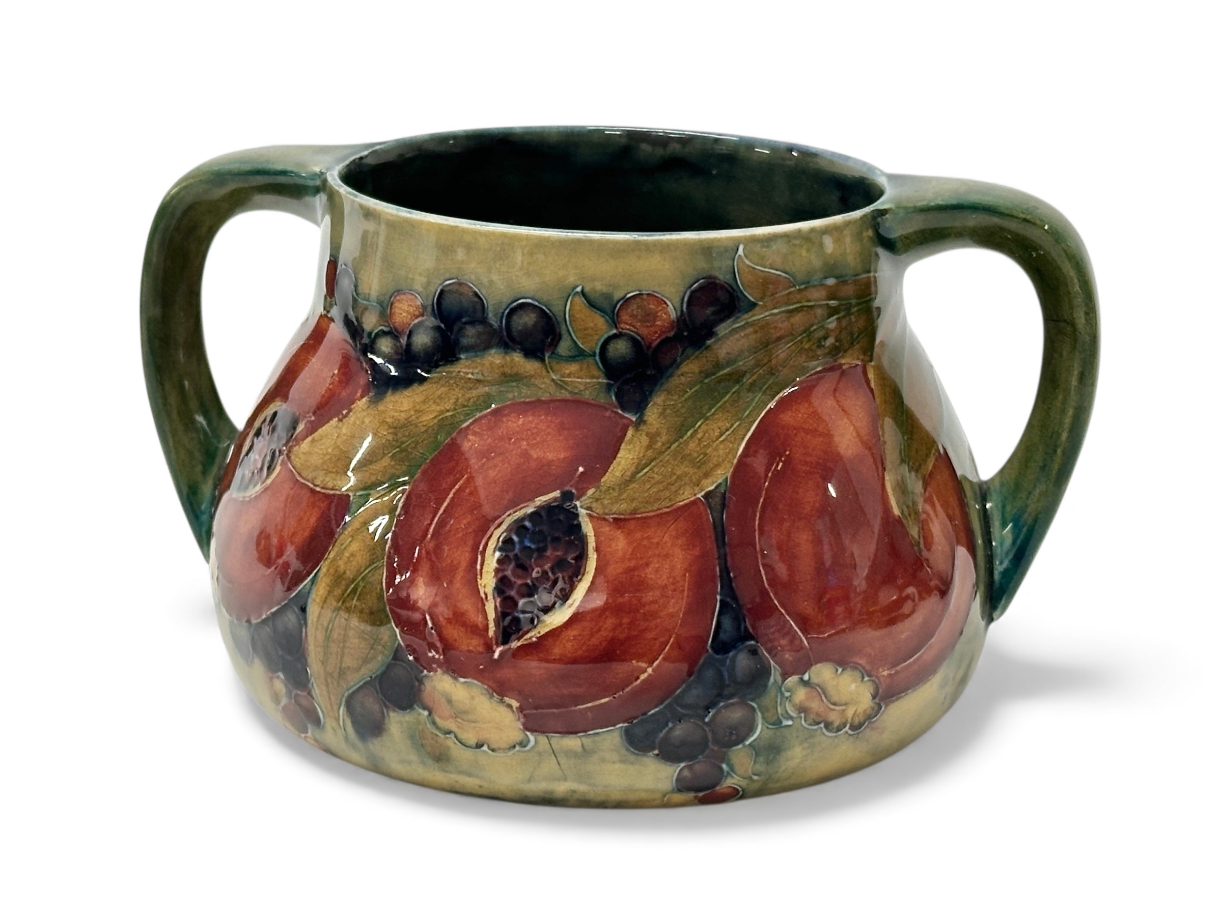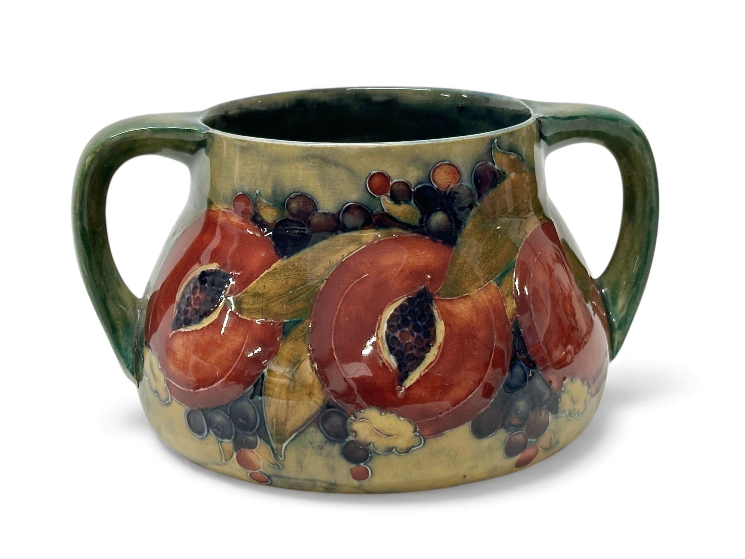 A Moorcroft Pomegranate twin handled vase. 15x12.5x8.5cm.