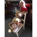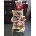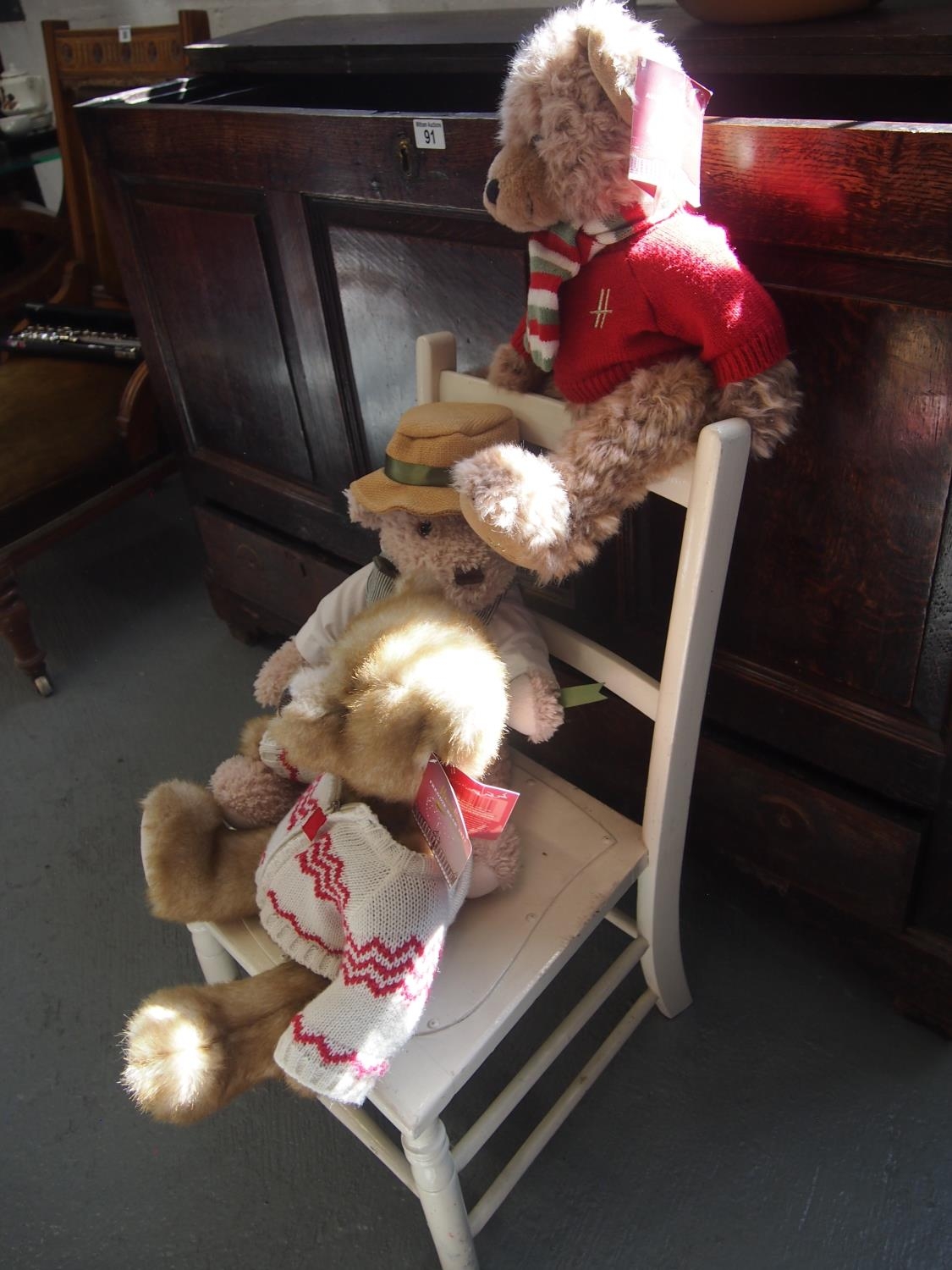 Three Harrods plush teddy bears; The Annual Bear 2009, Archie Bear 2010, Freddie Bear 2011 together with a vintage child's chair