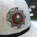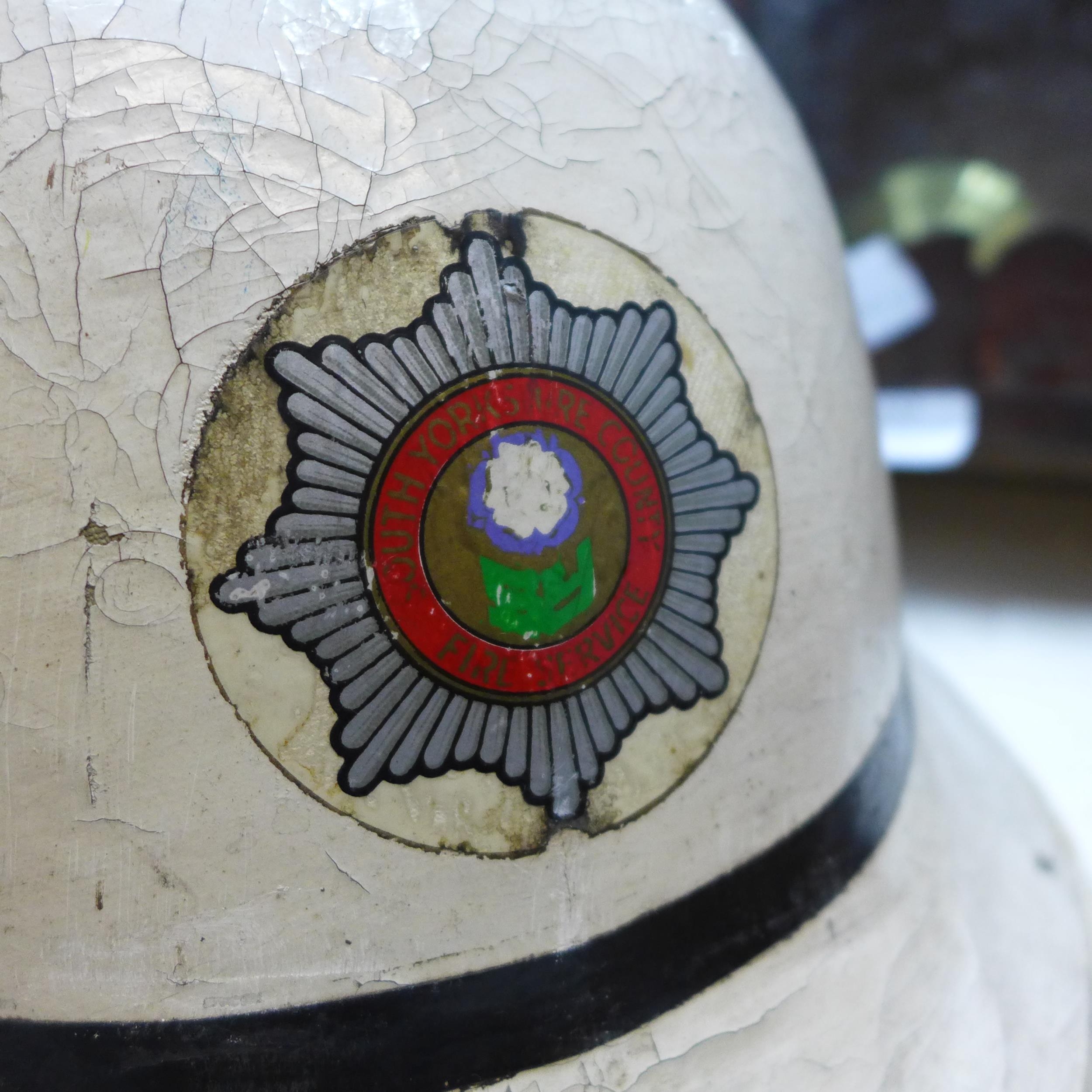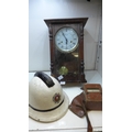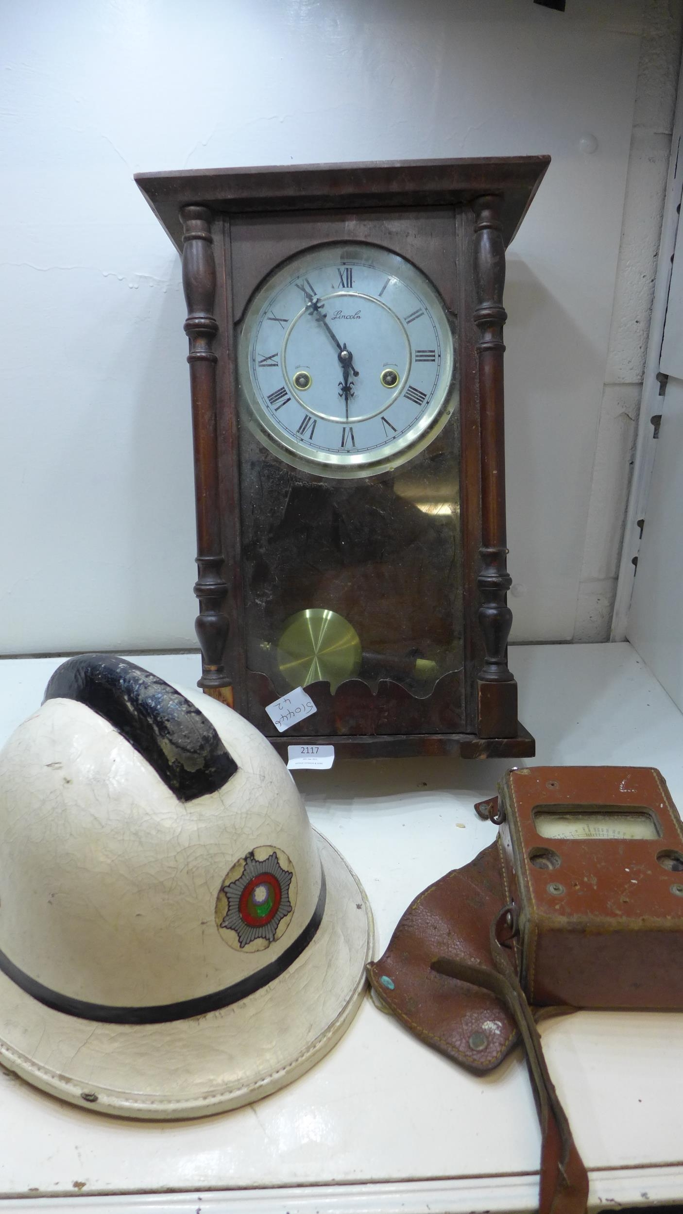 Vintage fireman's helmet (South Yorkshire Fire Service), sold with vintage voltmeter and 18" vintage Lincoln mantle clock
