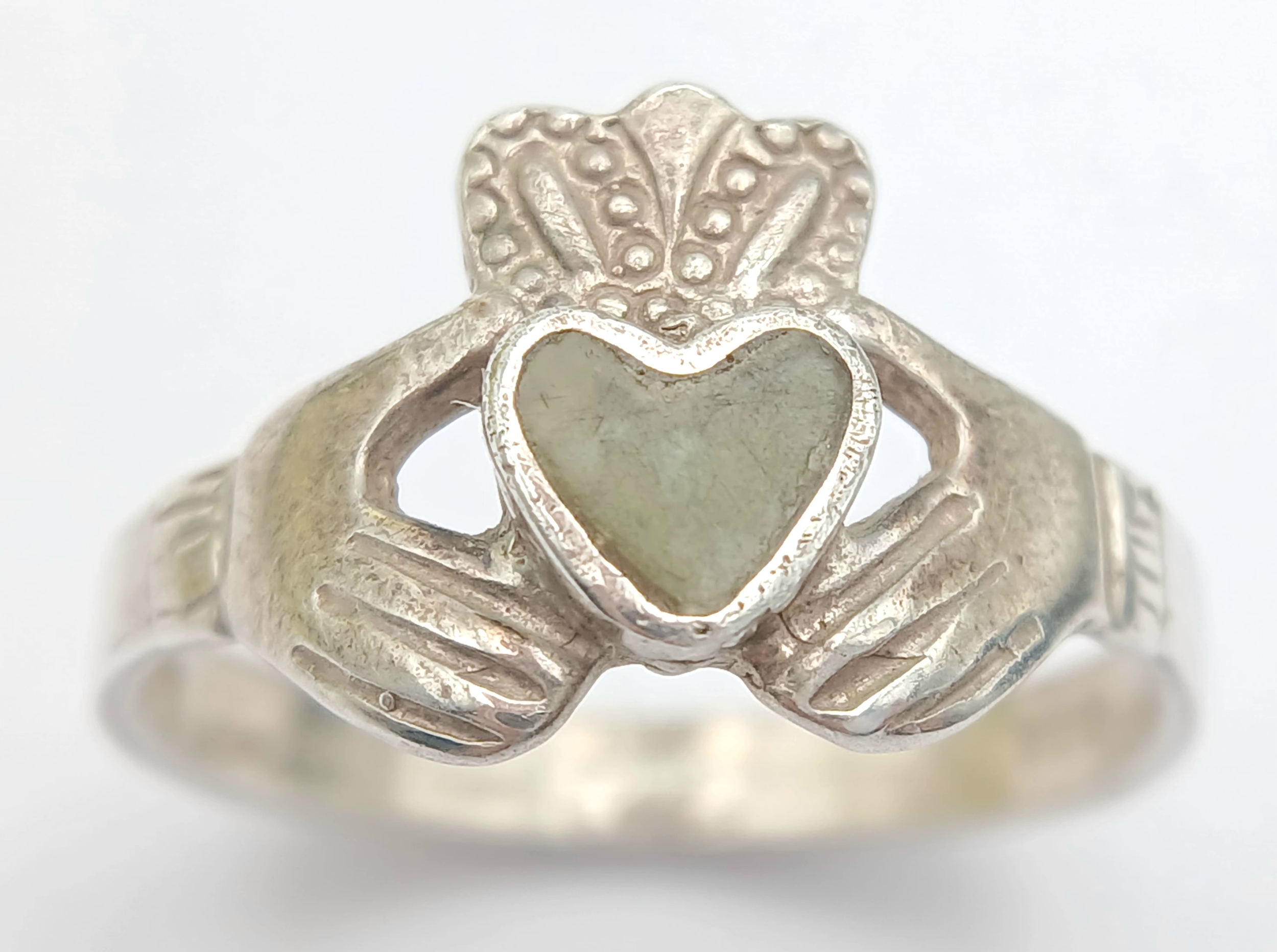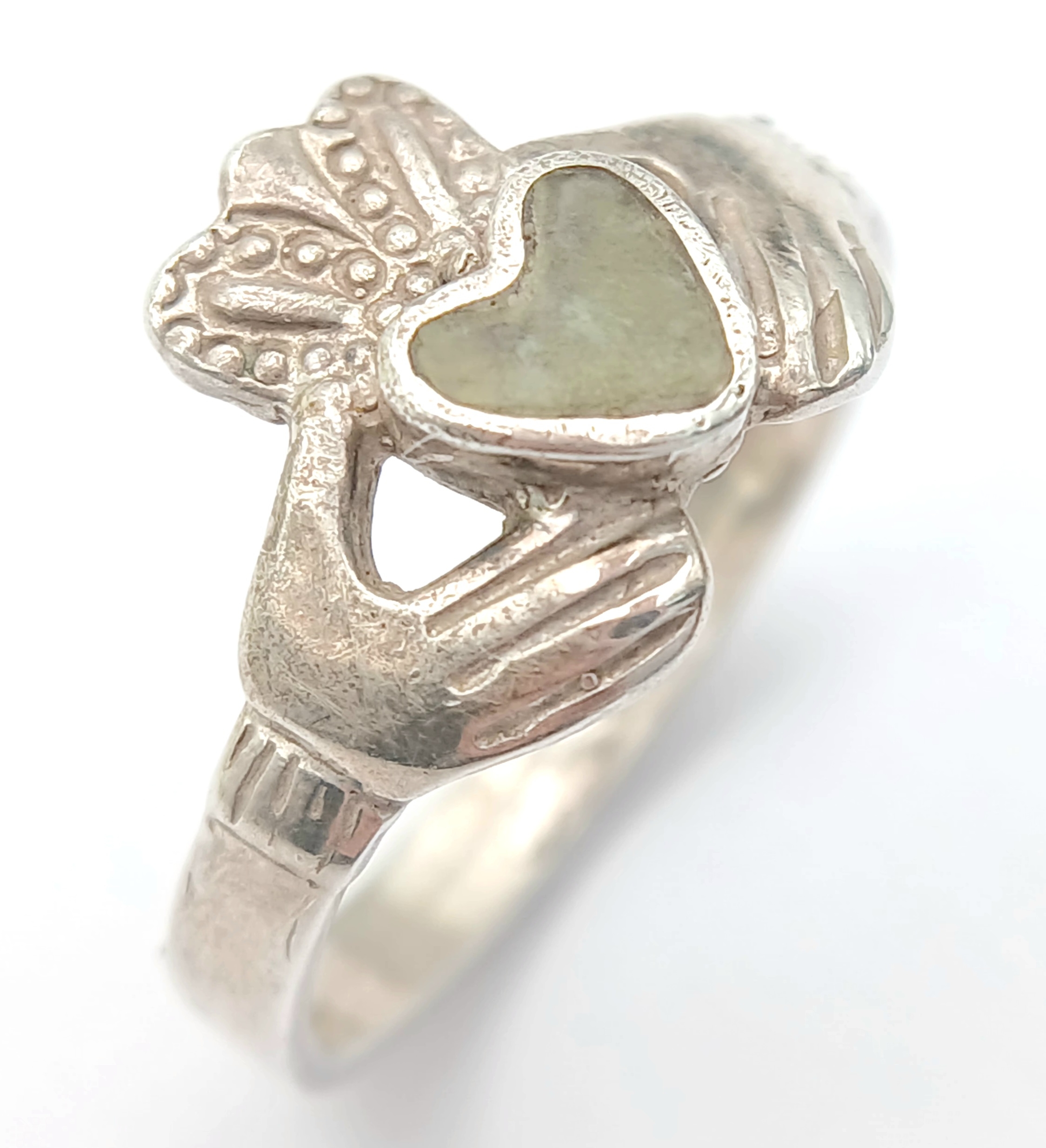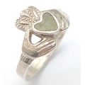 Genuine Vintage SILVER CLADDAGH RING with GREEN CONNEMARA MARBLE . FULL IRISH HALLMARK. Size V - V 1/2. Beautiful Ring, Please see pictures.