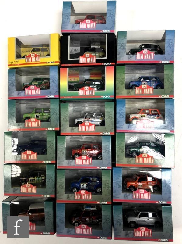 Nineteen Corgi Mini Mania diecast models, to include CC82271 1994 Rover Cooper Sports Pack 50th Anniversary, CC82282 Peter Sellers Morris Mini Cooper, CC82277 Mini Miglia Racing Andrew Worsley, etc., all boxed. (19)