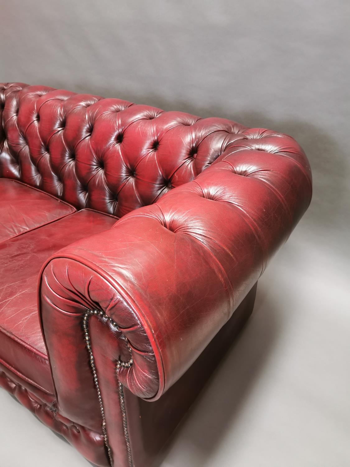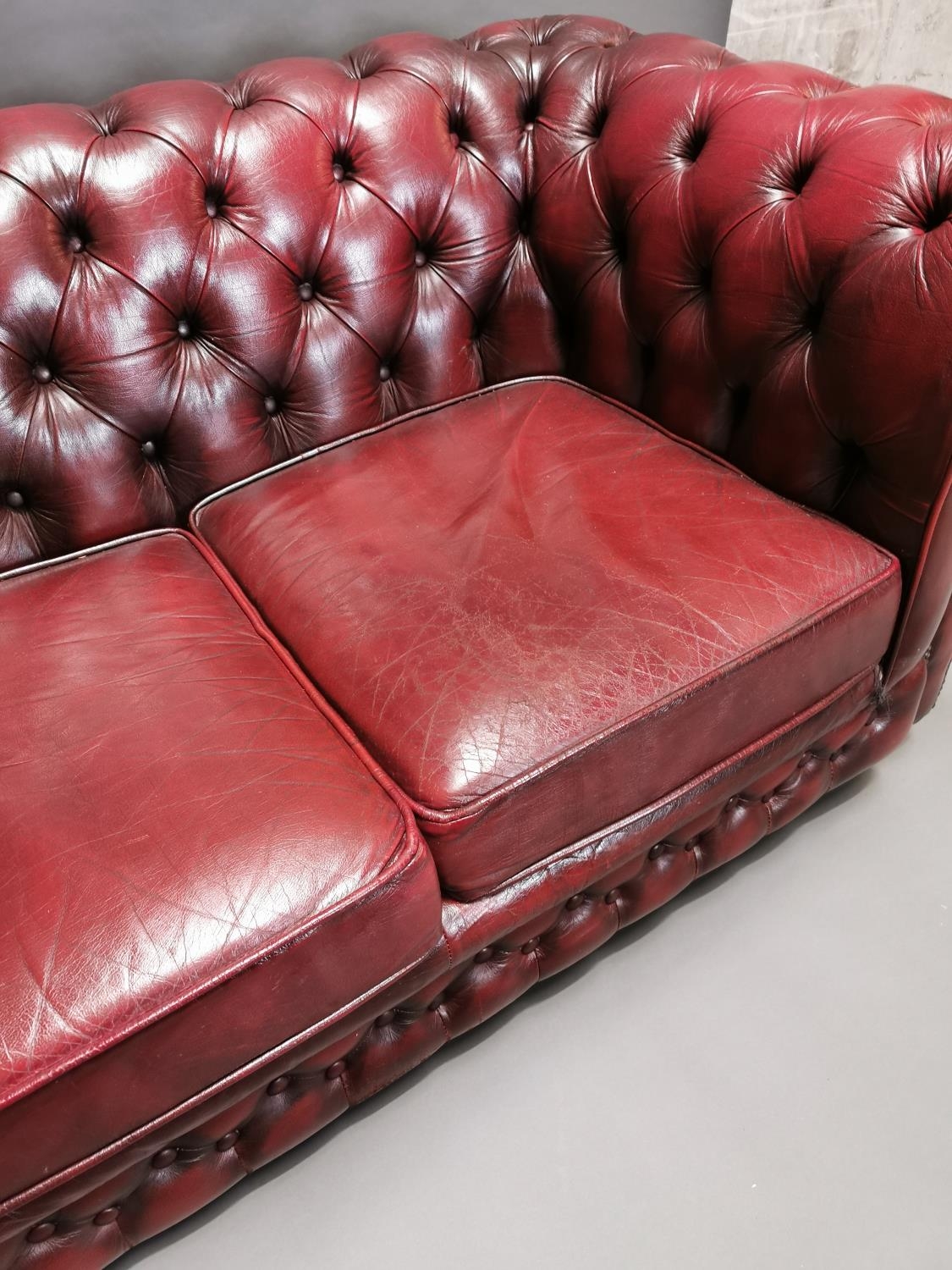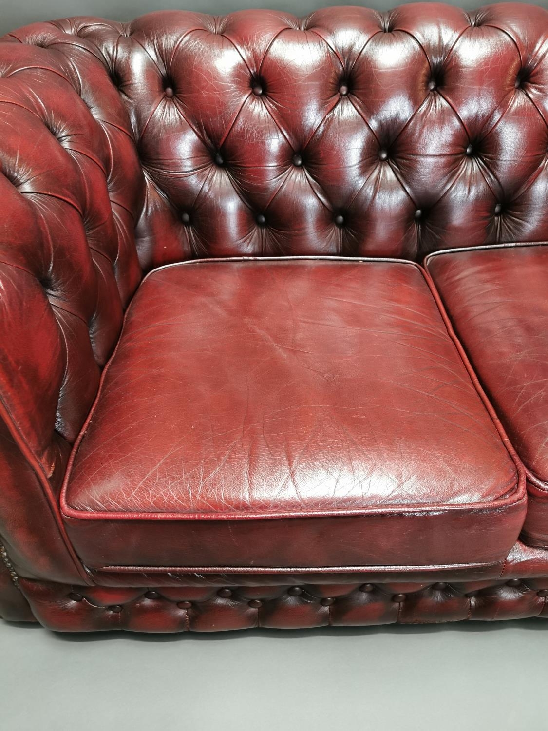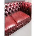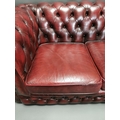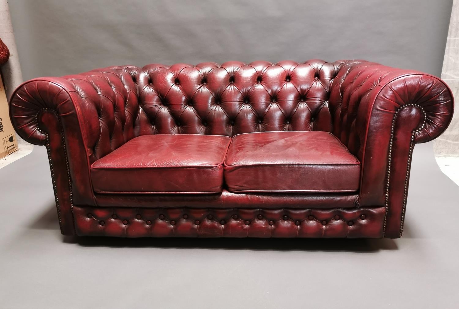 Good quality oxblood leather deep buttoned two seater Chesterfield sofa {66 cm H x 161 cm W x 85 cm D}.