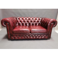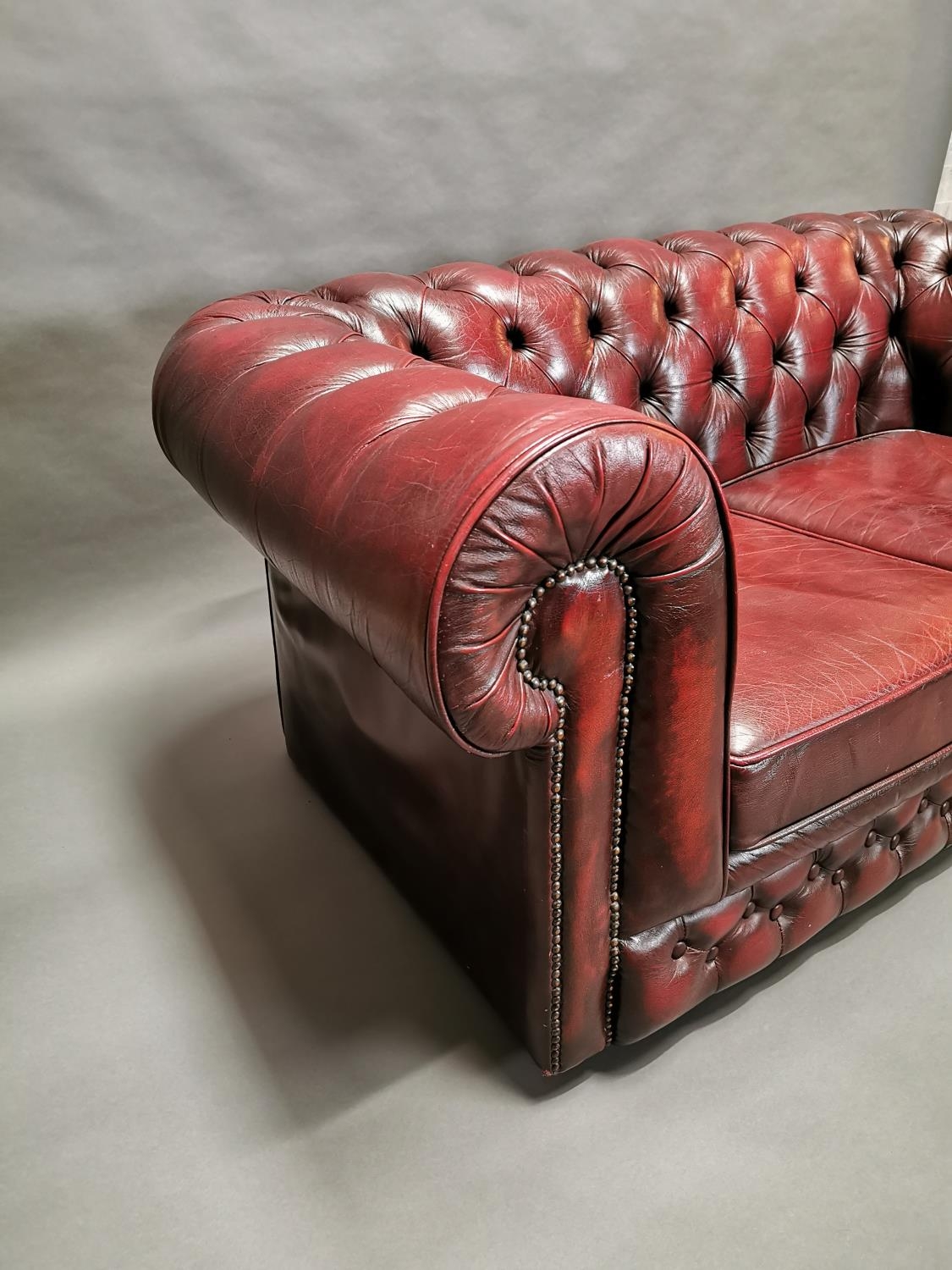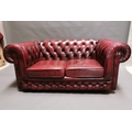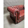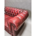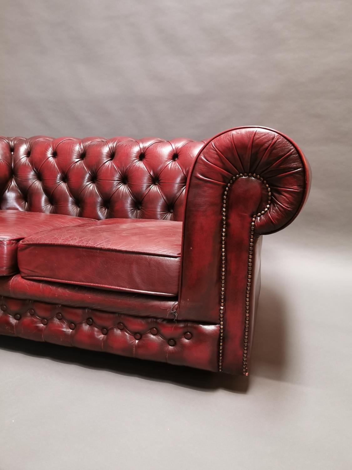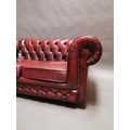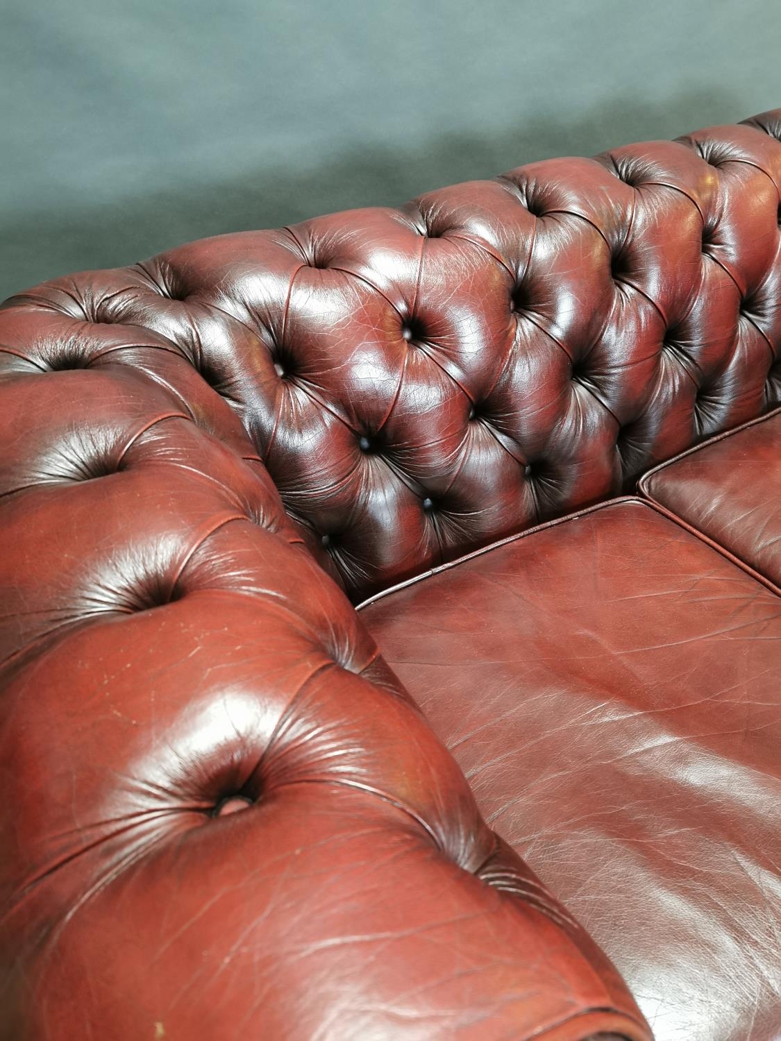 Good quality oxblood leather deep buttoned two seater Chesterfield sofa {66 cm H x 161 cm W x 85 cm D}.