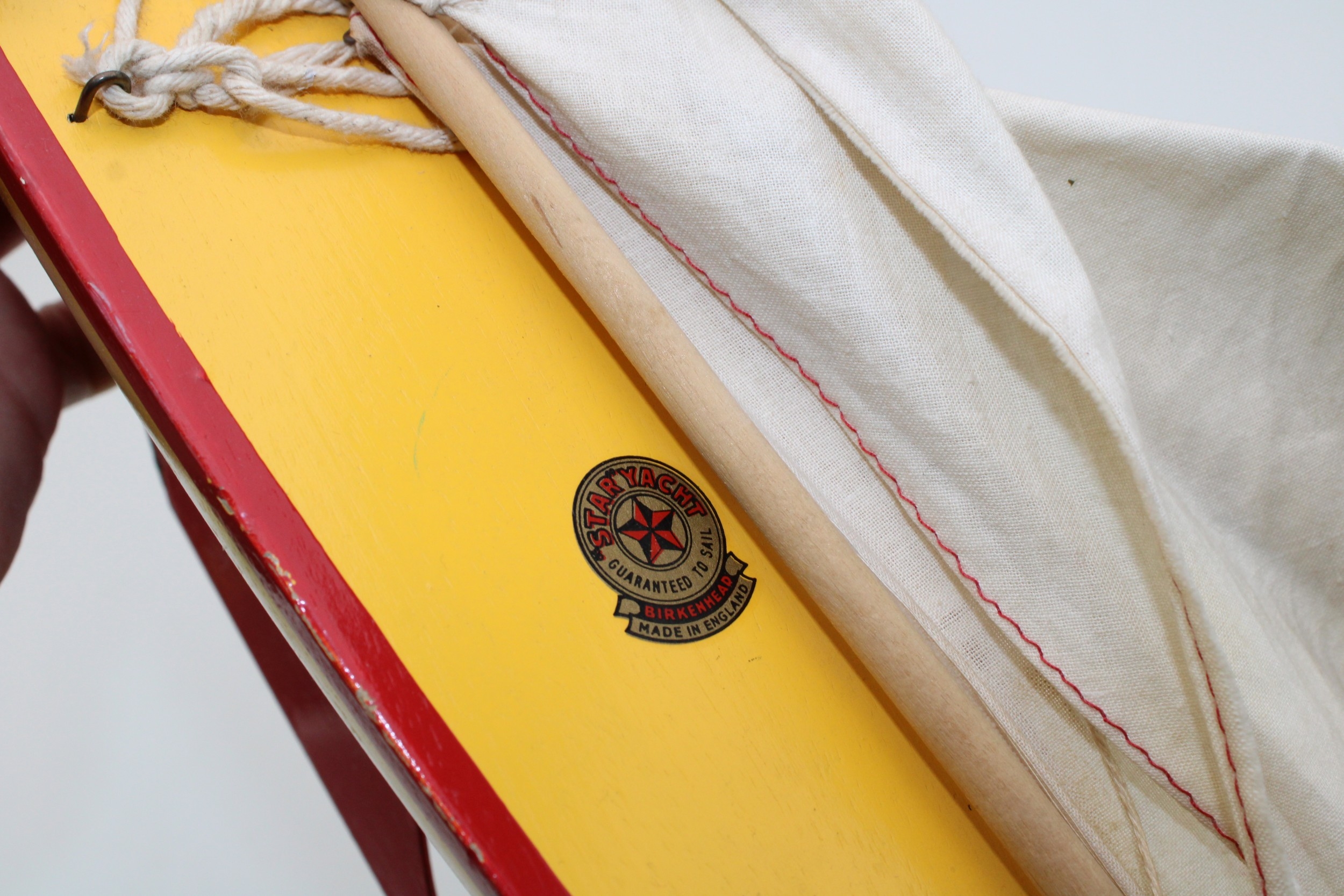 Star Yacht, Birkenhead, pond yacht in yellow and red colour-way, 36cm wide, 47cm tall.