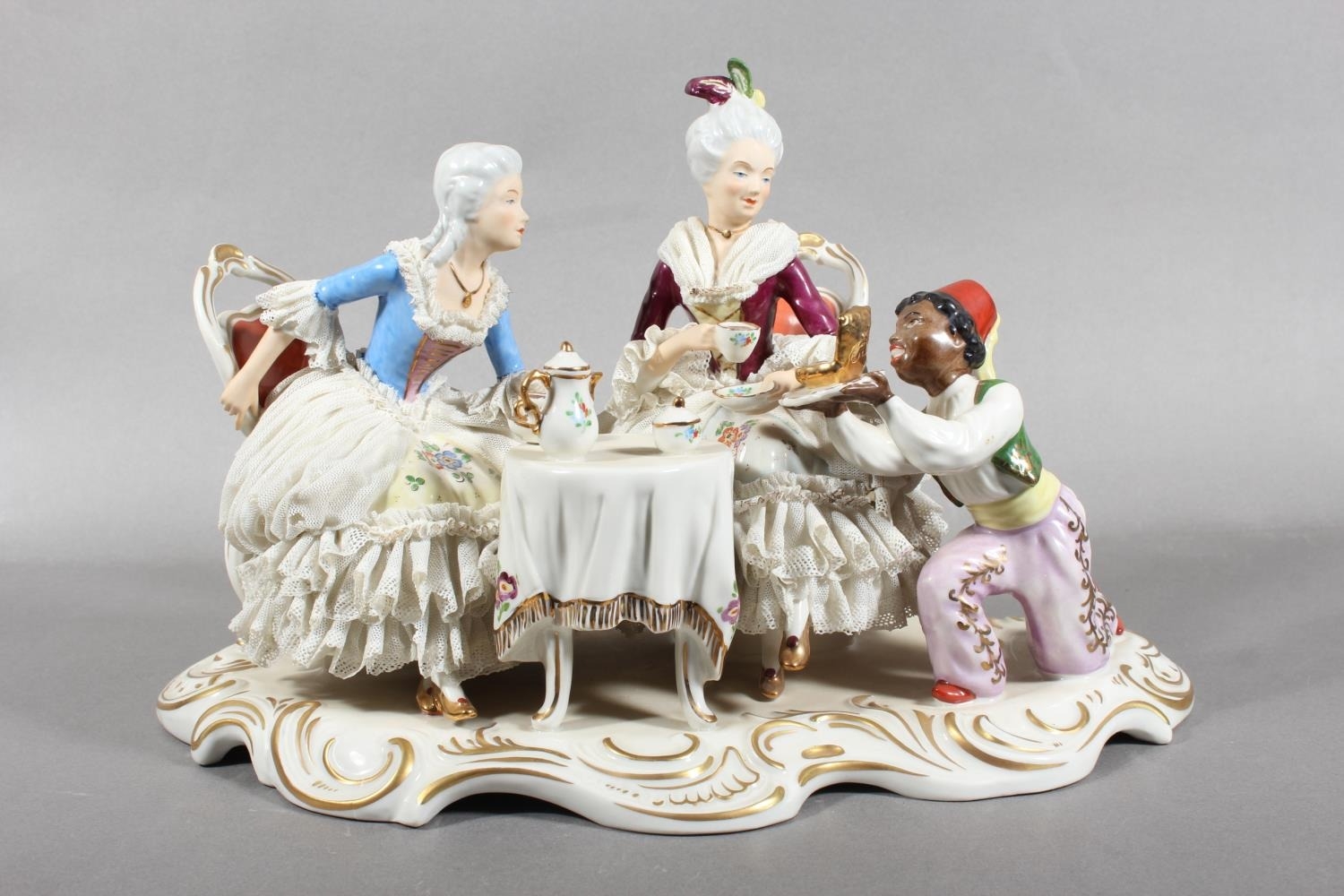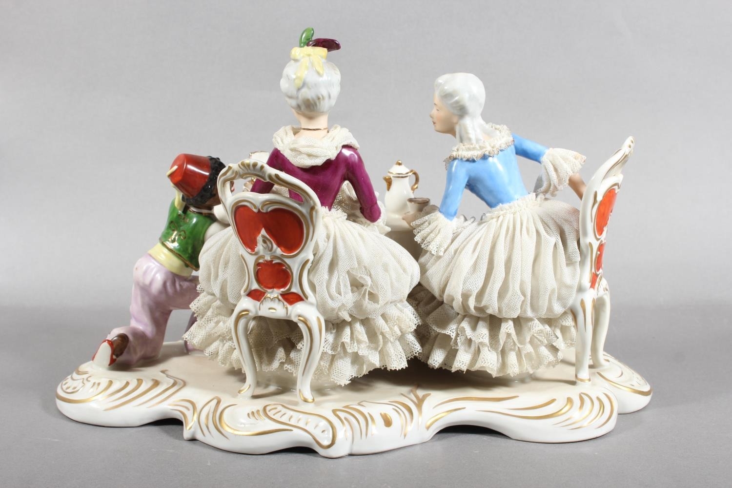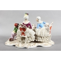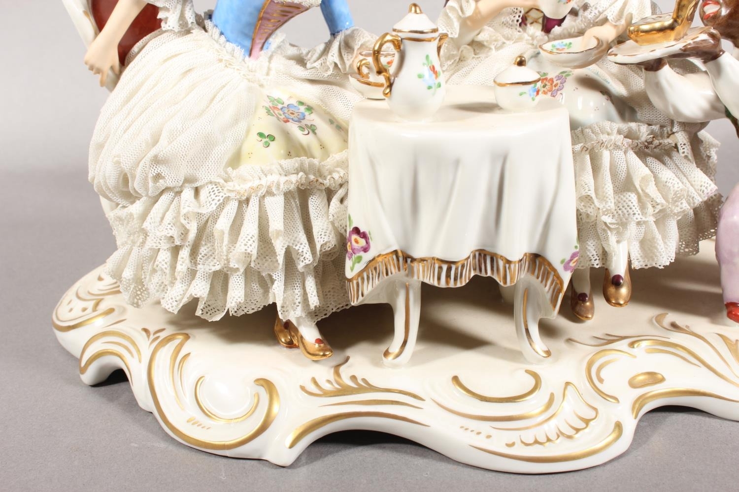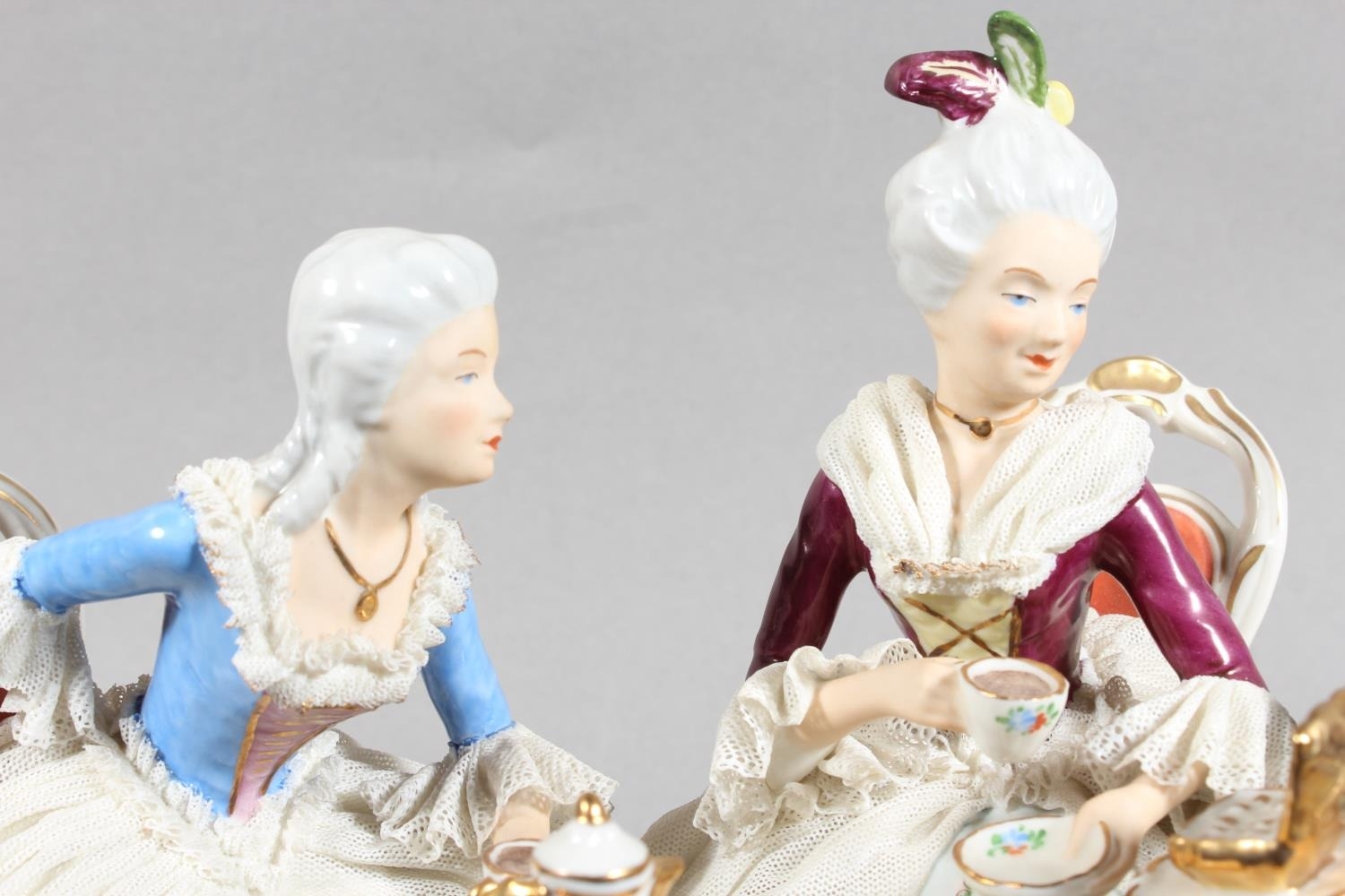 Dresden of Germany figure group depicting a Victorian tea scene.