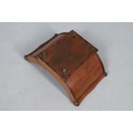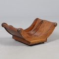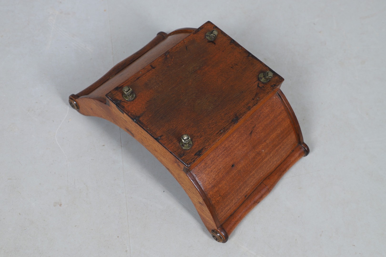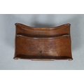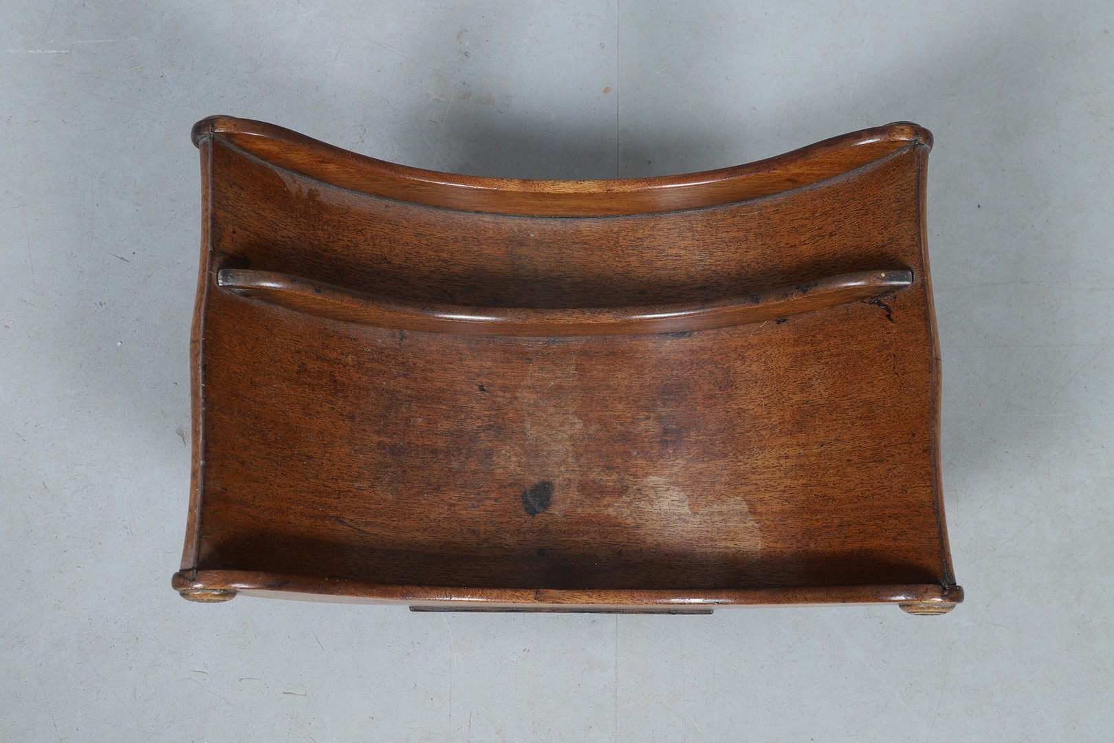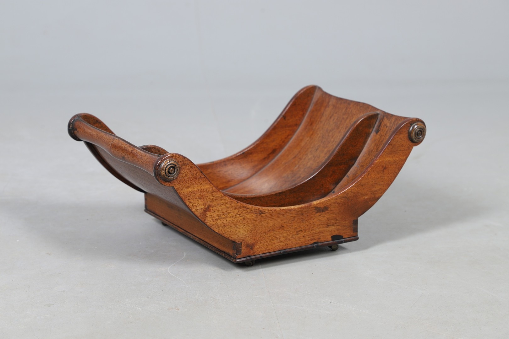 A GEORGE III MAHOGANY CHEESE COASTER. the two divisions with scroll ends and swirl detail, raised on brass casters, 17cm high, 40cm width, 26cm deep.