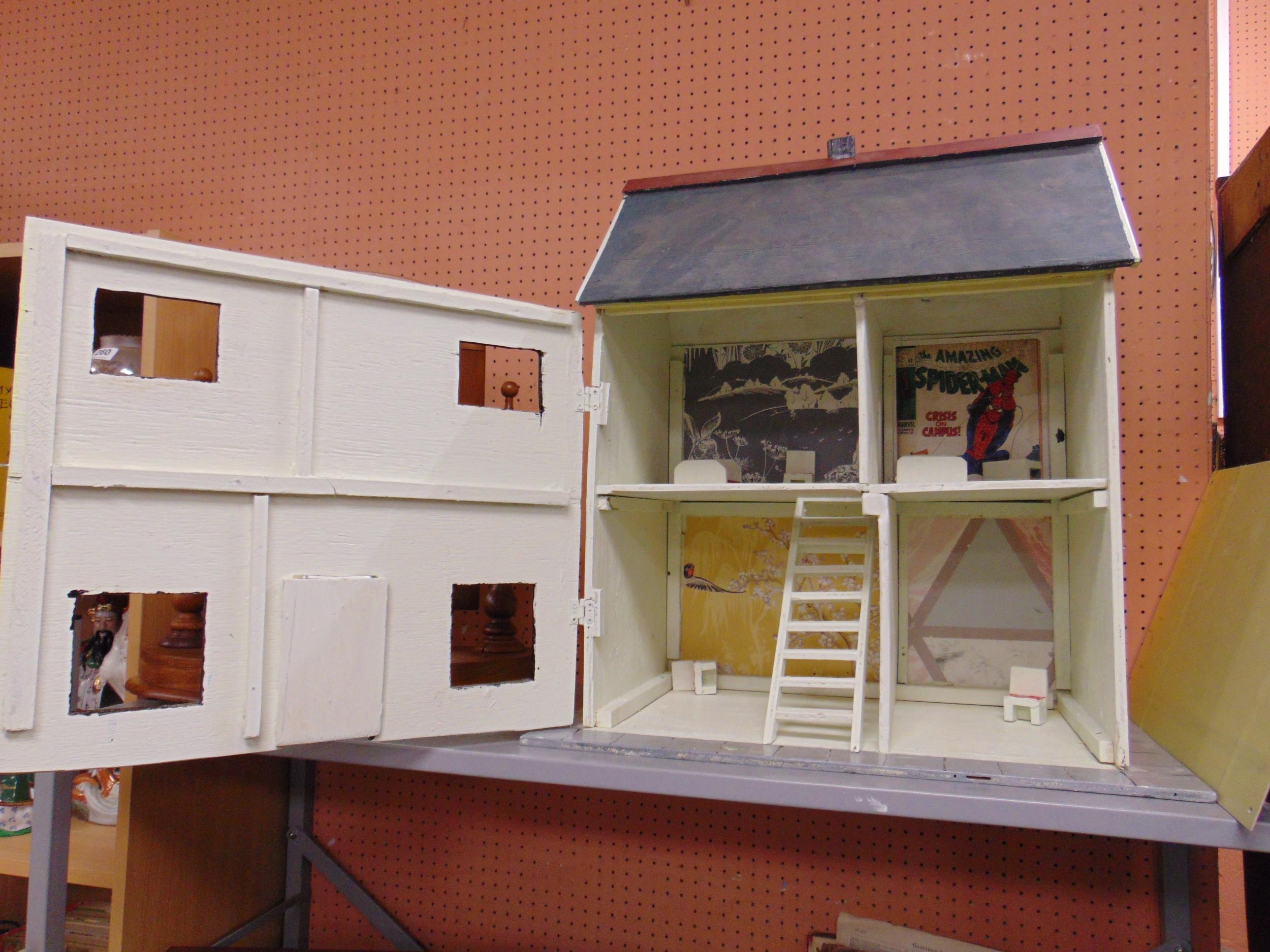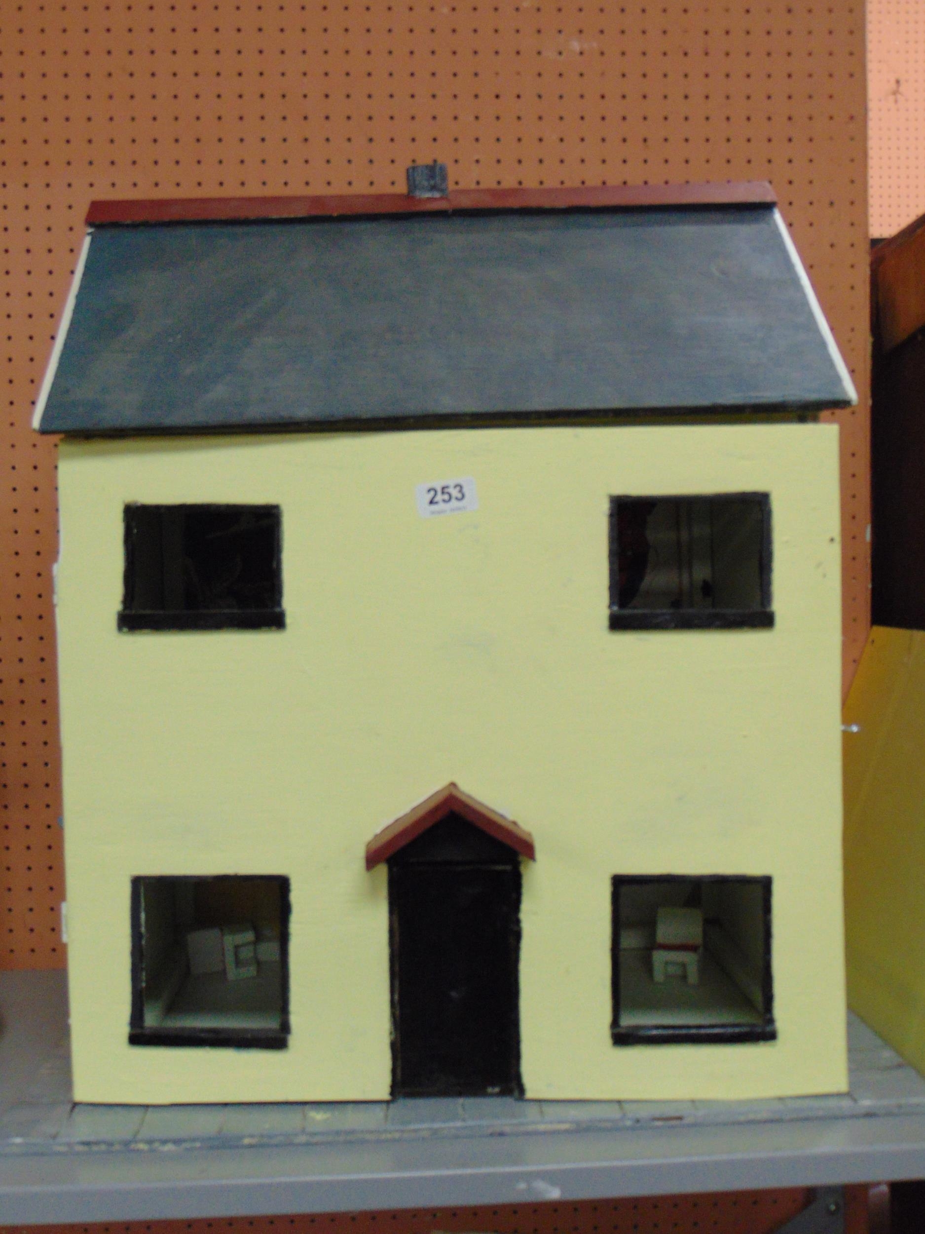 Painted wooden doll's house, 25 x 23 x 14" deep.