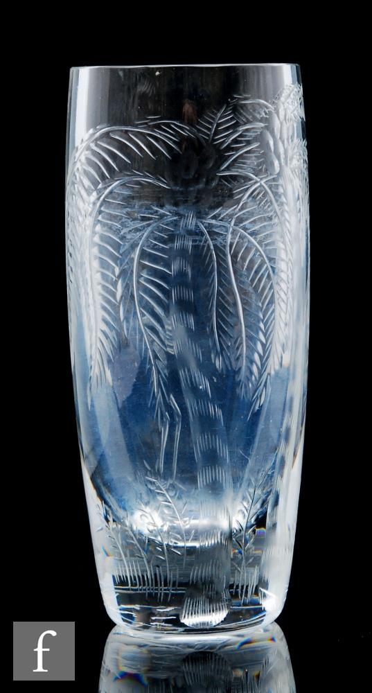 A later 20th Century Stourbridge clear crystal glass vase, later hand engraved by David Smith with a Flamingo amongst palm trees, signed and dated Kinver 1968, height 17cm.