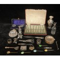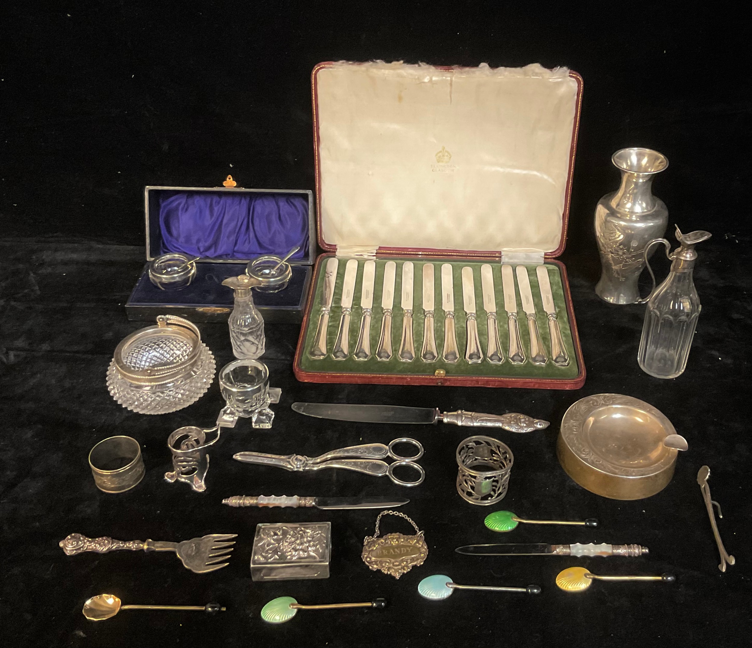 A set of twelve silver hafted butter knives, Sheffield 1910, cased; a silver ashtray, marked 925; a pair of silver mounted salts; a Chinese silver coloured metal vase; a Georgian silver mounted oil bottle; a silver coloured metal matchbox holder; a pair of plated grape shears; other silver and plated ware, qty