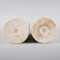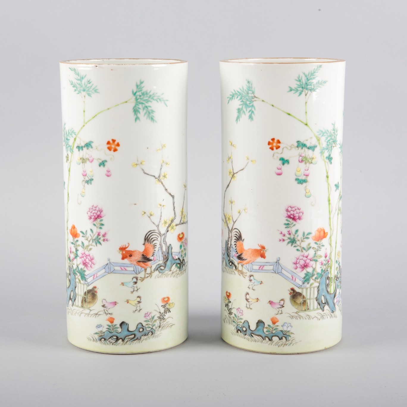 each bearing four character marks to the base, of circular section with gilded rims, decorated with a cockerel, a chicken and chicks in a garden setting, 28cm high x 12.5cm diameter (2)