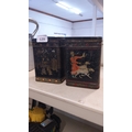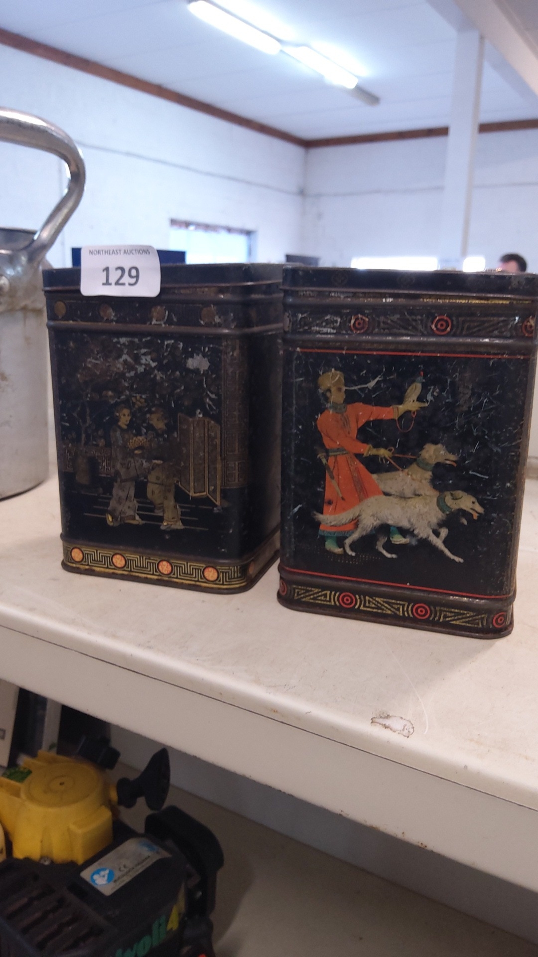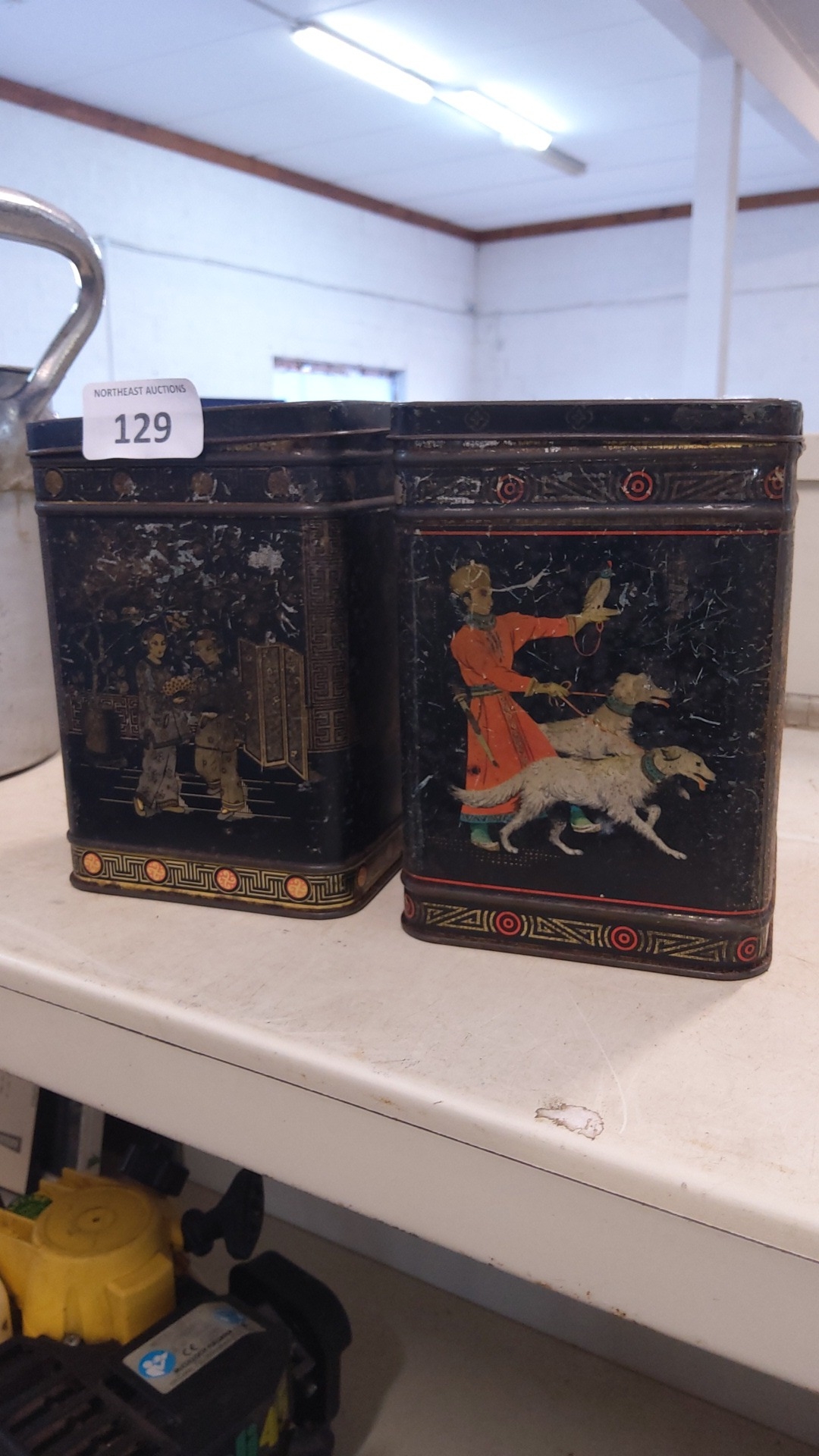 Two chinoiserie-decorated tinplate tea caddies, each of rectangular section with fitted cover.