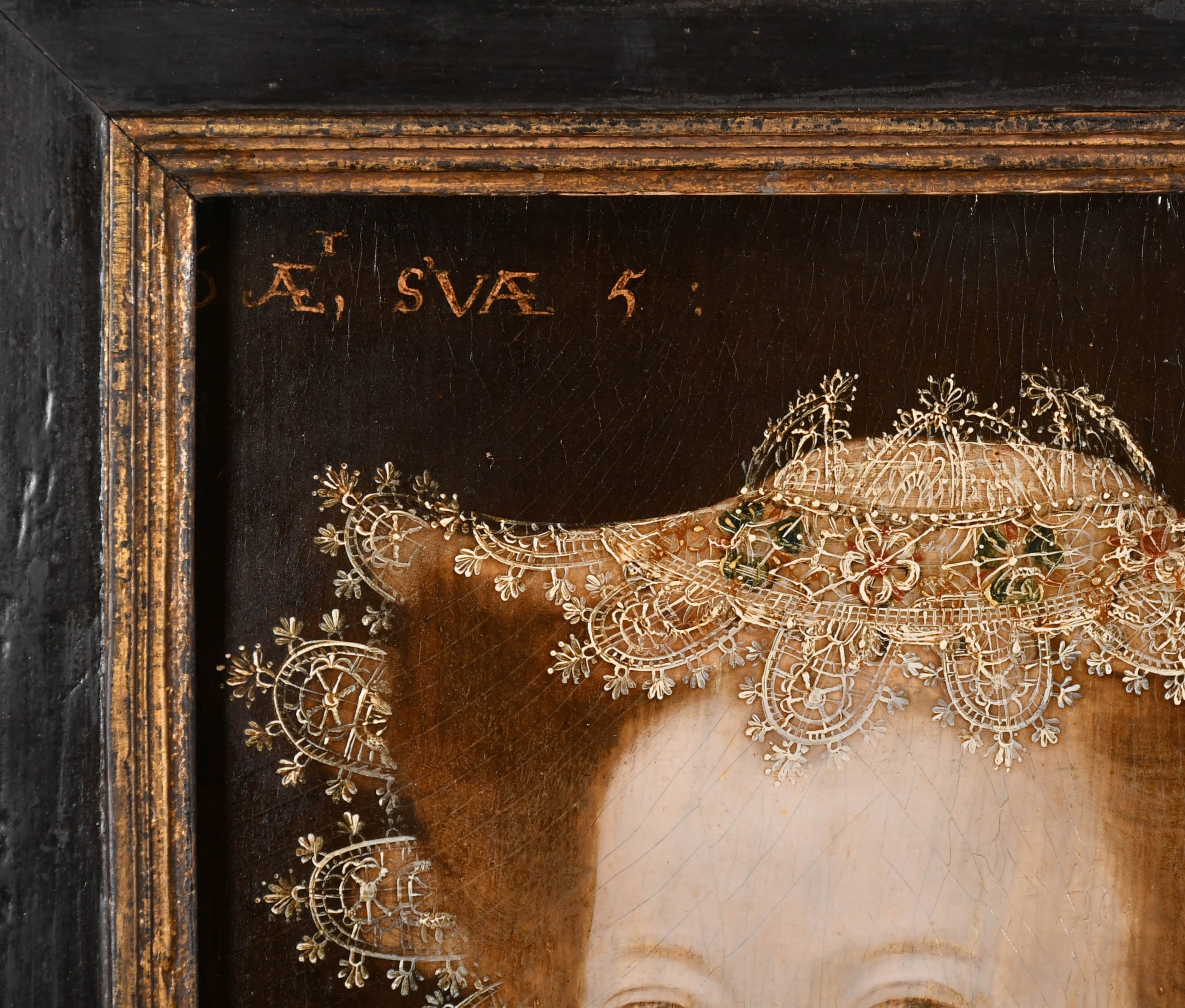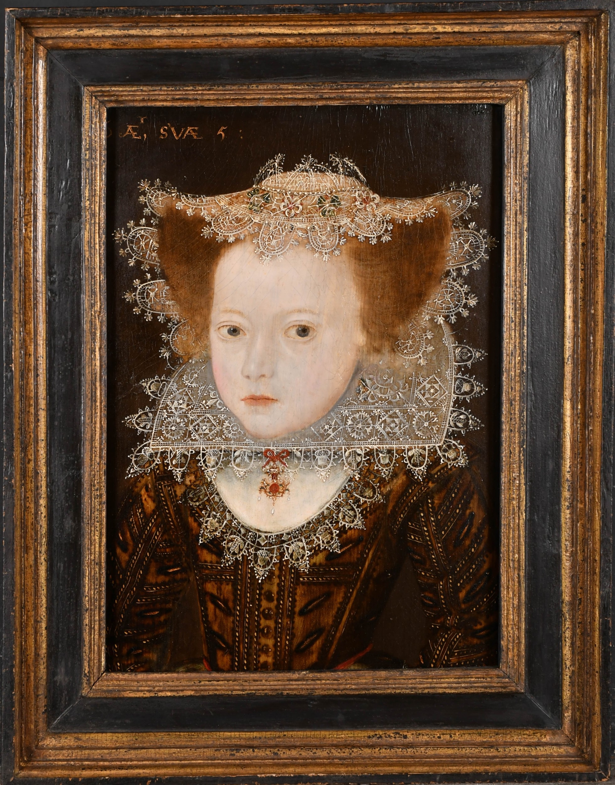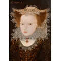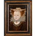 Circle of Robert Peake (1551-1619) British. Portrait of a Girl, half length, in a lace cap and a ruff, Oil on panel, Inscribed ''6 ÆT, SVÆ 5', 15.75" x 11.15" (40 x 28.3cm). Provenance: The Berkeley Collection, Spetchley, Worcestershire. Literature: Spetchley Inventory, 1949, in the Library (as School of Gerhaerdts [sic], Mary Queen of Scots as a child)