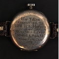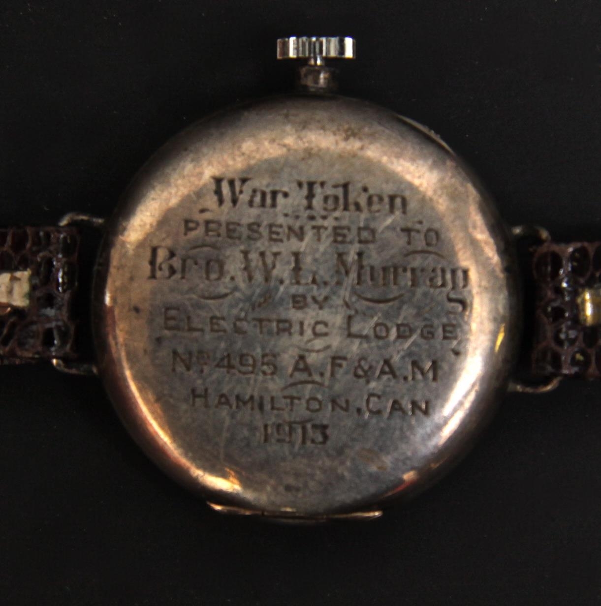 Militaria, World War One Tribute, Canada Waltham wristwatch inscribed to back War Token, presented to, Bro W.L.Murray, by Electric Lodge, 495 A.F&.A.M, Hamilton Can 1915, replacement winder