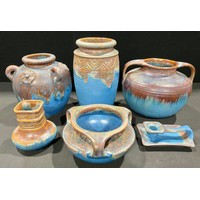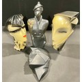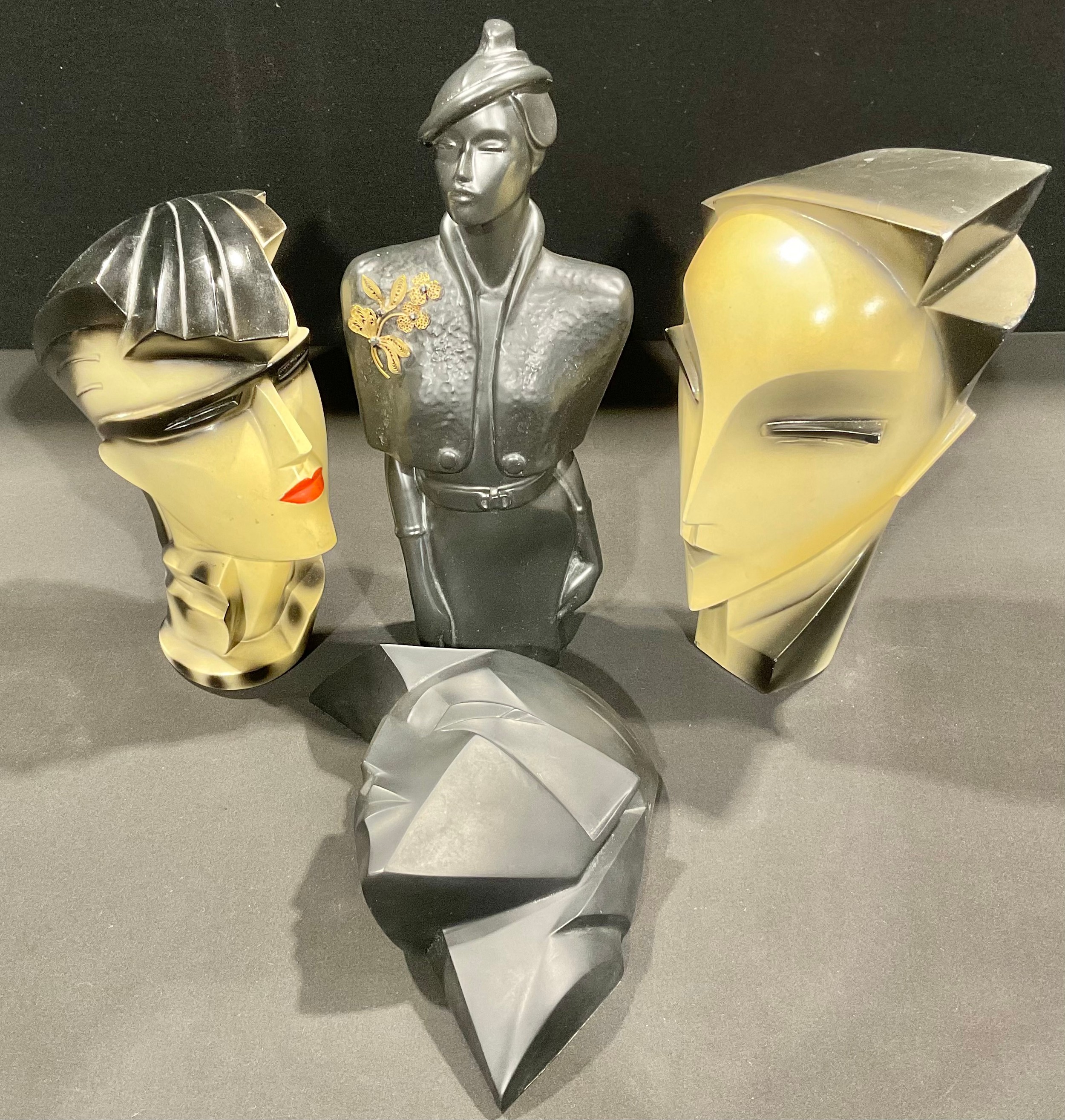 A Lindsey Balkwill Art Deco Revival plaster cast head, Myng, modelled as of a lady of fashion, with angular features in tones of black and cream, signed in the maquette, 33cm high, c.1984; another, Irmgard, 29cm high; a similar rubberoid wall mask, 27cm high, c.1986; etc (4)