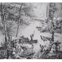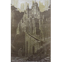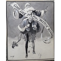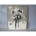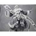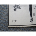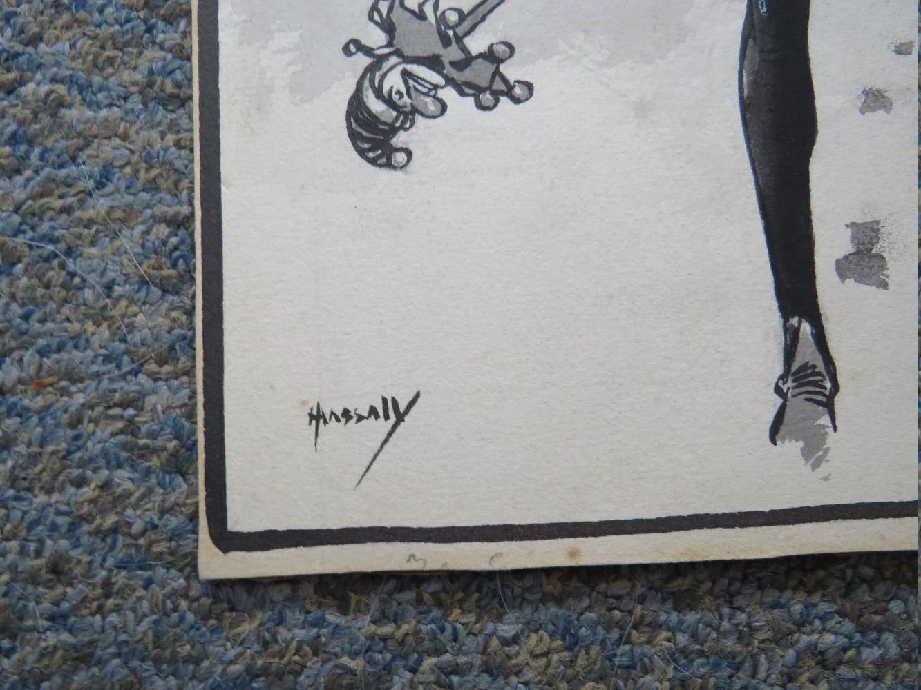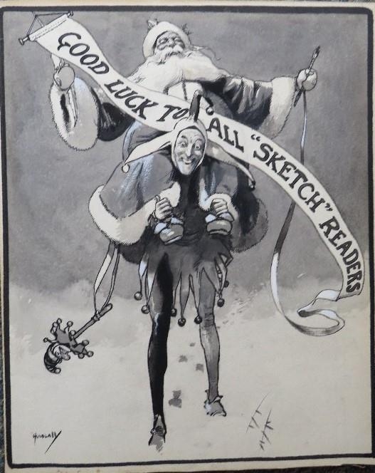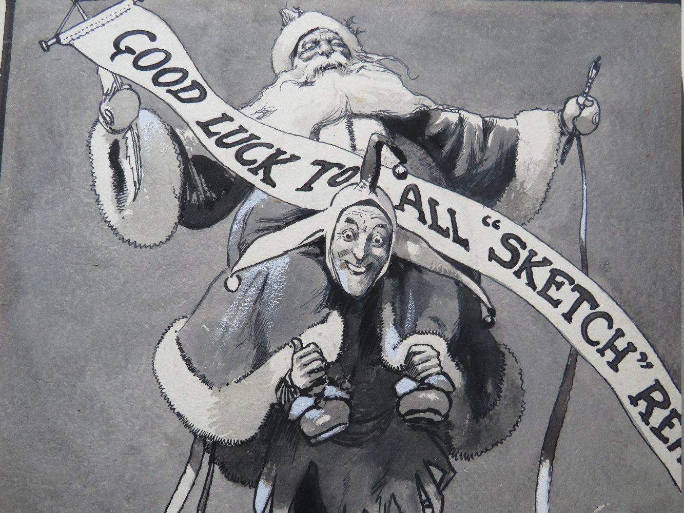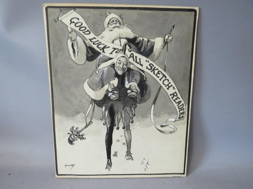 JOHN HASSALL (168-1948). A monotone illustration with a jester carrying Father Christmas 'Good Luck To All Sketch Readers', signed lower left, mixed media on paper, unframed, 29 x 23 cm
