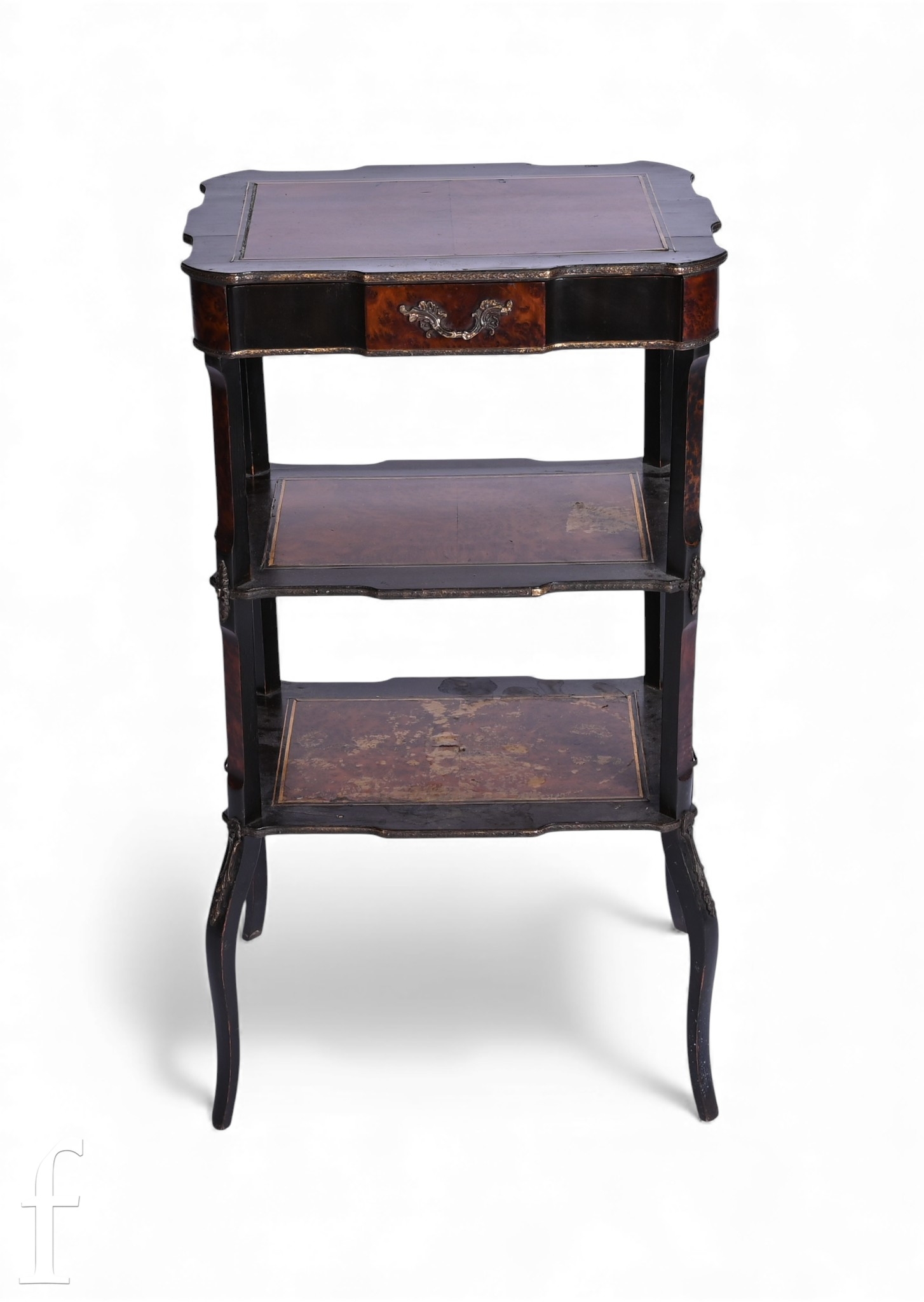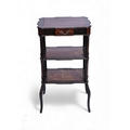 A late Victorian three tier walnut and ebonised whatnot, single frieze drawer, gilt metal mounts, on slender legs, height 70cm x depth 32cm x width 40cm.