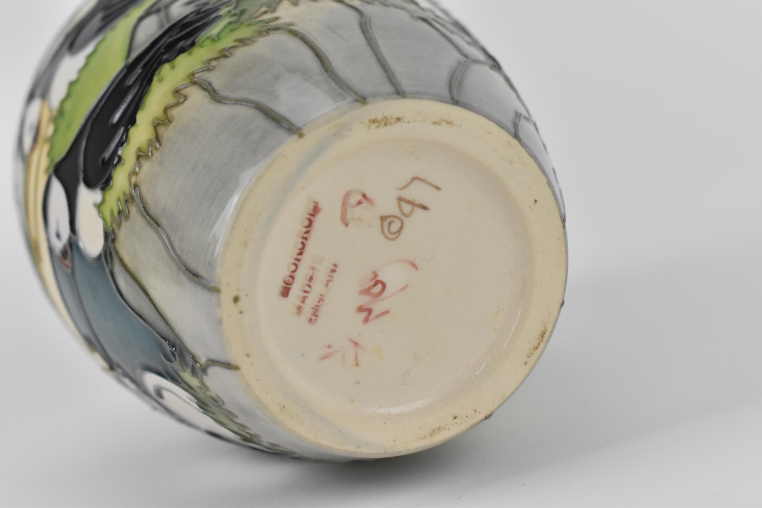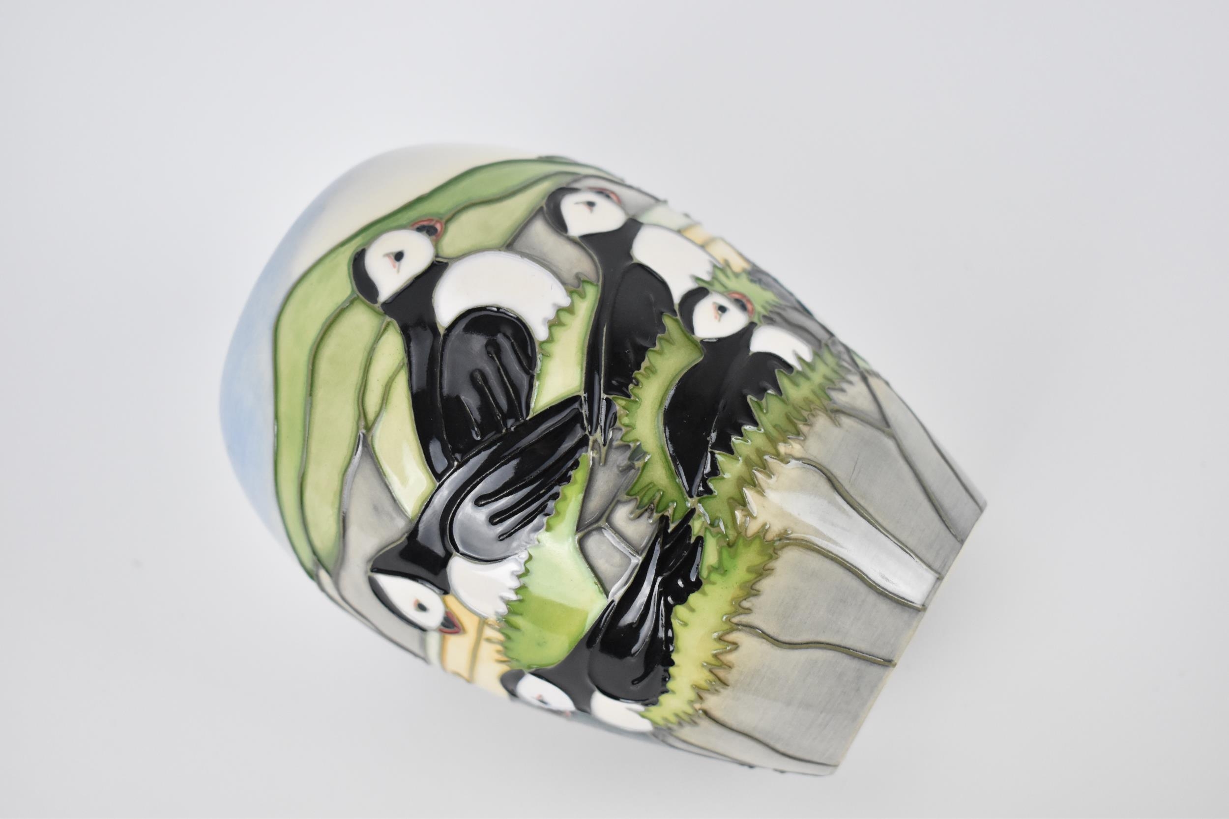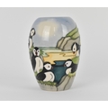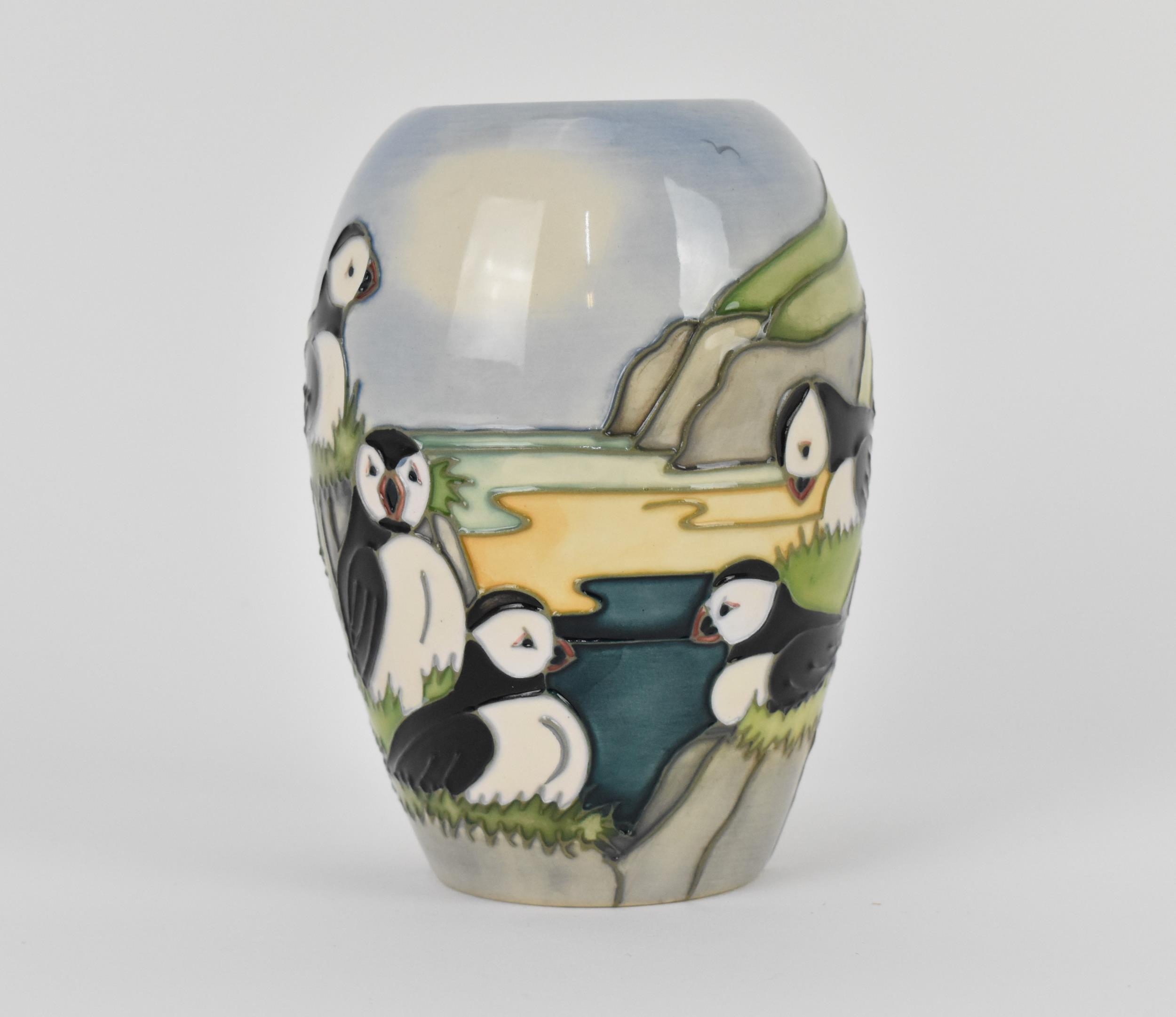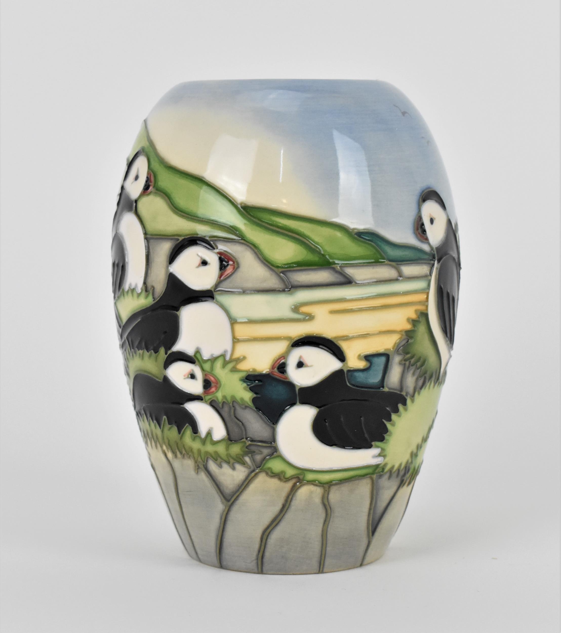 A Moorcroft ceramic baluster vase in the 'Puffin' pattern designed by Carol Lovett, 1997, with impressed marks and signatures to underside, 14 cm high