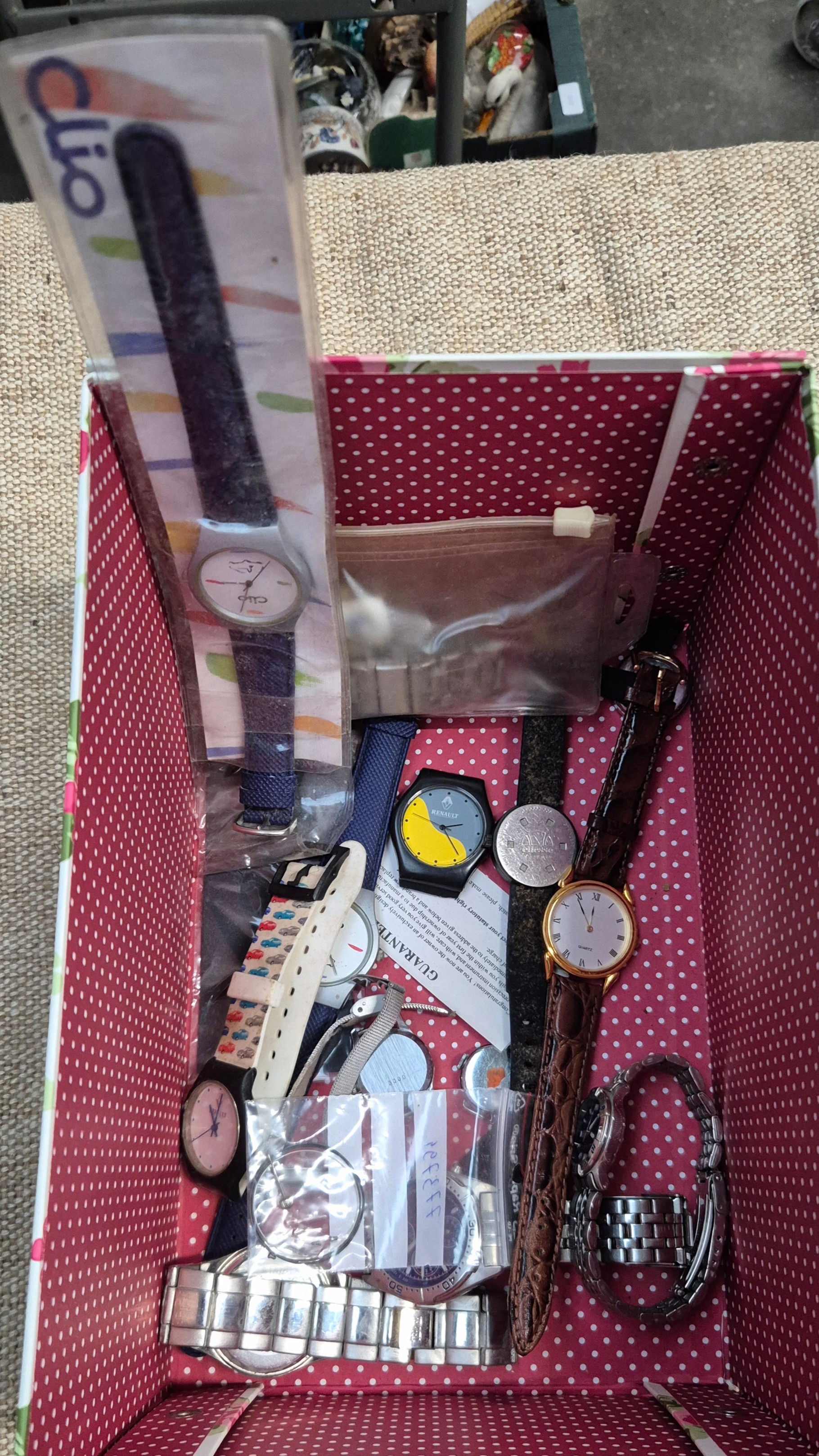 A Box of watches, Ladies & Gents Seiko MX5's, Tw Bijoux Terner watches, Three novelty Renault watches and a small Calvin Klein watch etc