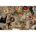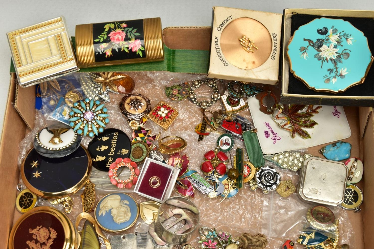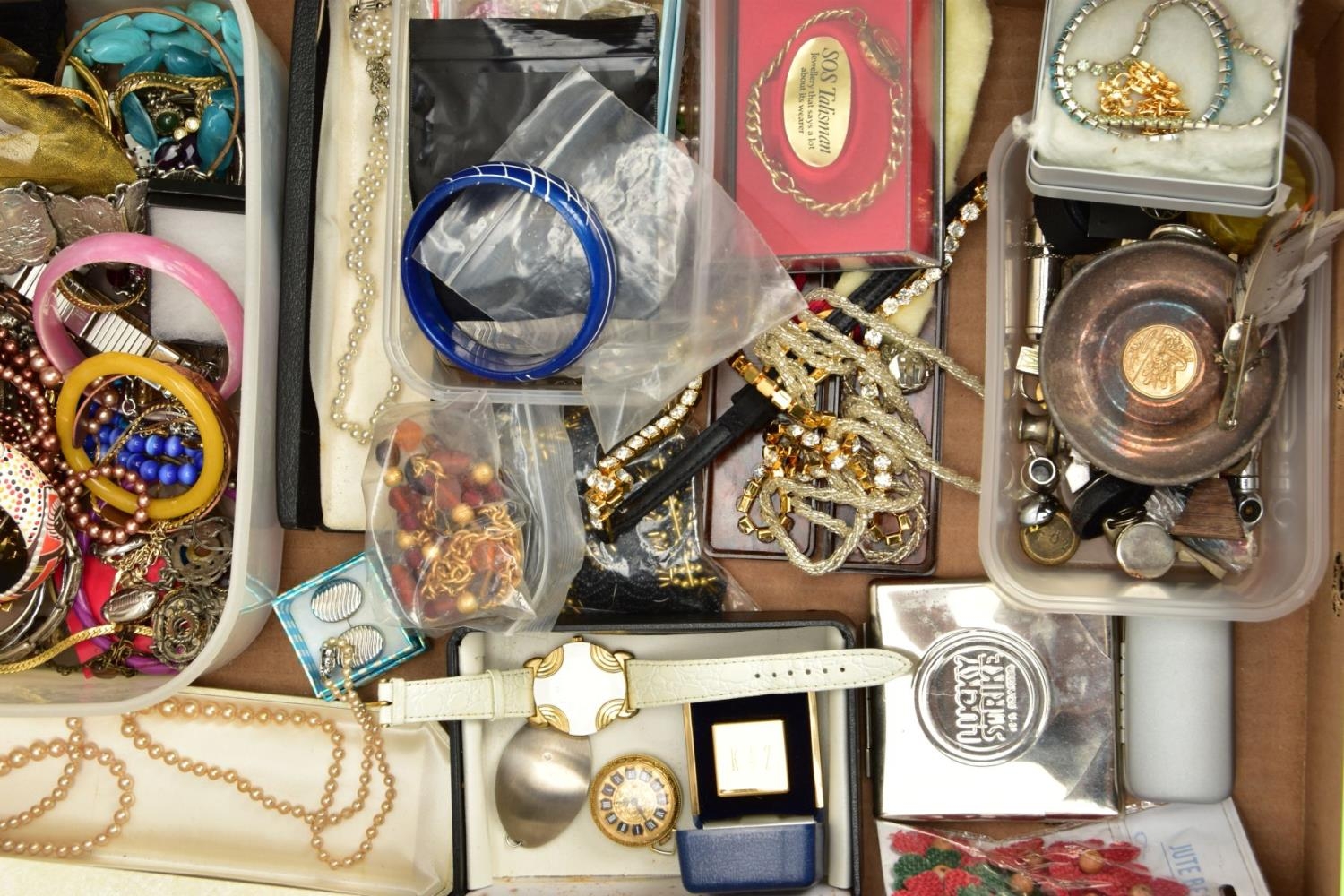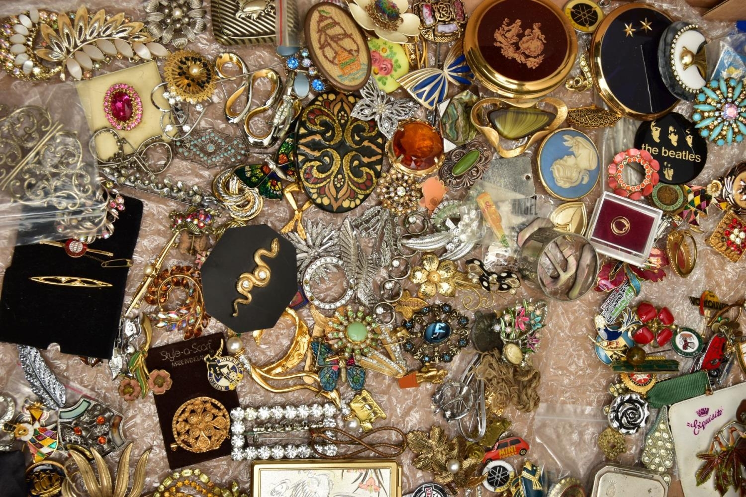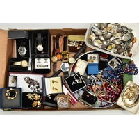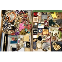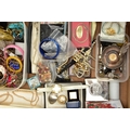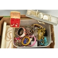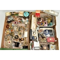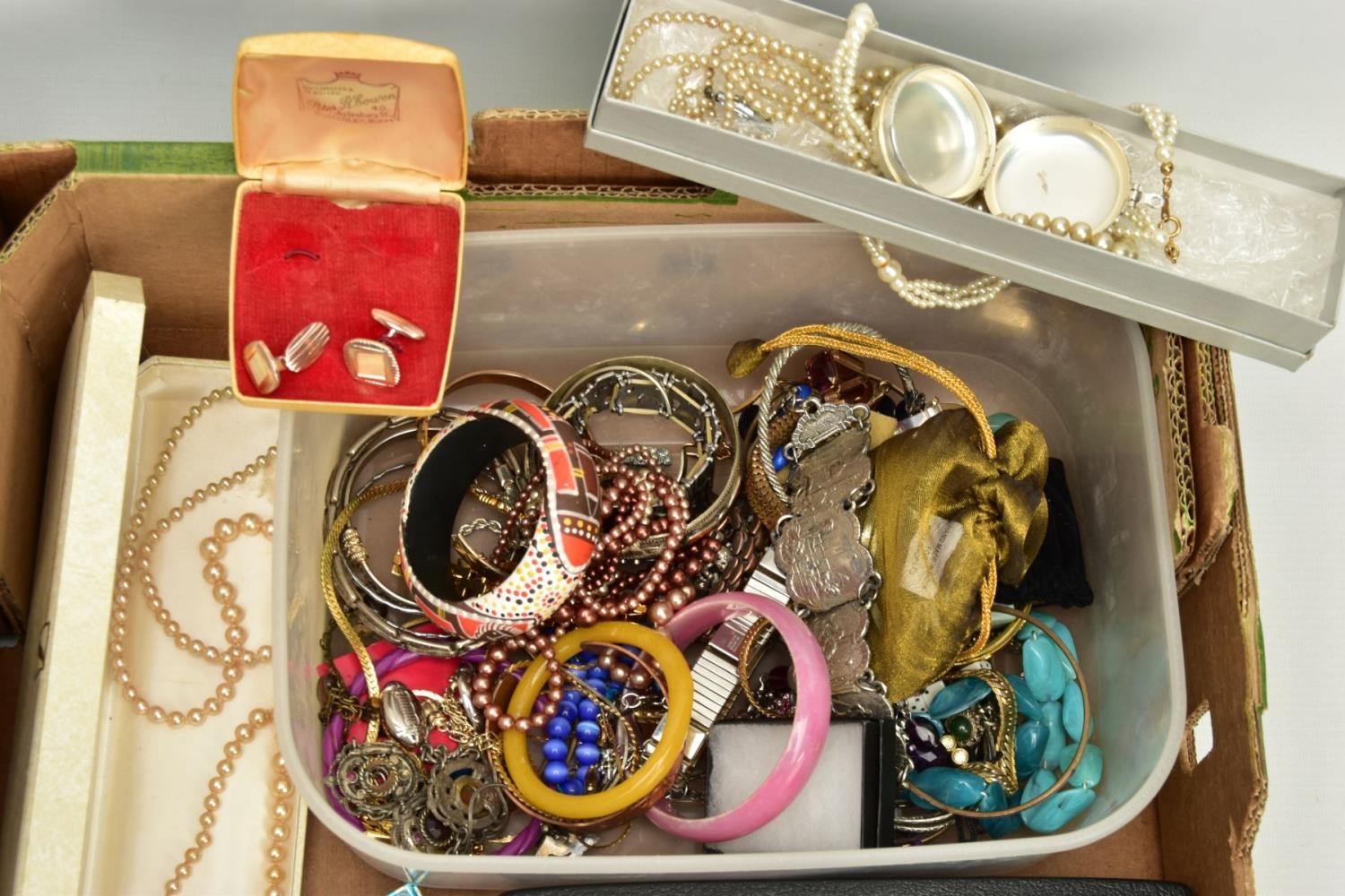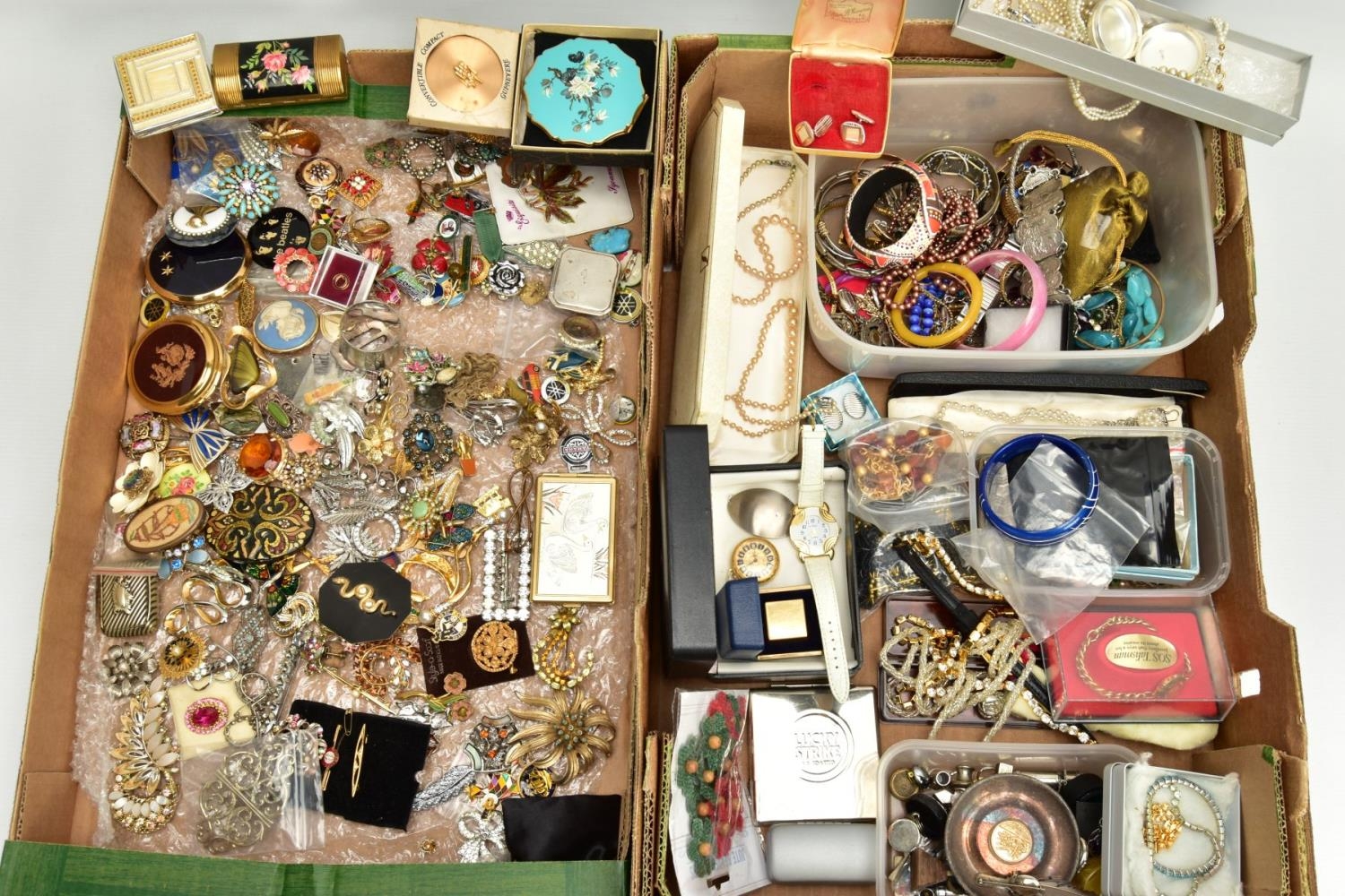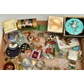 TWO BOXES OF ASSORTED COSTUME JEWELLERY, to include a Stratton compact, a nurses belt EPNS, brooches, compacts, hat pins, tie pins, imitation pearls, bangles, etc