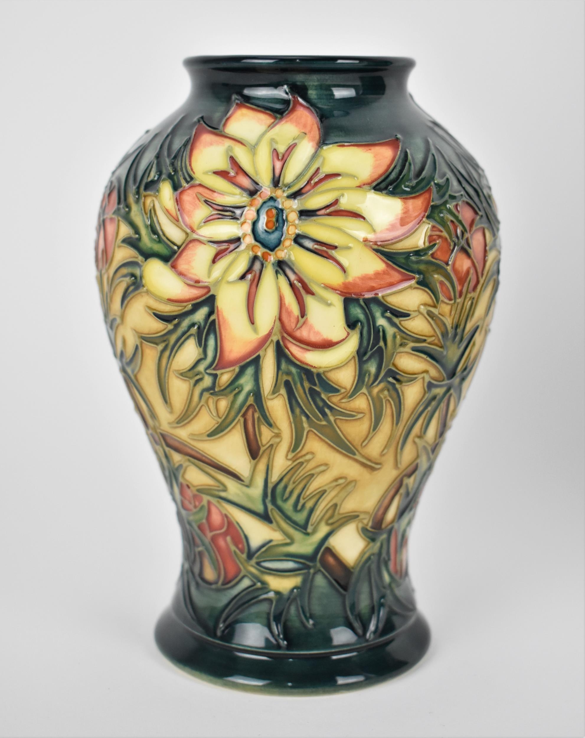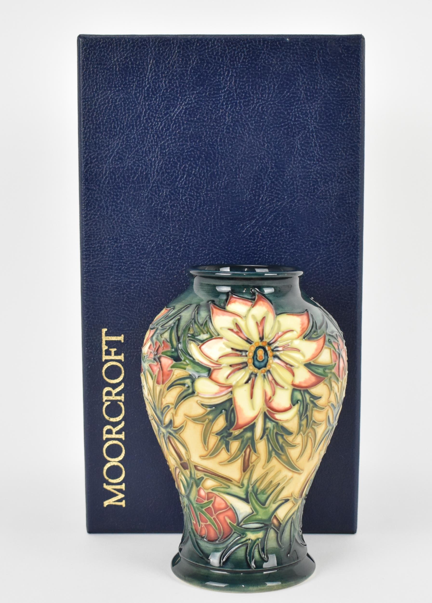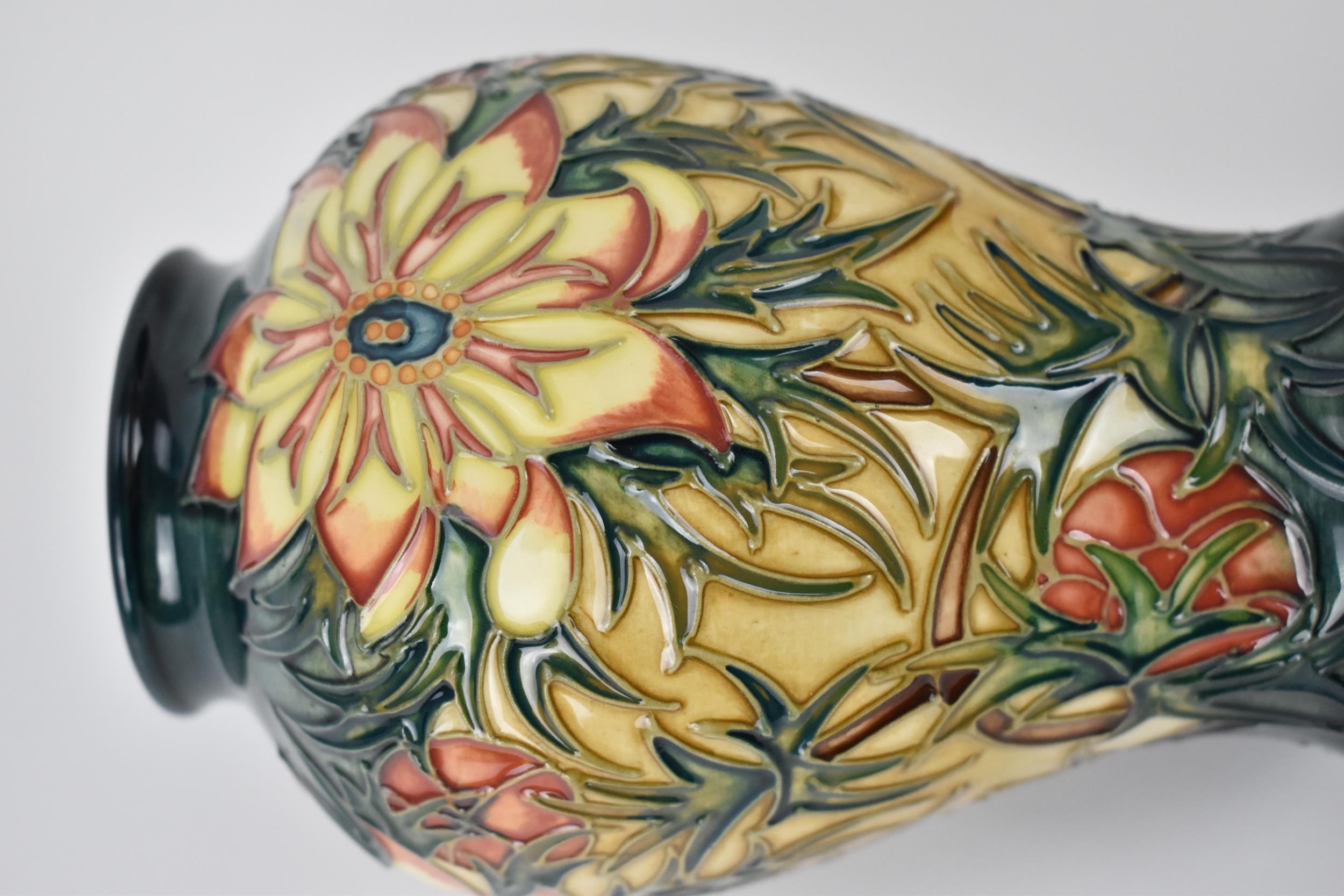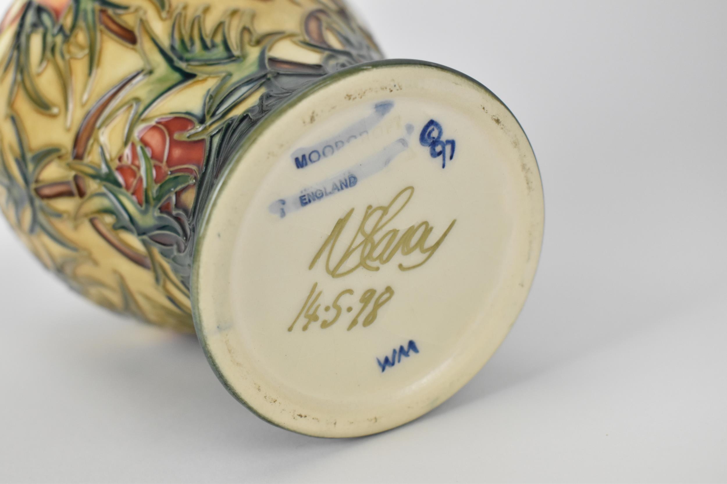A Moorcroft ceramic vase designed by Nicola Slaney in the 'Spike' pattern, of baluster form with tubelined floral decoration throughout, the undersigned signed in gold by Slaney and dated 14/5/98, 16.5 cm high