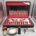 Canteen of silver plate cutlery, twelve place settings, silver plate shell shaped dish with glass liner, pair of silver plate fish sugar nips, etc.