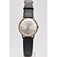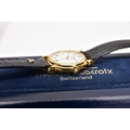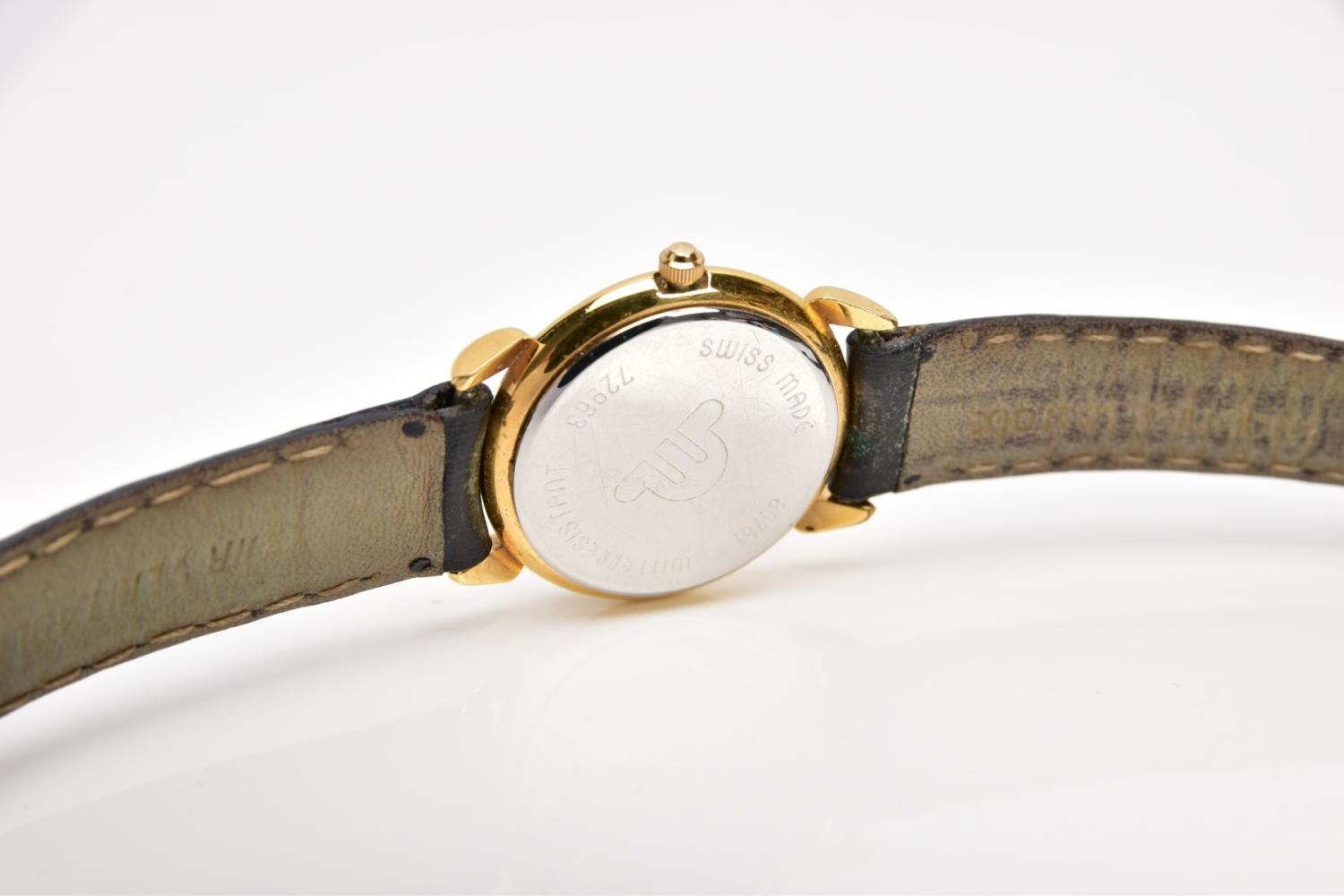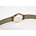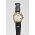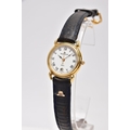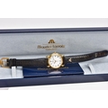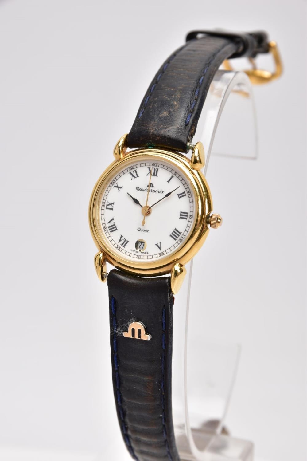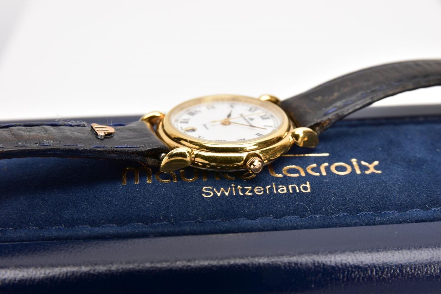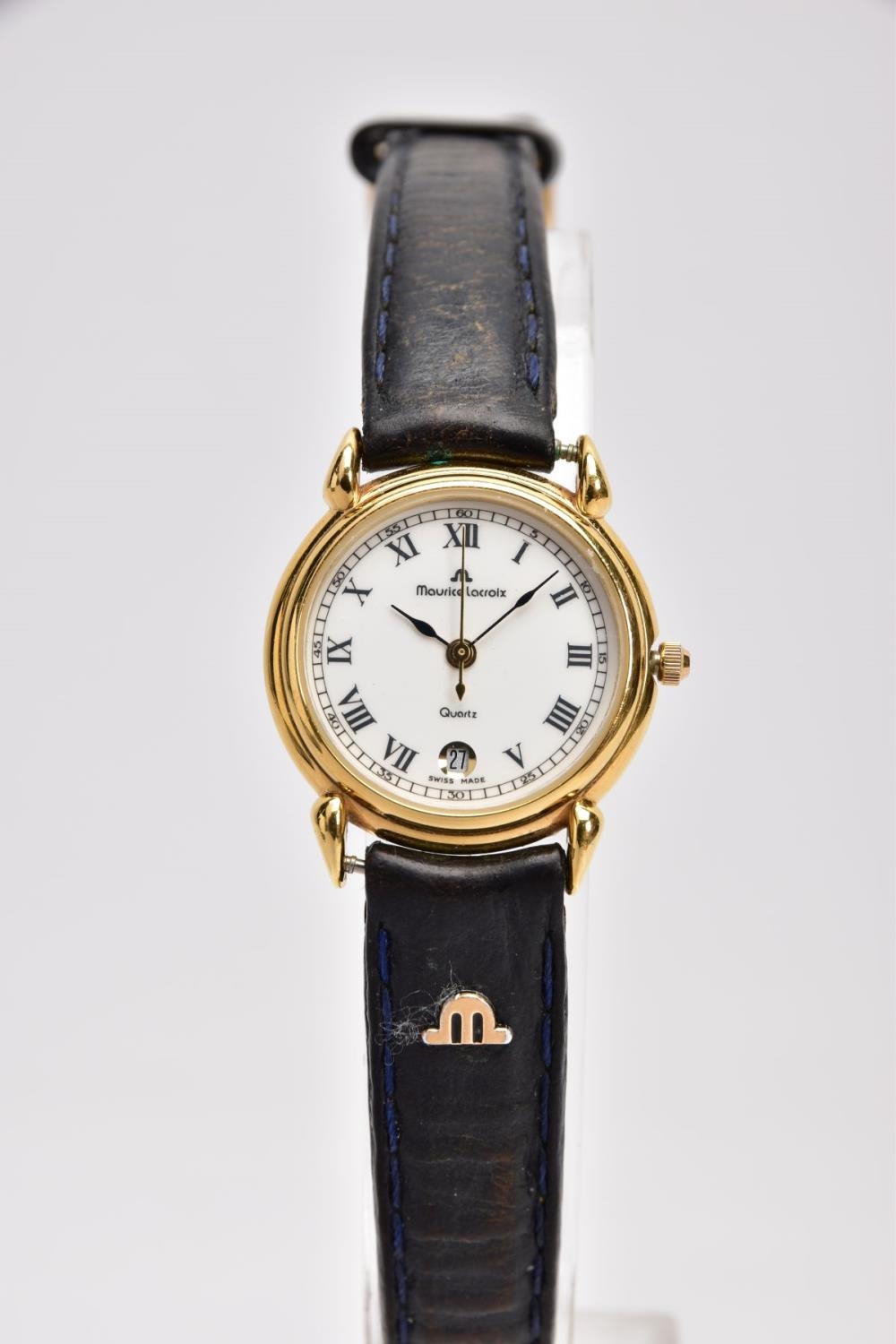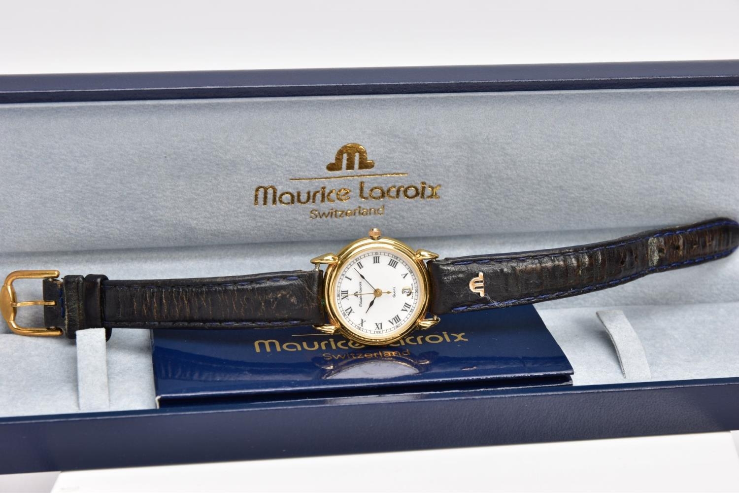 A LADIES 'MAURICE LACROIX' QUARTZ WRISTWATCH, round cream dial signed 'Maurice Lacroix, quartz', Roman numerals, date window at the six o'clock position, black and gold hands, within a gold tone case, case back signed 'Swiss made, 80781, 72968', approximate case width 20.5mm, fitted with a black original Maurice Lacroix signed strap with a yellow metal ardillon buckle, together with an original 'Maurice Lacroix' fitted case (condition report: general light, watch winds, sets and runs, wear to the strap, overall condition good)