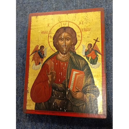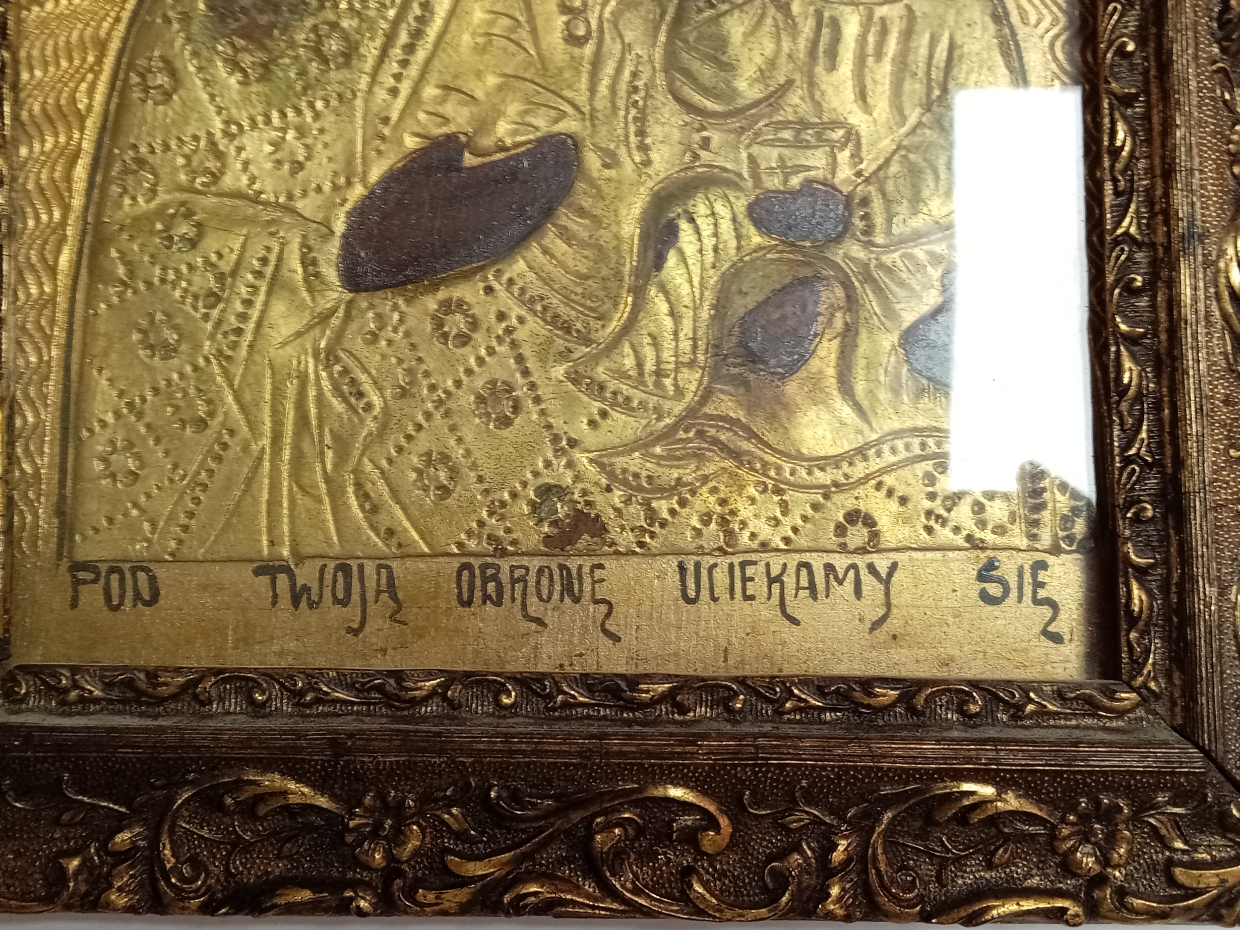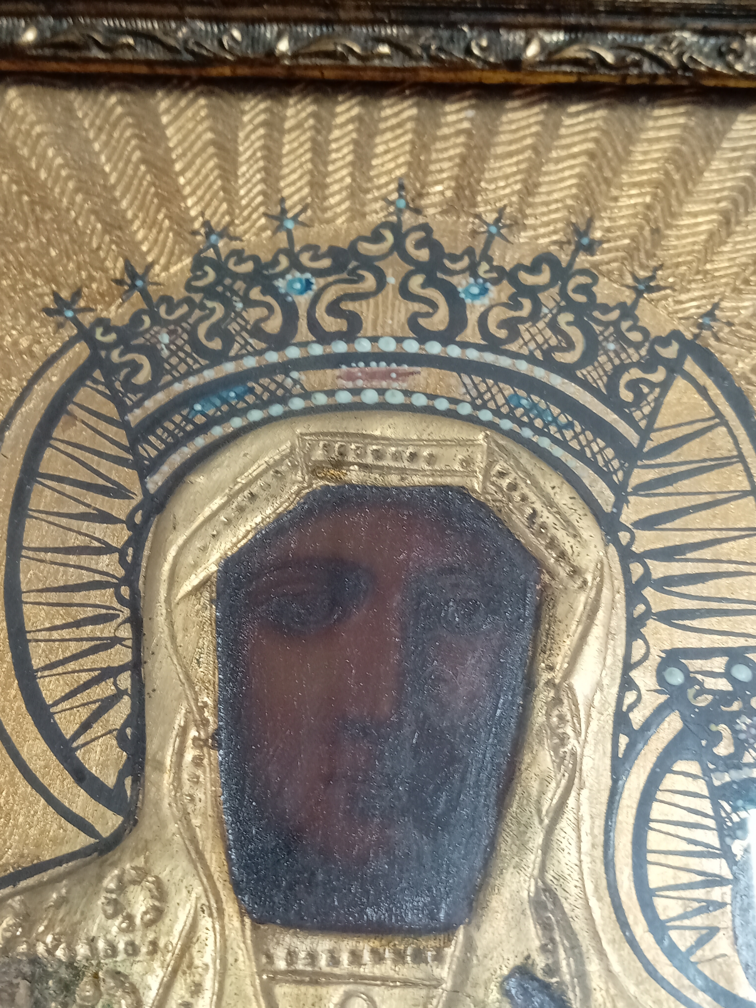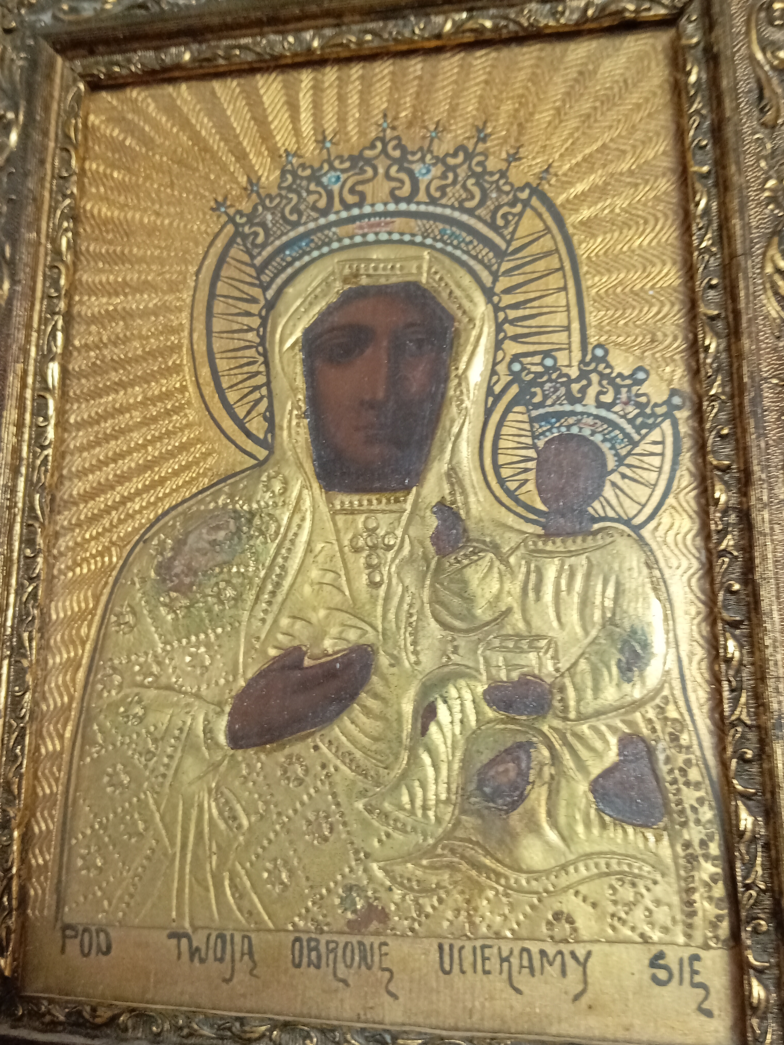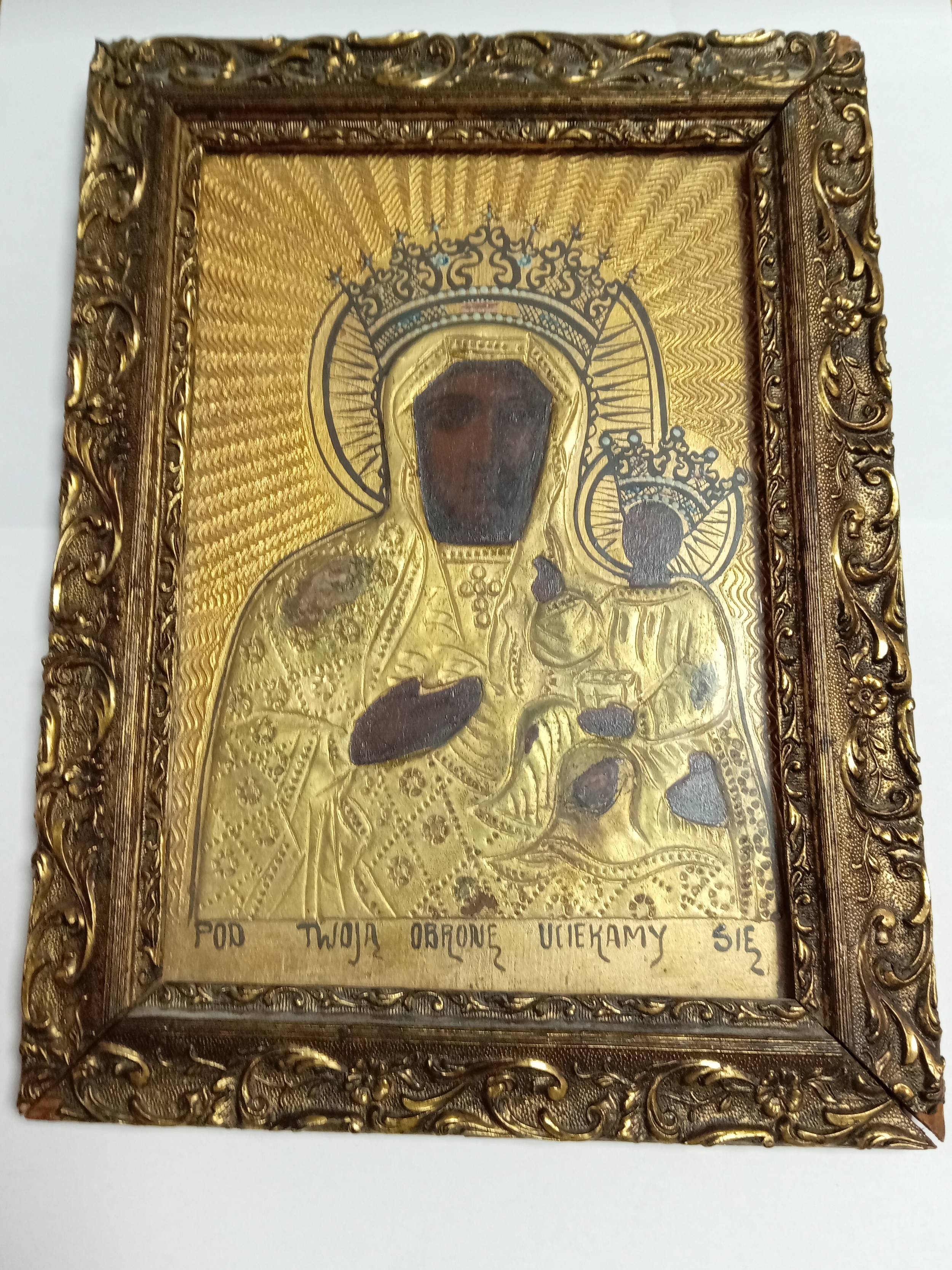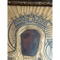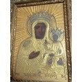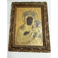 An antique handpainted religious icon of The Black Madonna of Czestochowa Poland in a gold gilt frame. H 30.5cm x W 23cm