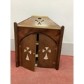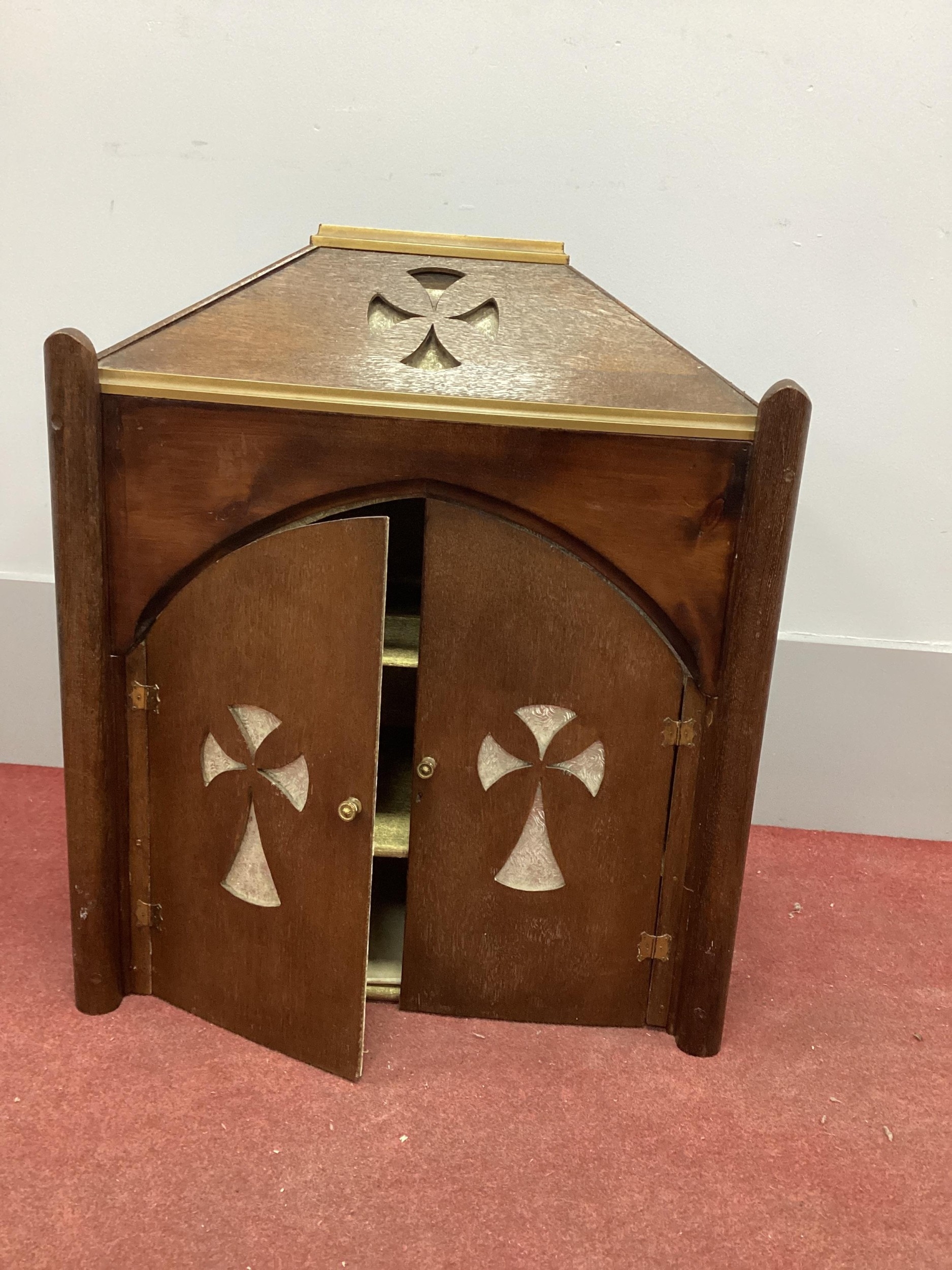 A Gothic Style Oak Cabinet, the pediment with pierced decoration, arched doors similarly decorated, two internal shelves, 57cm wide.