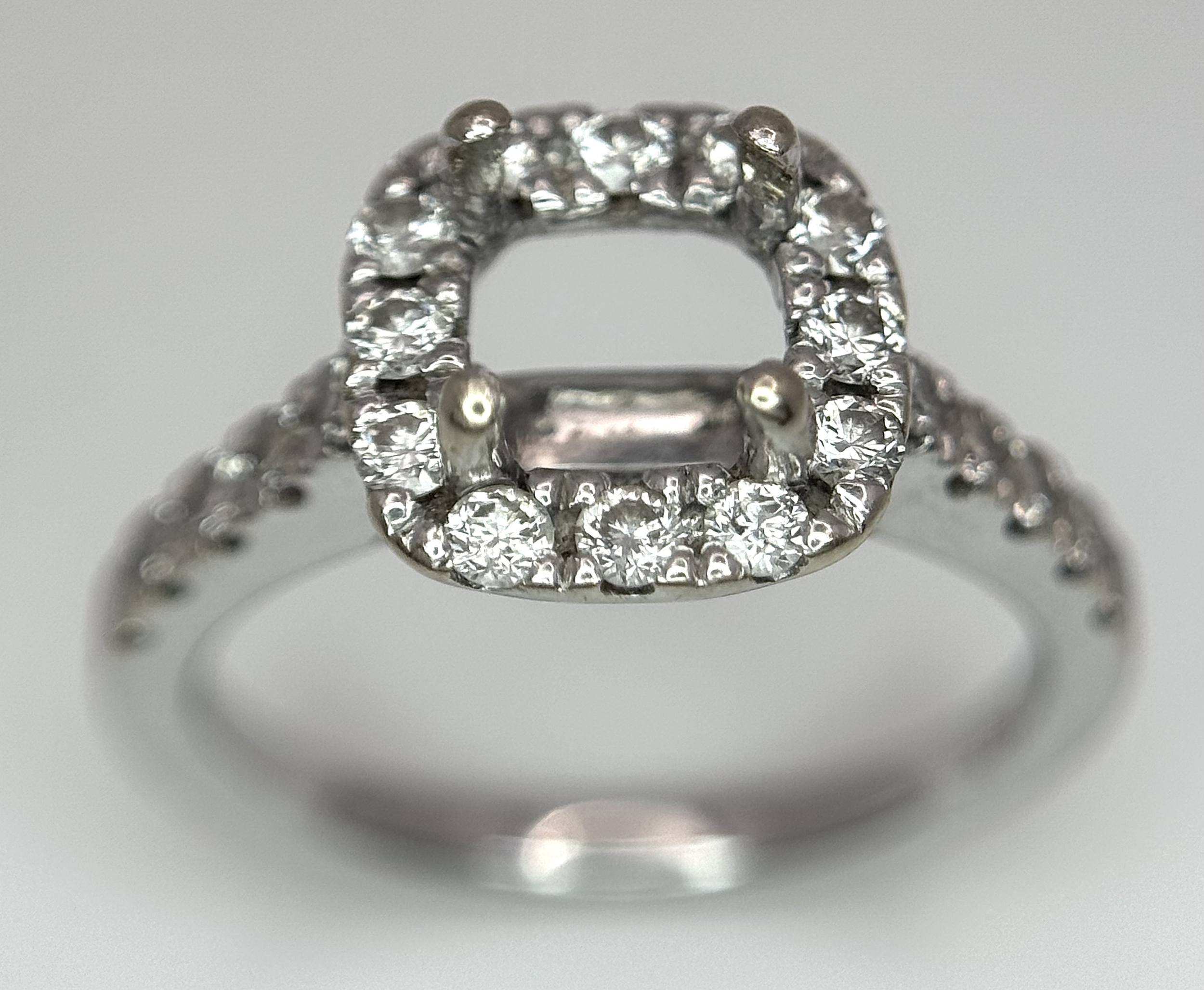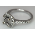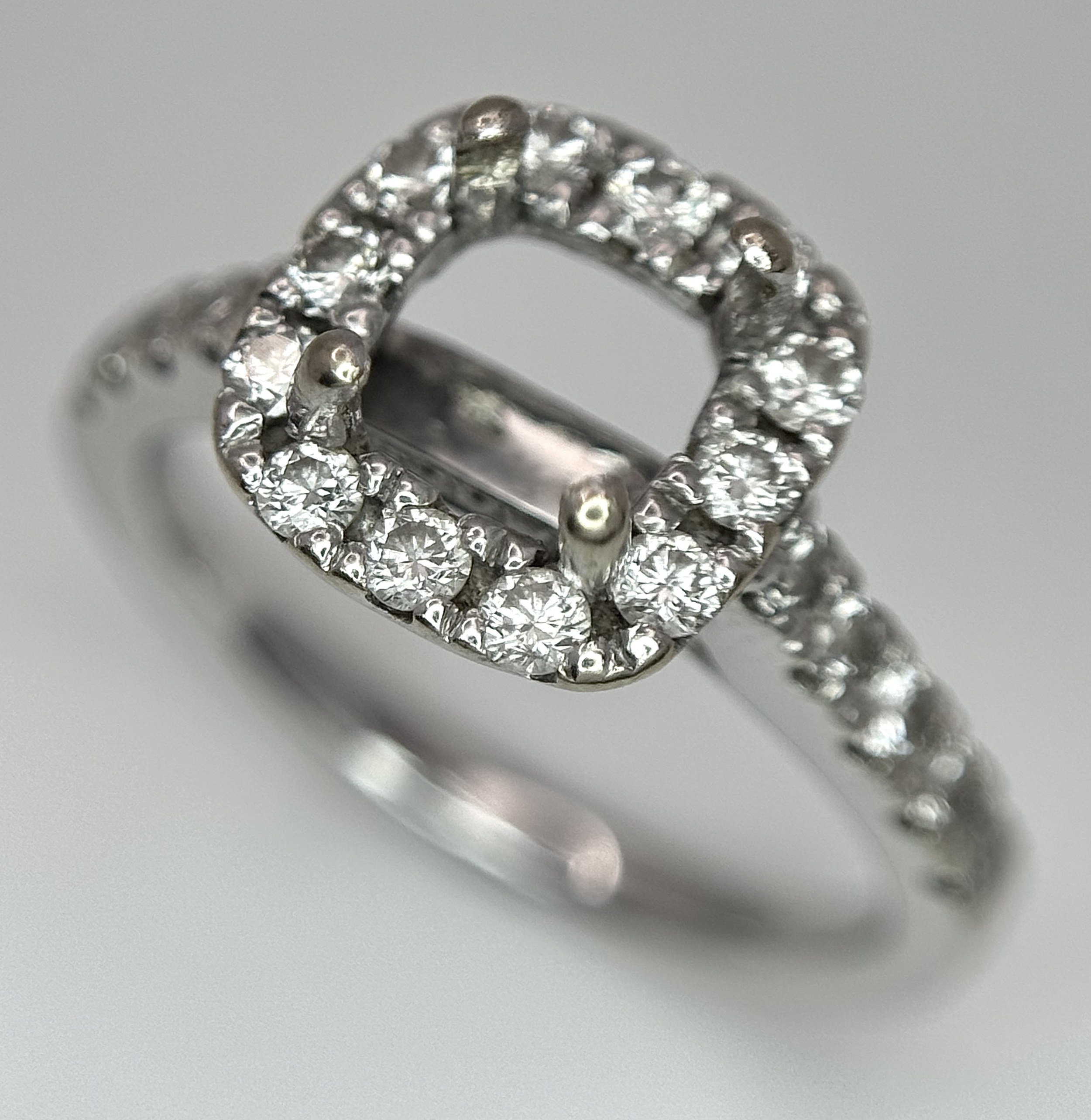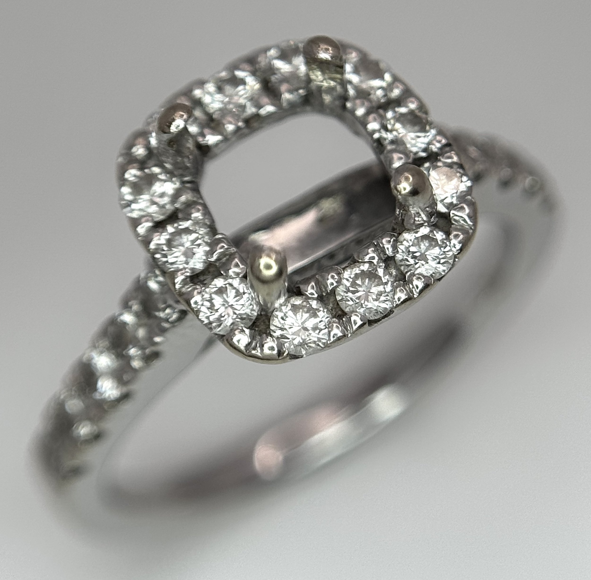 An 18K WHITE GOLD DIAMOND SET HALO RING MOUNT 4.2G SIZE L WILL HOLD A 0.85CT STONE APPROX . Ref: SC 7062